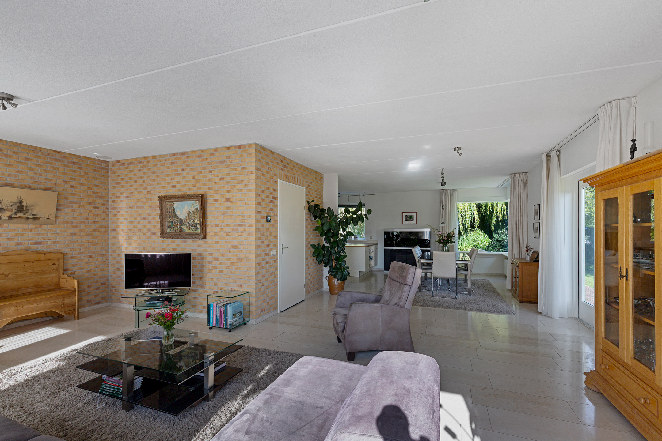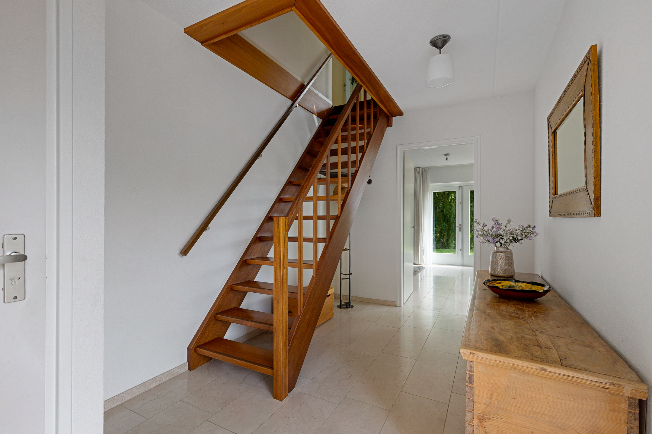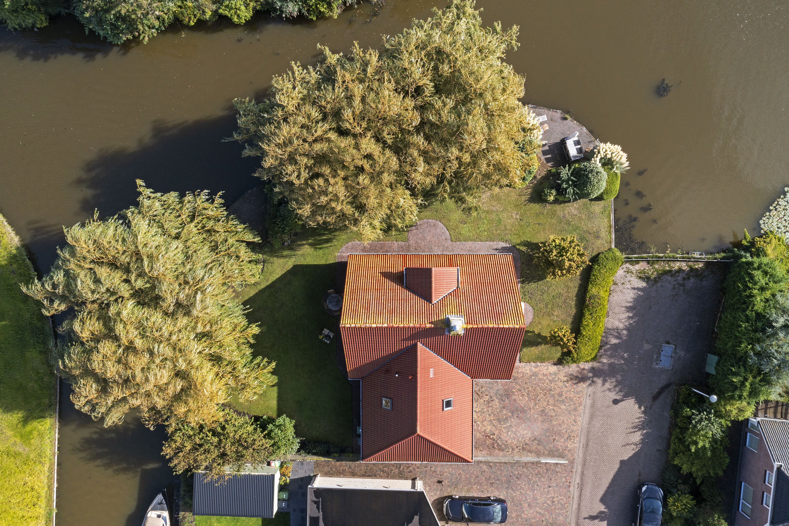 The beautifully landscaped garden with mature trees, shrubs, borders, and terraces ensures privacy and offers both sunny and shaded spots throughout the day. A sunken south-east facing terrace directly on the water, complete with a private swimming ladder, is the perfect place to enjoy your morning coffee or relax all day while watching boats pass by. The waterway is a branch of the famous *Bolswardervaart*, part of the historic Eleven Cities Route, and is accessible by boat.