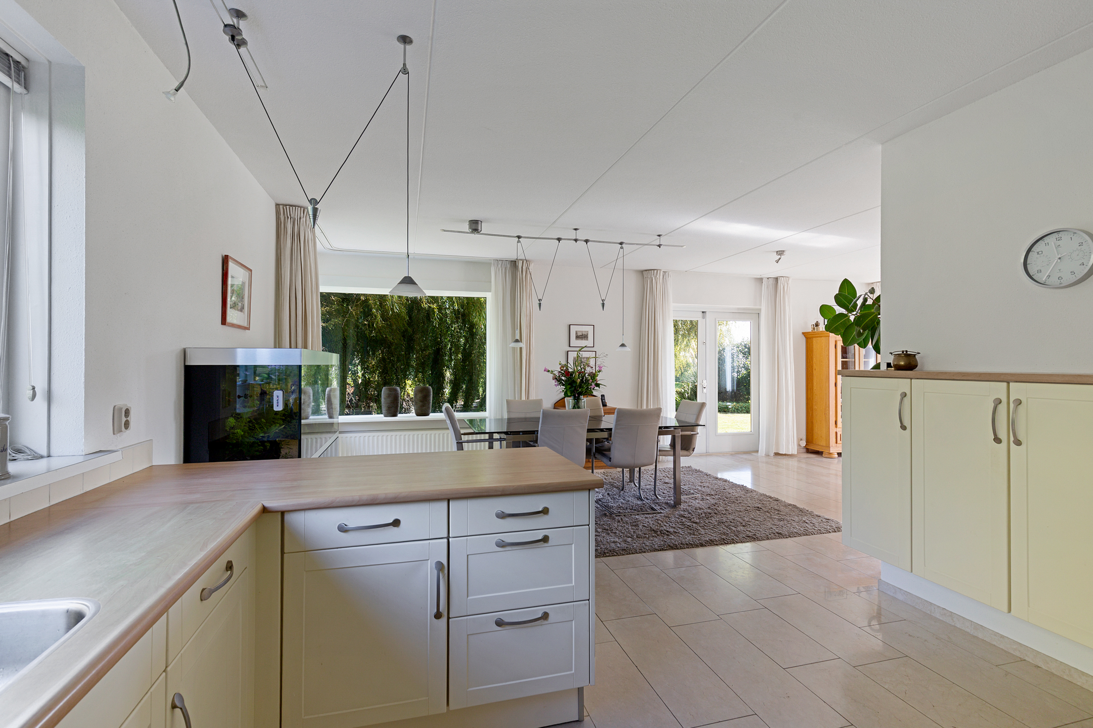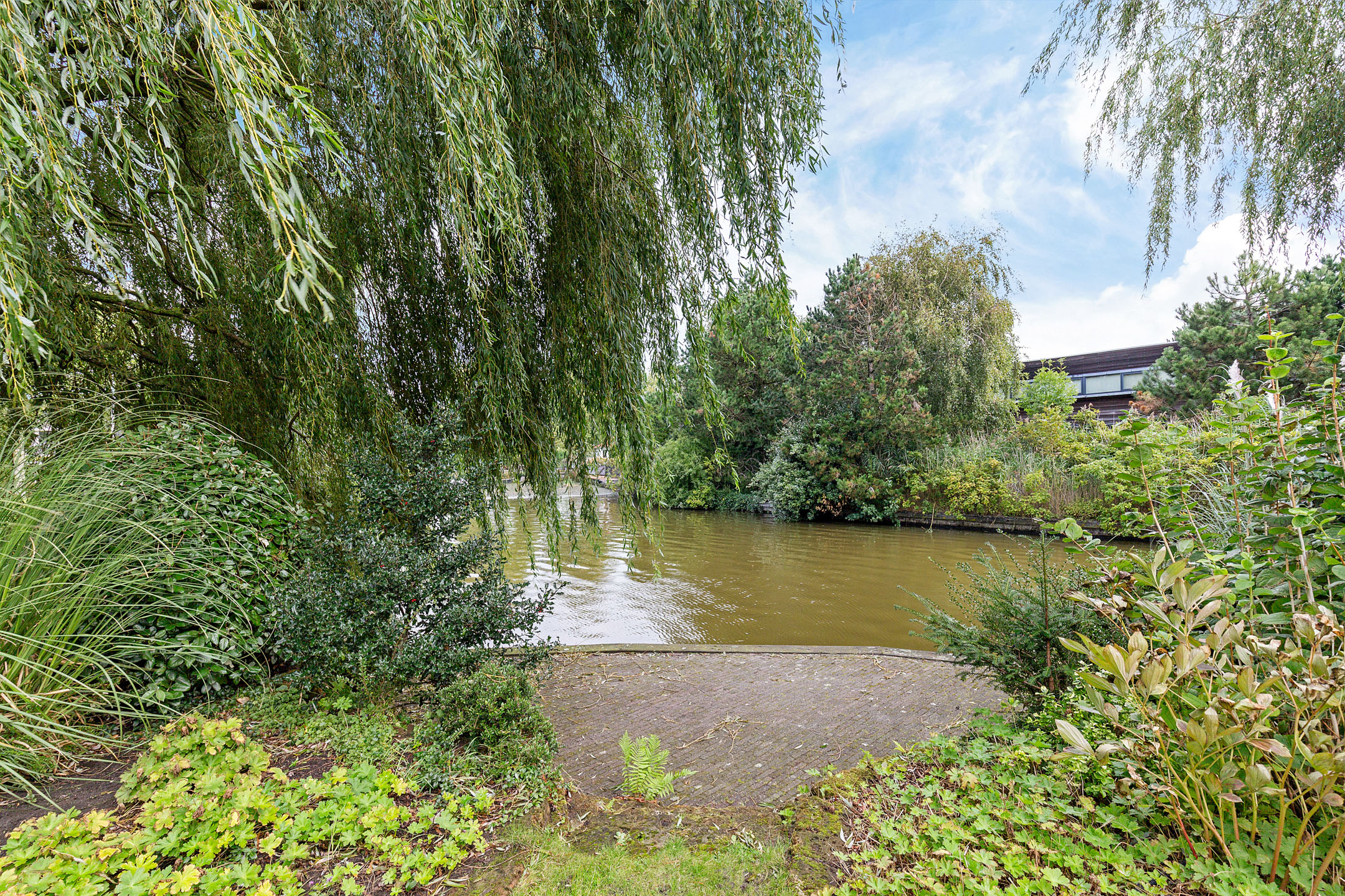From the living room, the eye is immediately drawn to the sweeping water views and the landscaped garden. The abundance of windows floods the room with natural light, while the stately weeping willows along the water’s edge ensure privacy. The house sits on a corner plot at the end of a cul-de-sac, enhancing the sense of space and tranquillity.