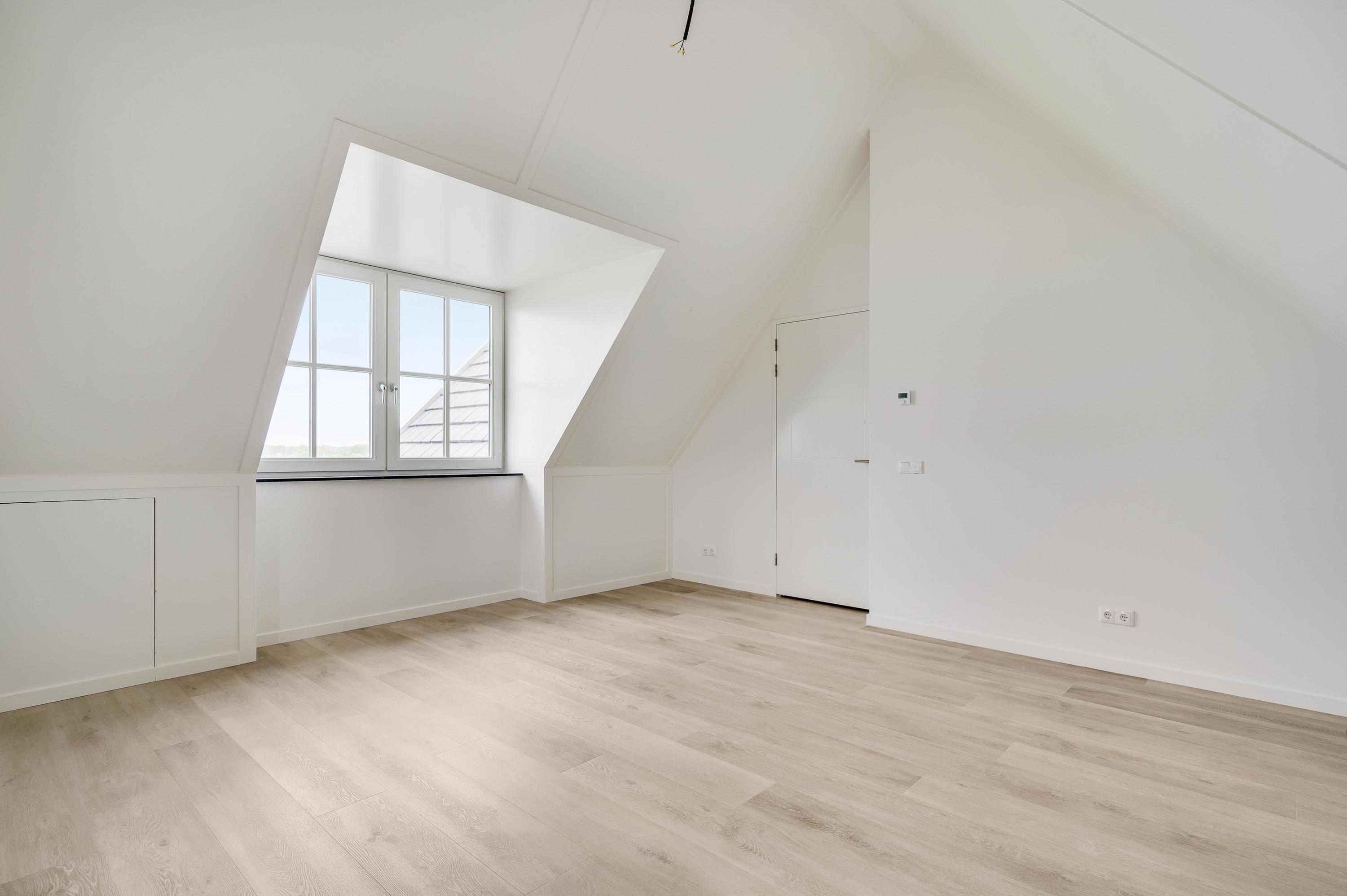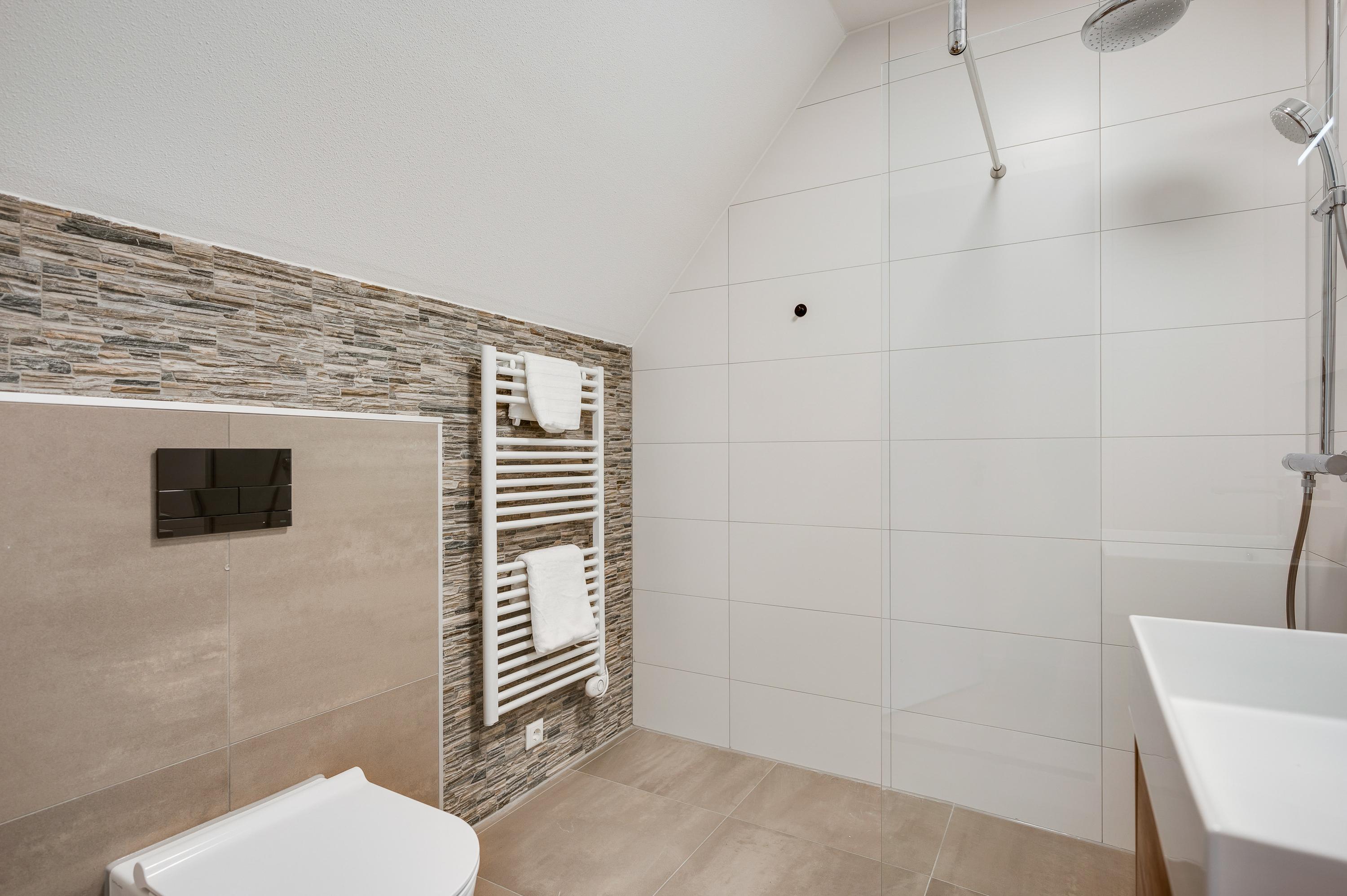On the L-shaped second floor with high ceilings and a dormer window you will find bedroom 3 and 4. Both rooms are spacious and overlook the water. The third bathroom is also located here, which has a walk-in shower, sink and toilet. Finally, you will find the technical room here, where you will also find white goods connections.