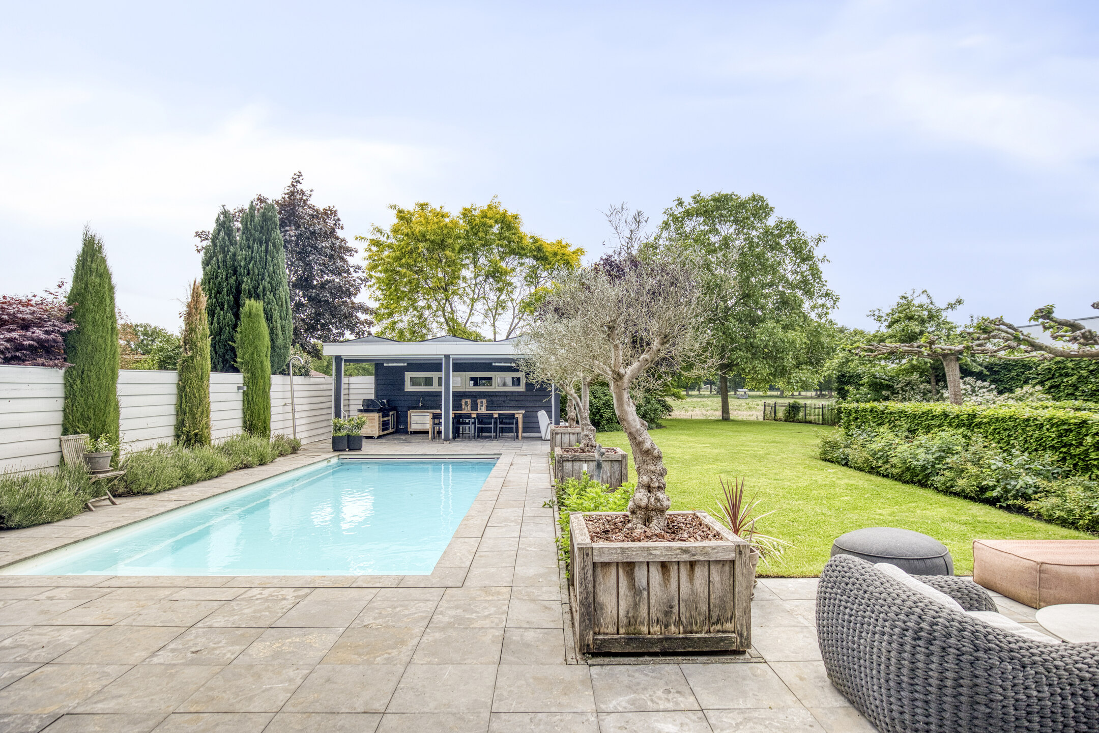 Aangelegde tuin rondom, zonnige gesitueerd op het zuiden, terras bestraat met natuurstenen sierbestrating en voorzien van borders, gazon, grindterras, elektra, tuinverlichting, buitenkraan, zwembad met elektrisch dek, buitendouche, een zonnescherm t.p.v. woonkamer en een poolhouse (vv. vloerverwarming) met aansluitend een veranda vv. buitenkeuken, lichtspots en zonne-screens;