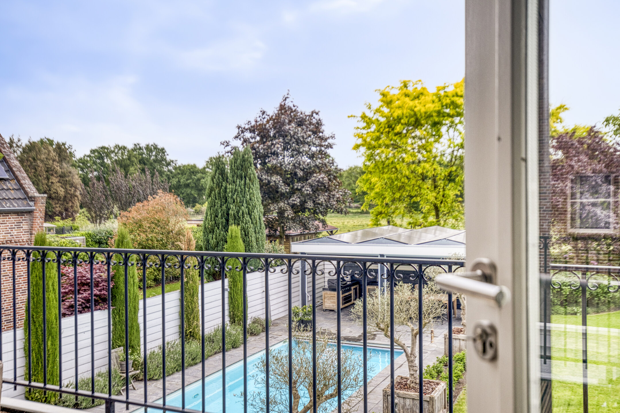 Upstairs, five bedrooms offer space and privacy, including a master with a private balcony, walk-in closet, luxury bathroom, sauna, and generous natural light. A second bathroom and separate storage area support flexibility for family or guest use. Multiple terraces provide the choice of sun or shade throughout the day, and sweeping views over adjoining meadows bring a tranquil backdrop. The landscaped garden features a heated swimming pool and poolhouse with veranda, equipped with automated systems for seamless enjoyment. Sustainability features include 24 solar panels, comprehensive insulation, HR central heating, and complete underfloor heating. This detached villa Huijbergen is a rare opportunity to experience quiet, space, and sophisticated living in the sought-after surroundings of Huijbergen.