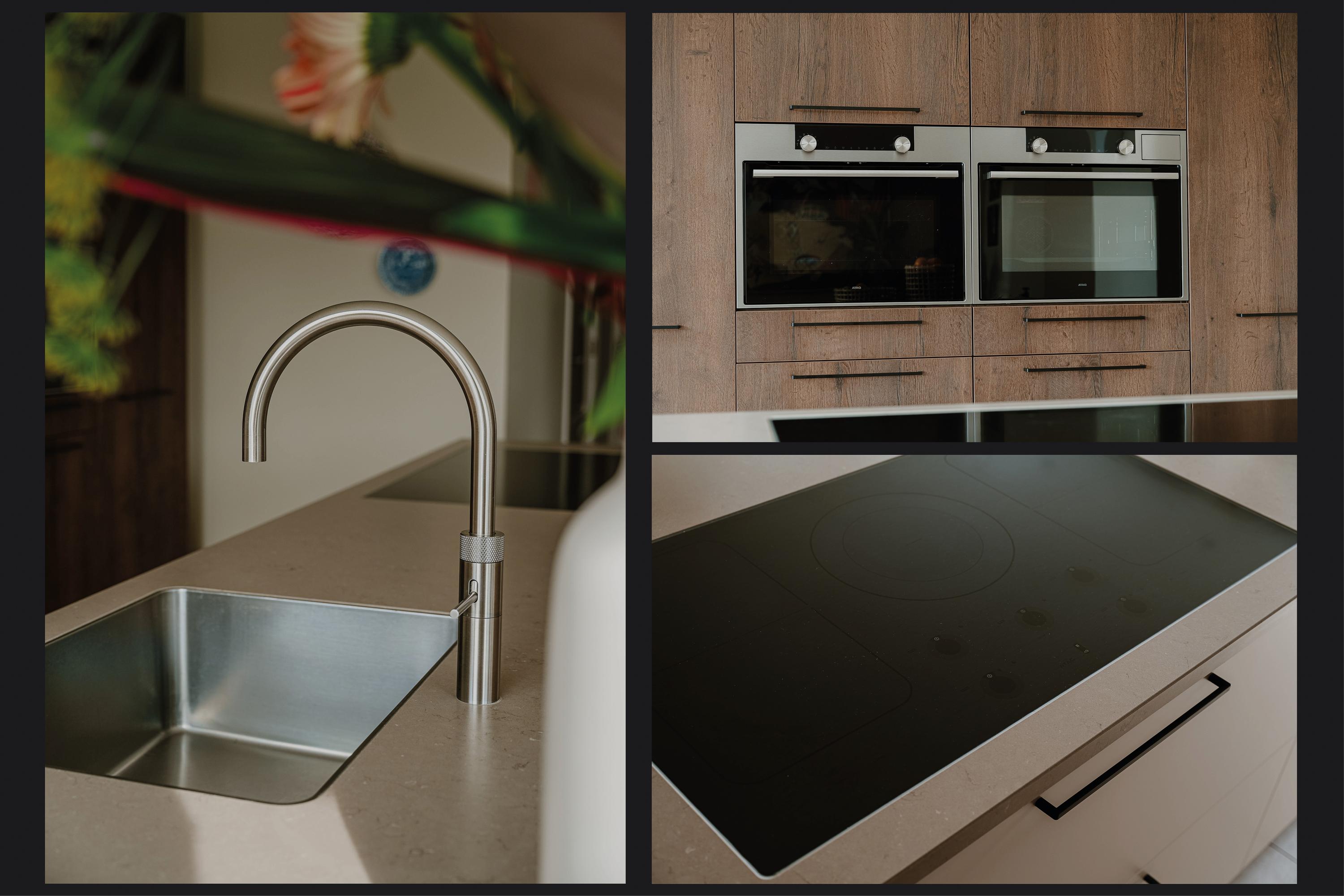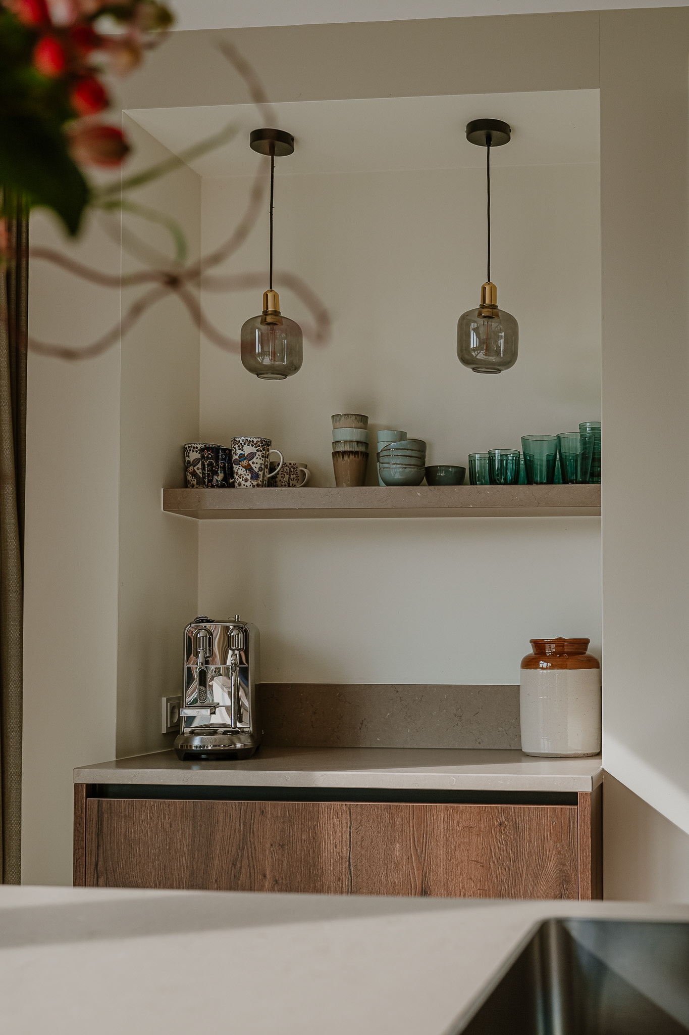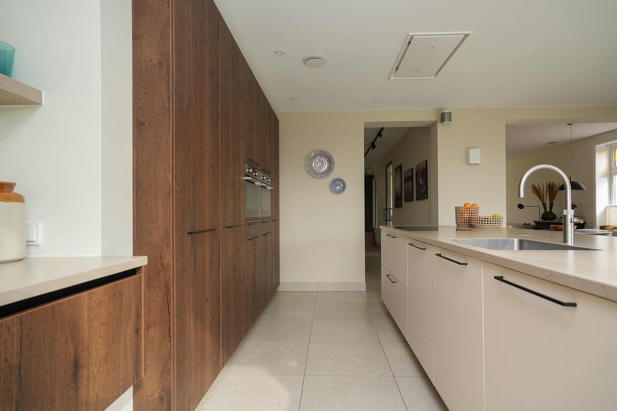 The cabinetry is partly integrated into the wall and fitted with high-quality built-in appliances, creating a calm and cohesive look. The coffee corner is a thoughtful and practical feature. There is ample workspace and storage, as well as plenty of room for a generous dining table.