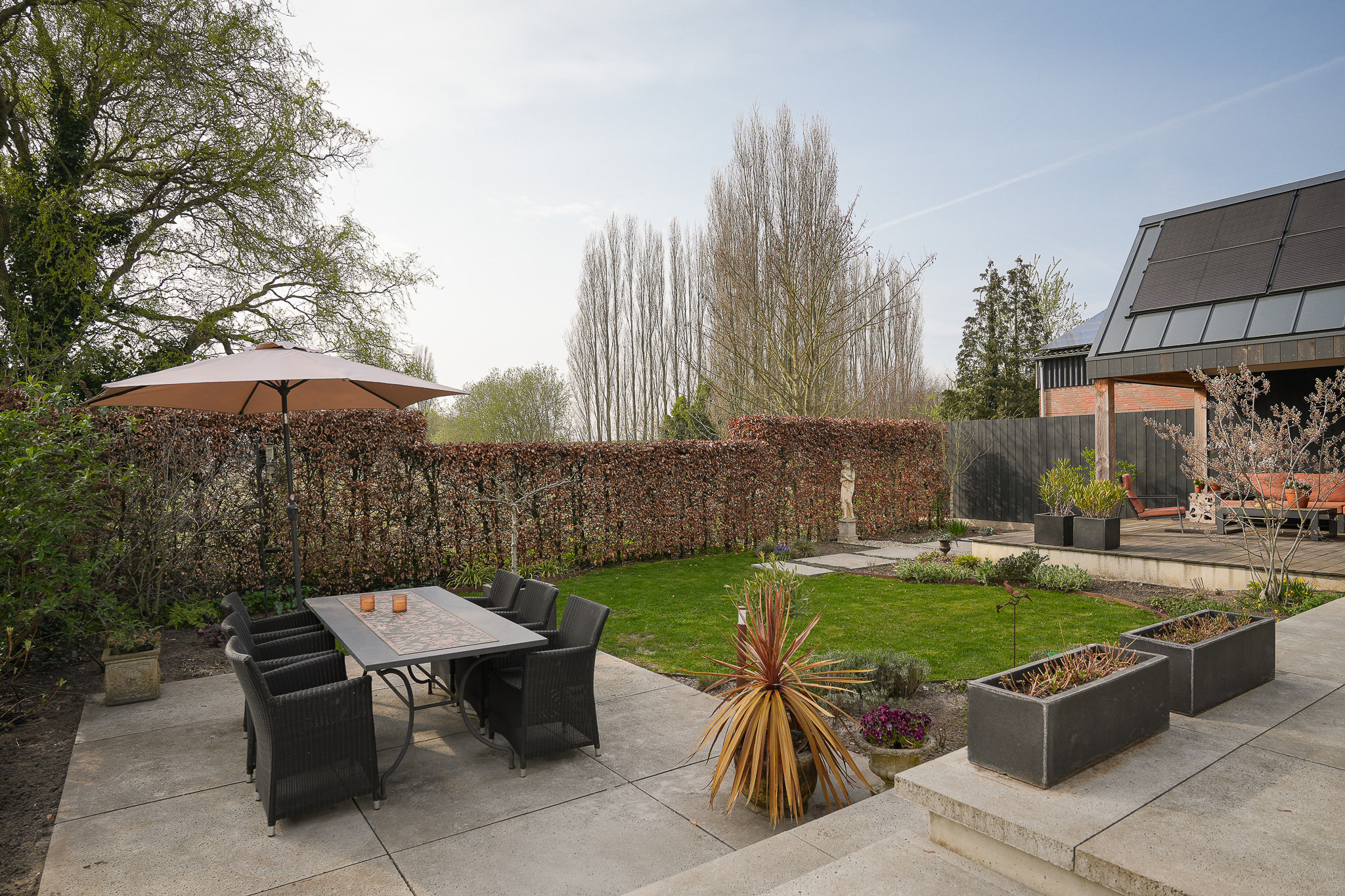 The architect-designed garden is west-facing, enjoying sunlight from early morning until late evening. It has been thoughtfully laid out with multiple terraces, planted borders and a pleasant balance between openness and privacy. Directly adjacent to the house is a sunny terrace, while further into the garden several areas have been created to enjoy sun or shade at any time of day.