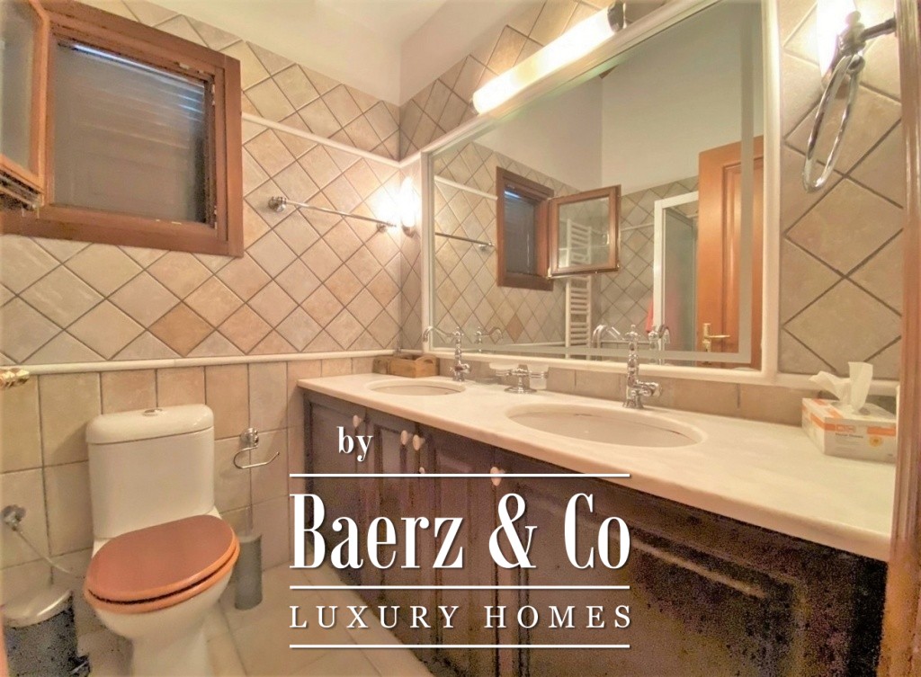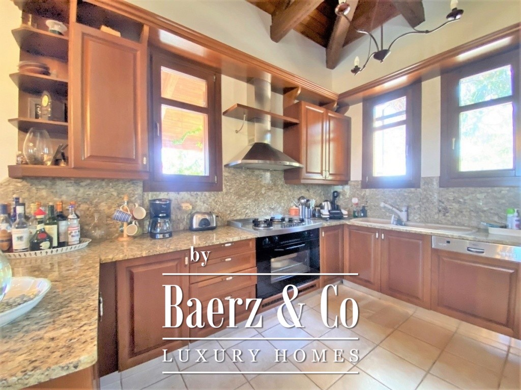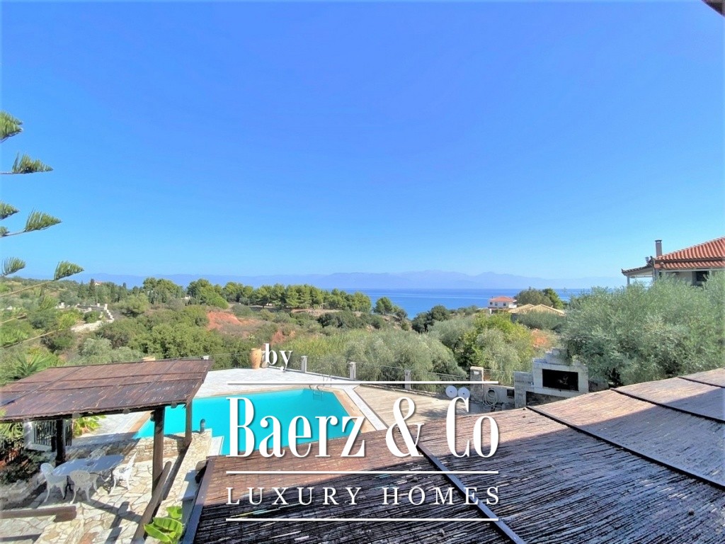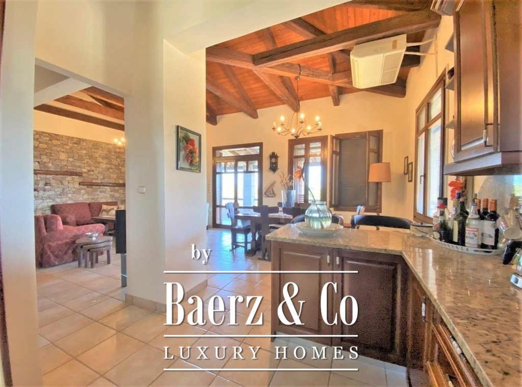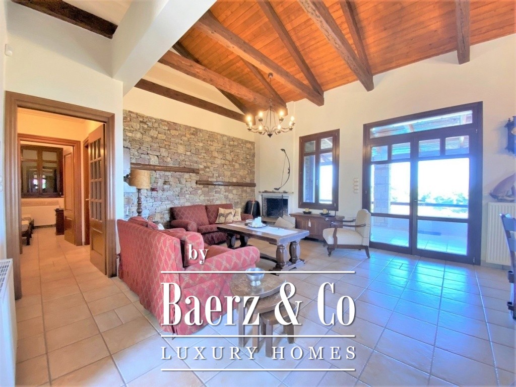 The property's lower level comprises two independent apartments, each offering open-plan living and kitchen areas alongside dedicated bedroom and bathroom spaces. Double-glazed windows, autonomous heating via liquid gas, and air conditioning ensure year-round comfort. Stone details, manicured gardens, and a pool with covered seating area create a setting equally suited for privacy or relaxed entertaining. Security alarms and thoughtful construction enhance peace of mind. Country house Kalamaki is designed for those seeking both permanent residence and an enduring holiday retreat, immersed in the natural beauty and amenities of the region.