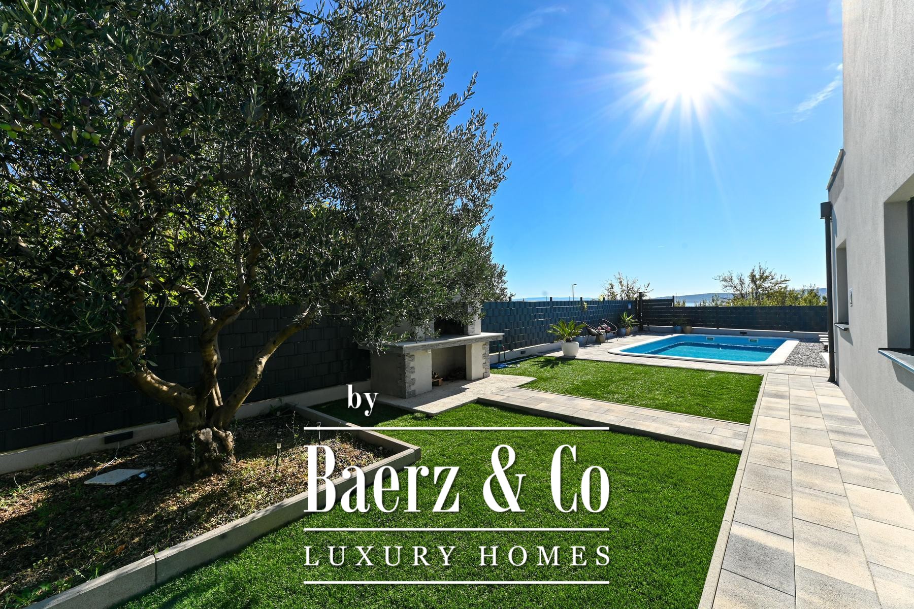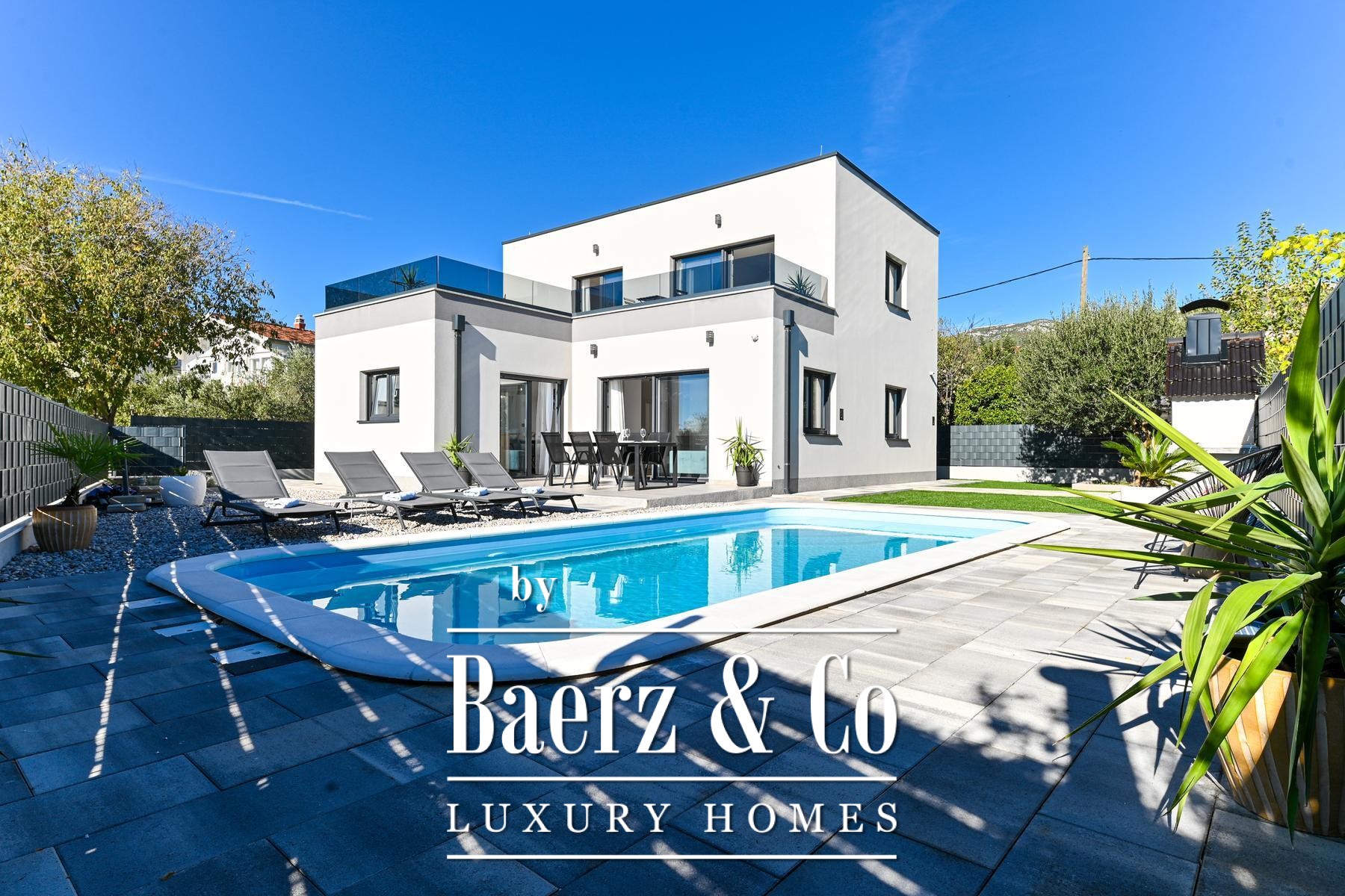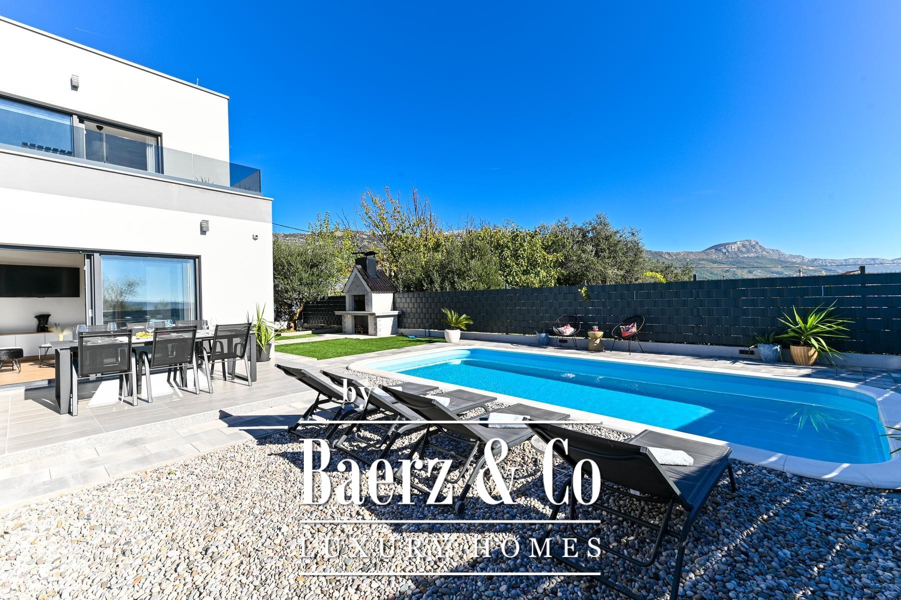 Outdoors, the fully fenced and landscaped garden features a serene swimming pool, sunbathing area, social space, and a barbecue, all designed for both privacy and convivial gatherings. The residence is situated in a desirable, accessible setting, with all necessary amenities conveniently nearby. This modern house Kaštela balances thoughtful architecture and refined outdoor living, enhancing everyday life by the Adriatic.