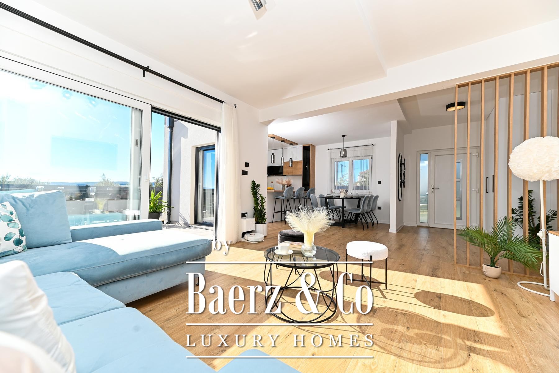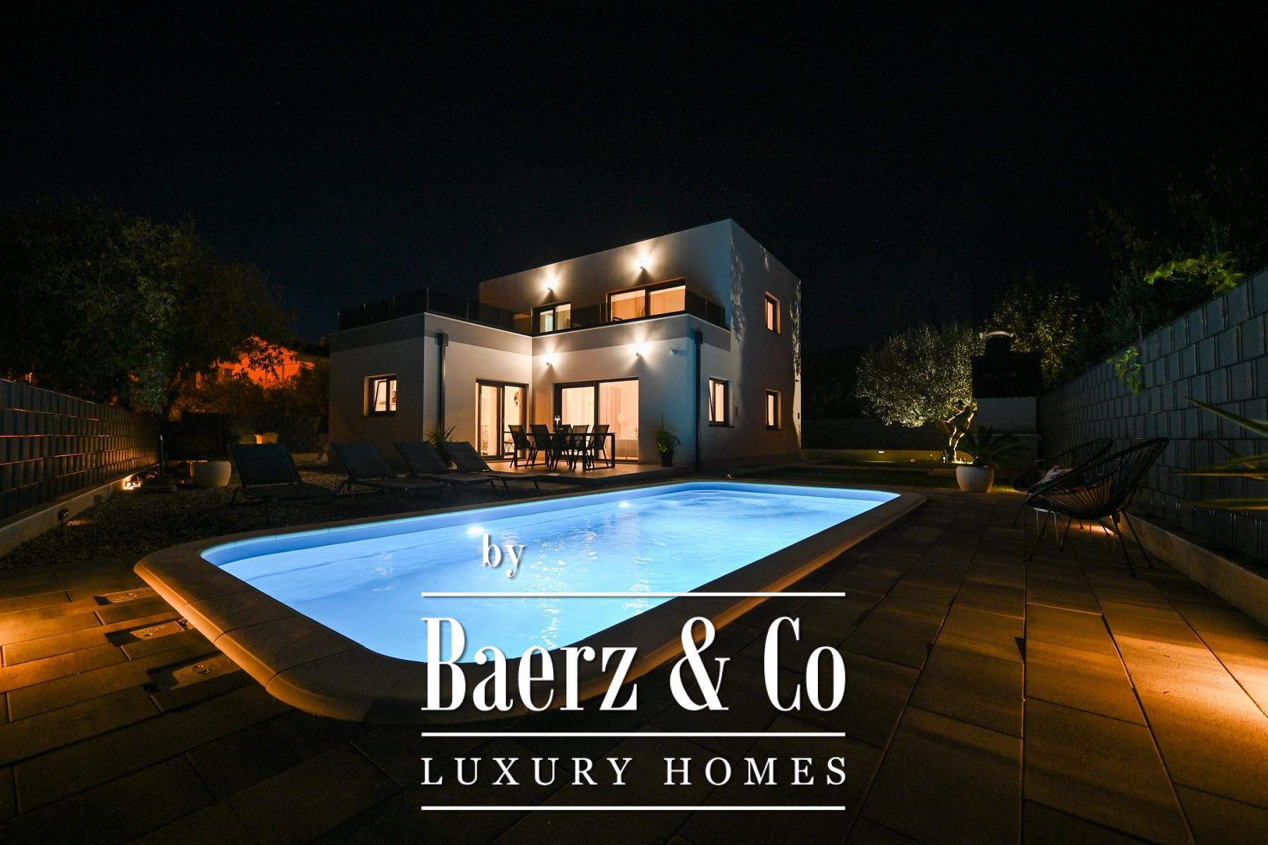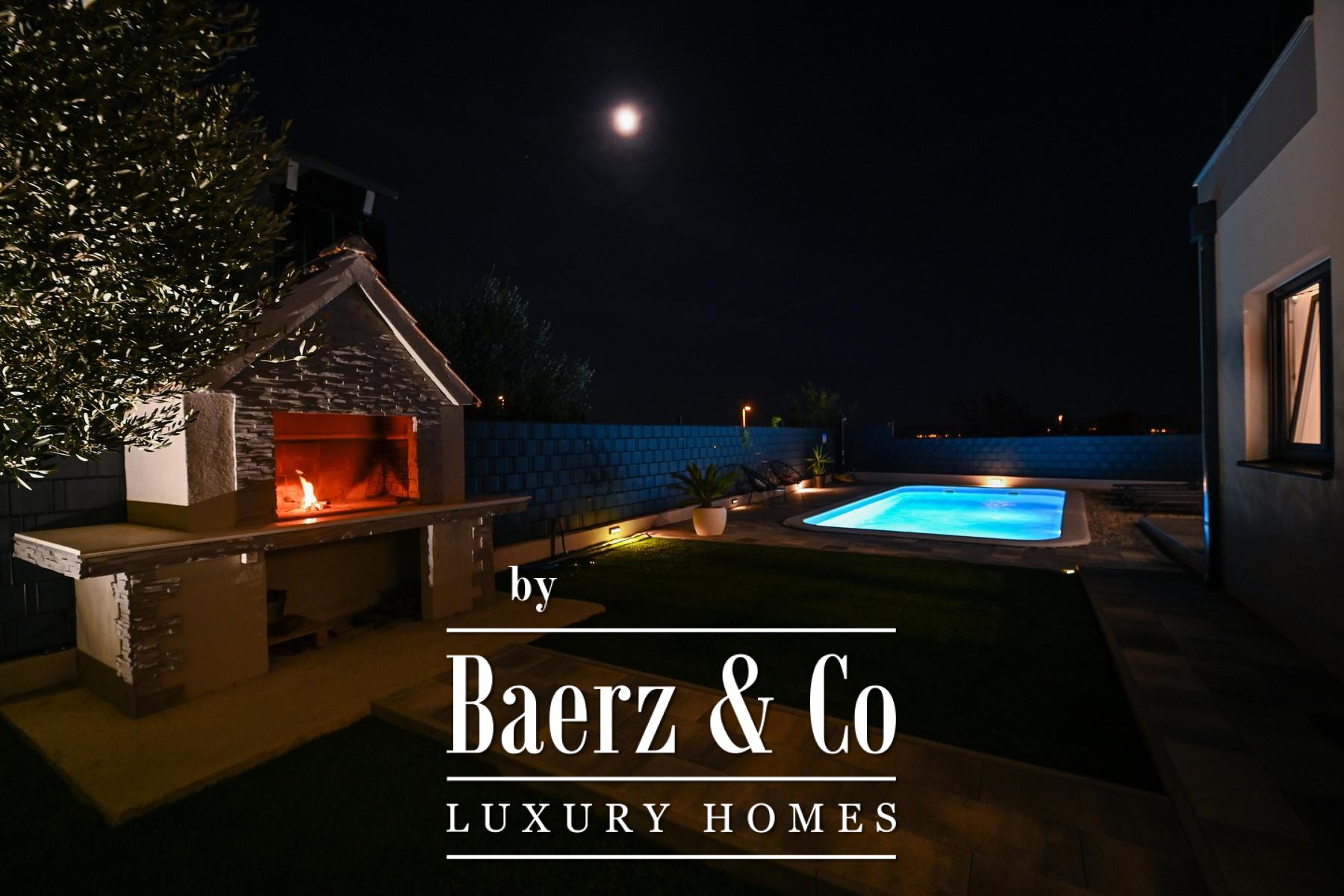 Outdoors, the fully fenced and landscaped garden features a serene swimming pool, sunbathing area, social space, and a barbecue, all designed for both privacy and convivial gatherings. The residence is situated in a desirable, accessible setting, with all necessary amenities conveniently nearby. This modern house Kaštela balances thoughtful architecture and refined outdoor living, enhancing everyday life by the Adriatic.