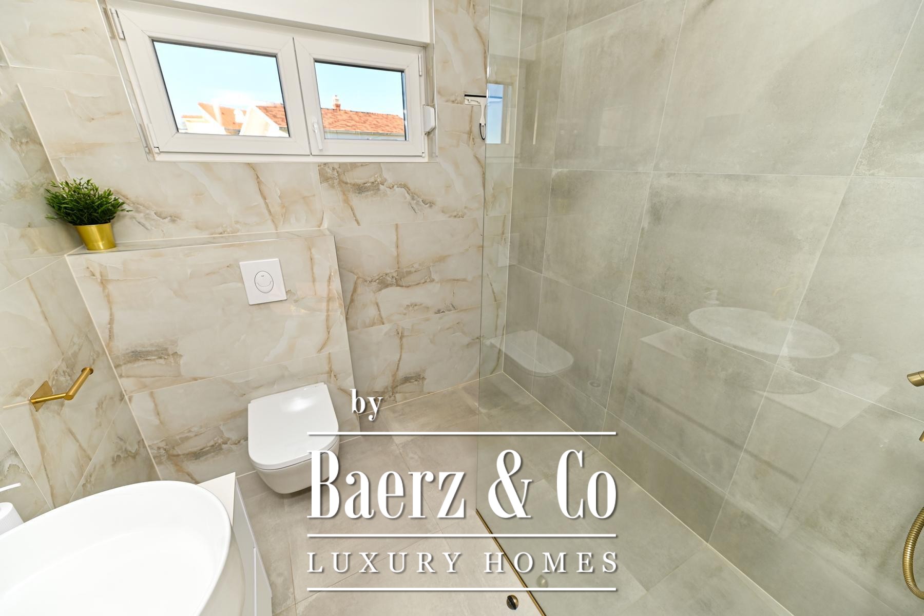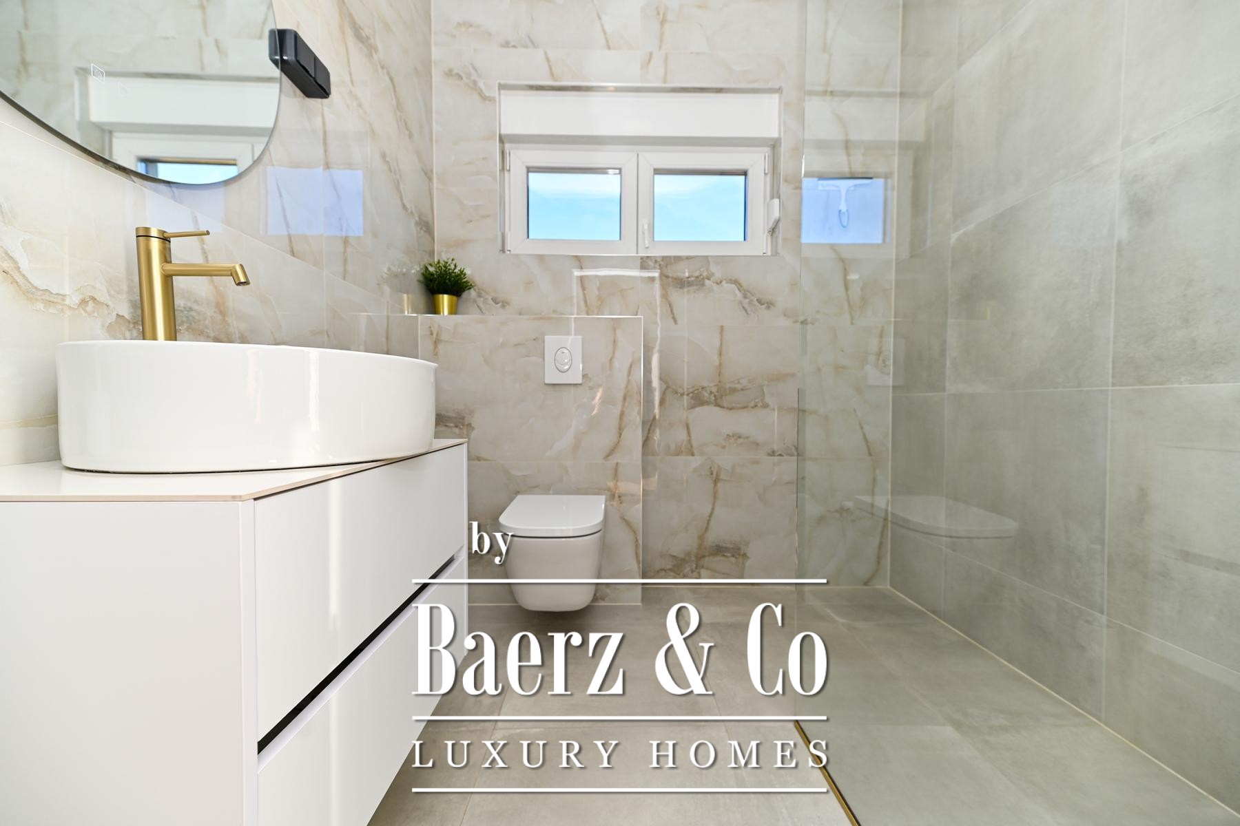 Modern house Kaštela offers an elevated standard of living in Croatia. Set on a 490 m² plot and crafted in 2025, this contemporary home encompasses 160 m² distributed elegantly across two floors. The ground level reveals a fully equipped kitchen with dining area, an open living room, laundry room, guest toilet, and a bedroom with private bathroom. Ascend to the first floor and find two additional bedrooms, each with an en suite bathroom, and access to a spacious terrace with a panoramic sea view—an ideal escape at any time of day.