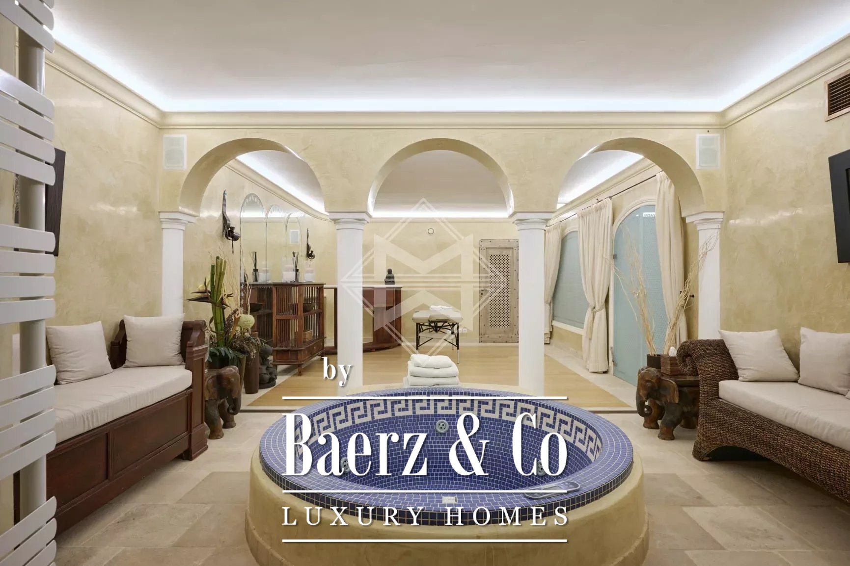 Upstairs, there are three additional bedrooms with two bathrooms, two balconies and a terrace, while the garden level is fully dedicated to leisure and wellness, featuring a home cinema, a spa with jacuzzi, sauna, hammam and shower, a music room, a wine cellar, a cigar cellar and an independent guest apartment.