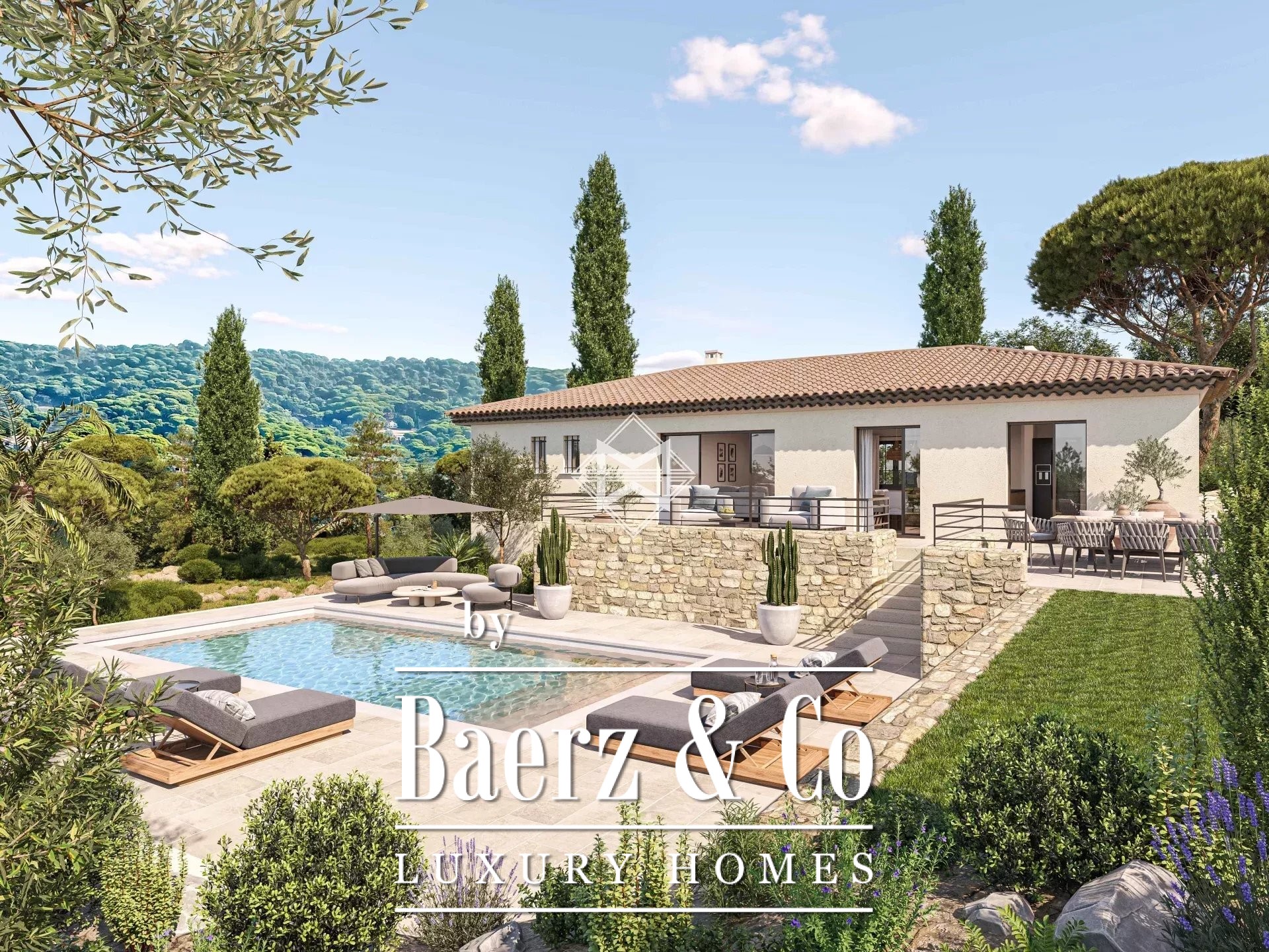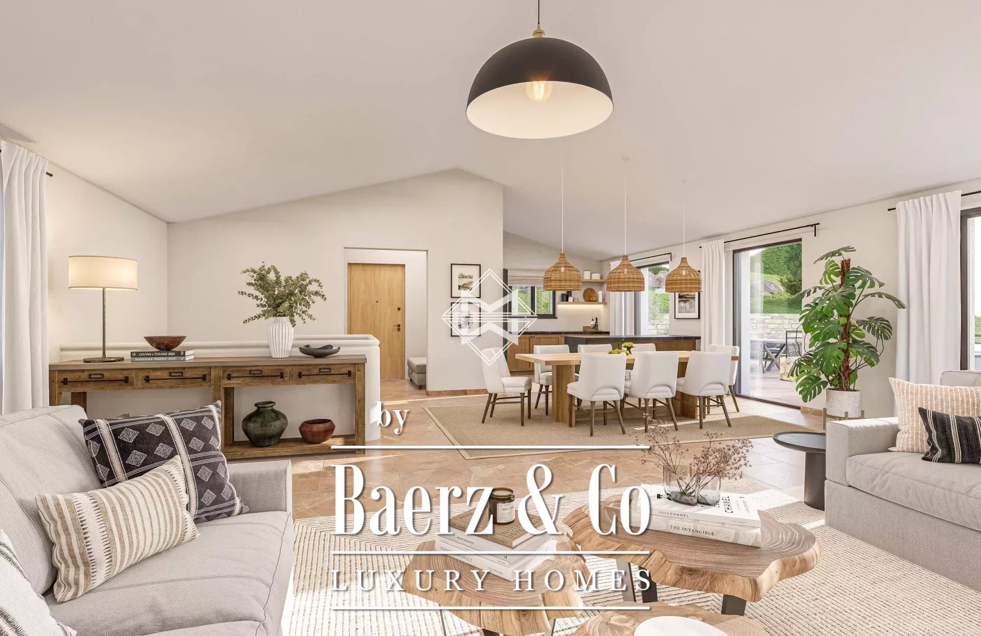 On the ground floor: a kitchen, dining area opening onto a bright living room, and 3 en-suite bedrooms with dressing rooms, all with access to the pool area.