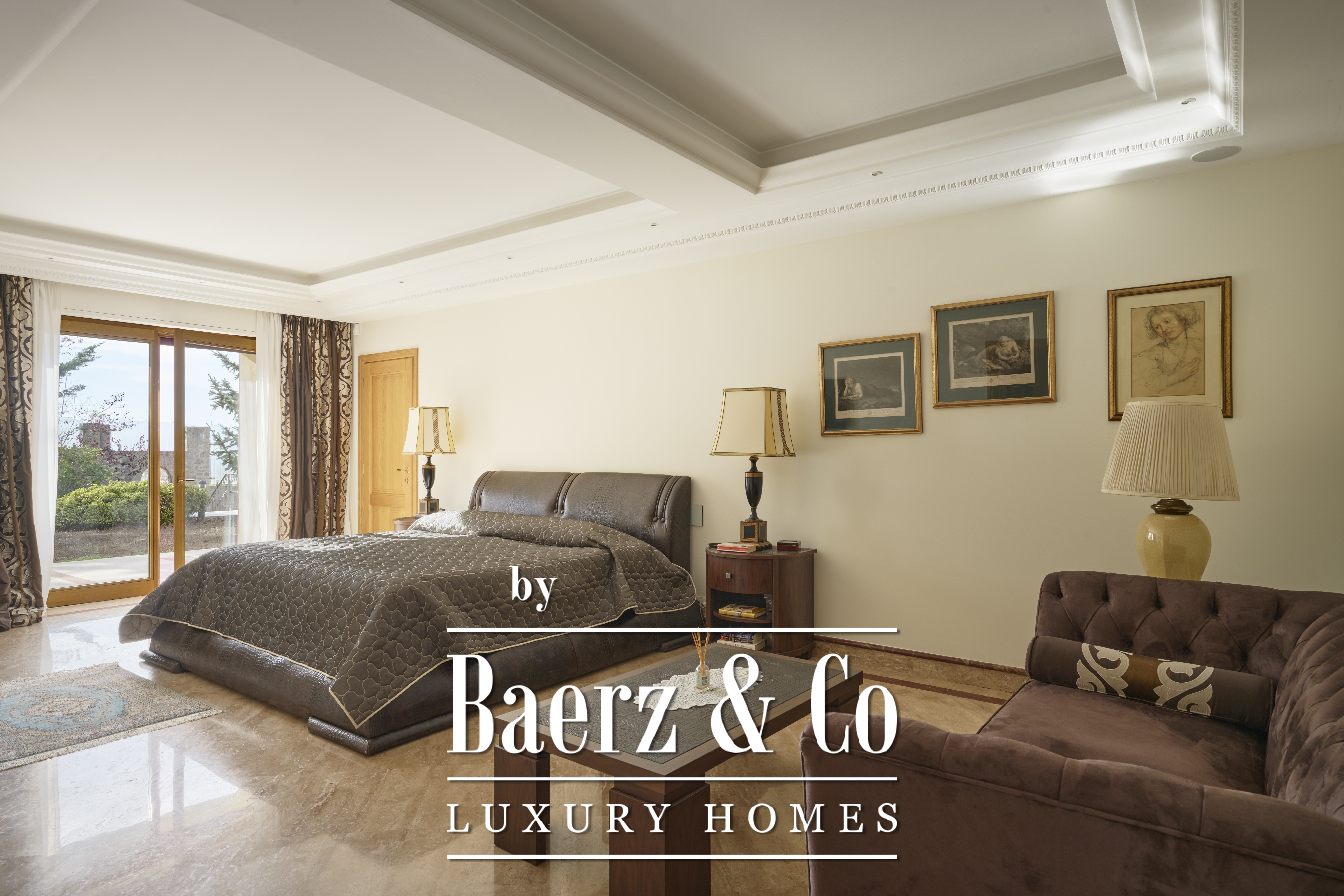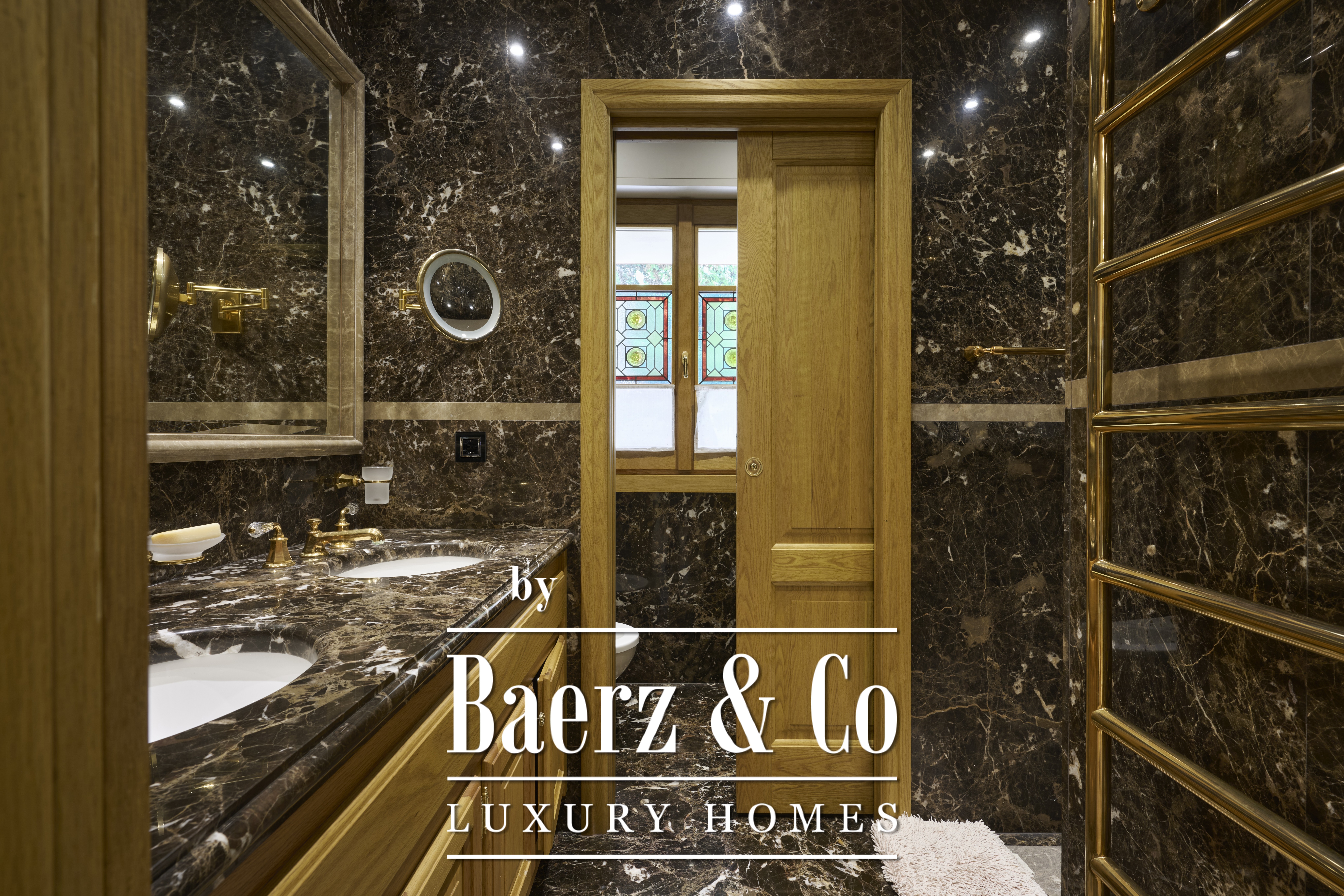 The **guest house and professional suite** (approx. 120 m²) include a self-contained studio with kitchenette, a spacious garden-level business suite with independent access, and a traditional “hunting pavilion” with a large bar and fireplace.