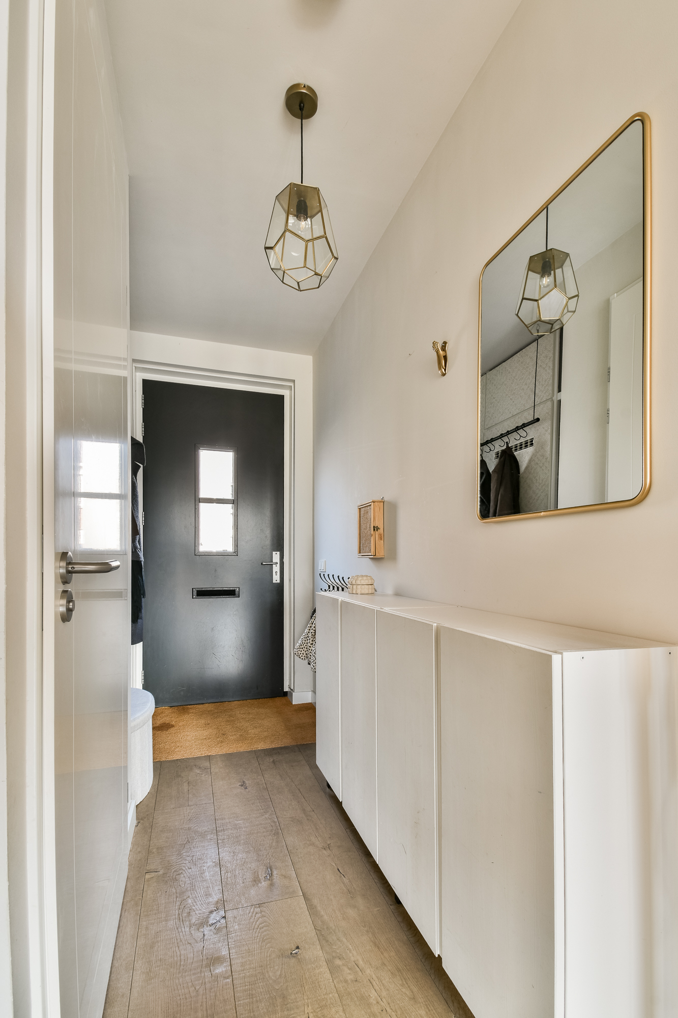 Through the entrance you enter the hallway with meter cupboard and a modern wall-mounted toilet with washbasin. At the front of the house is the open kitchen, equipped with various built-in appliances and a spacious countertop. The living room is located at the rear, with French doors providing access to the beautifully landscaped backyard. The ground floor also features a practical storage cupboard under the stairs.
