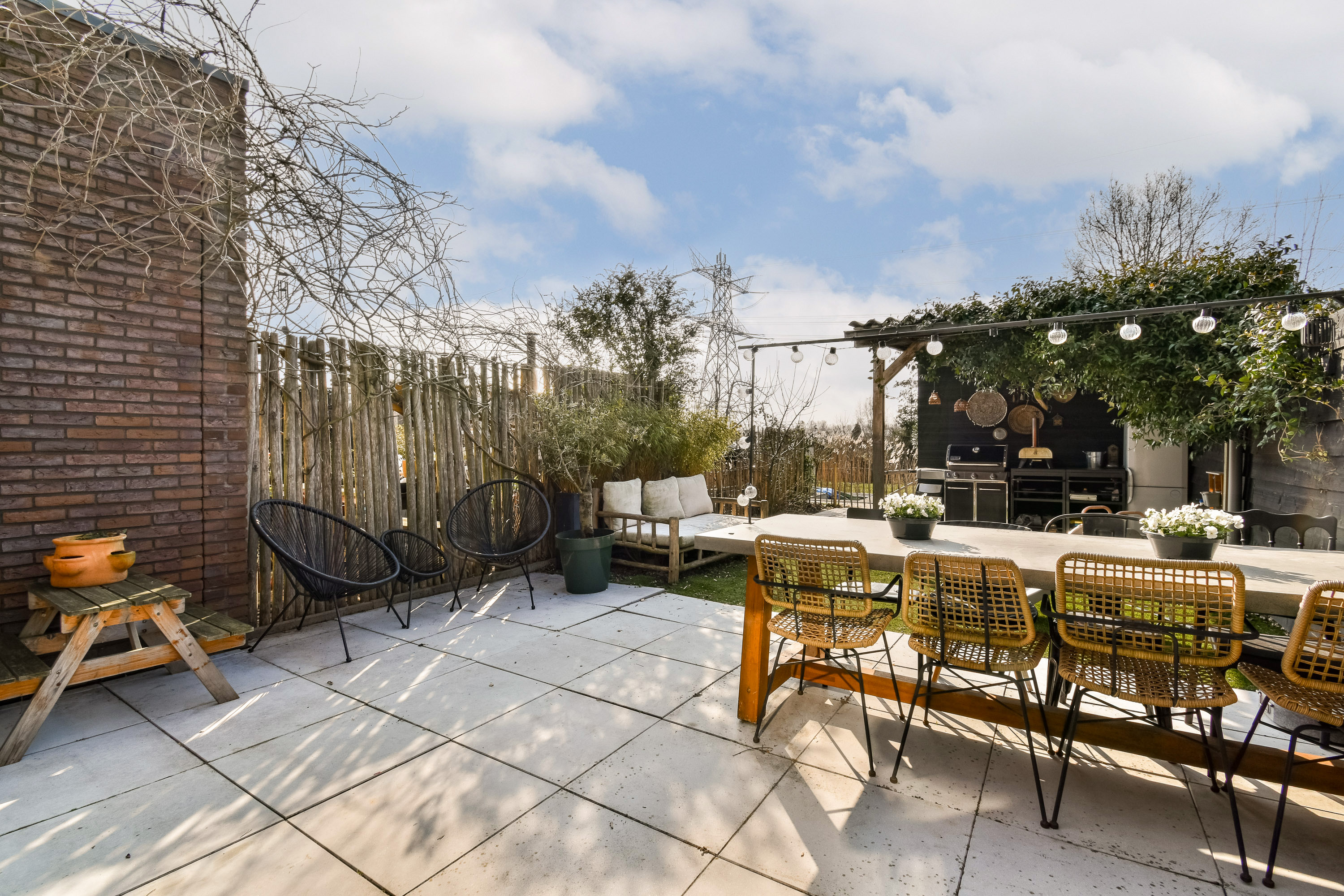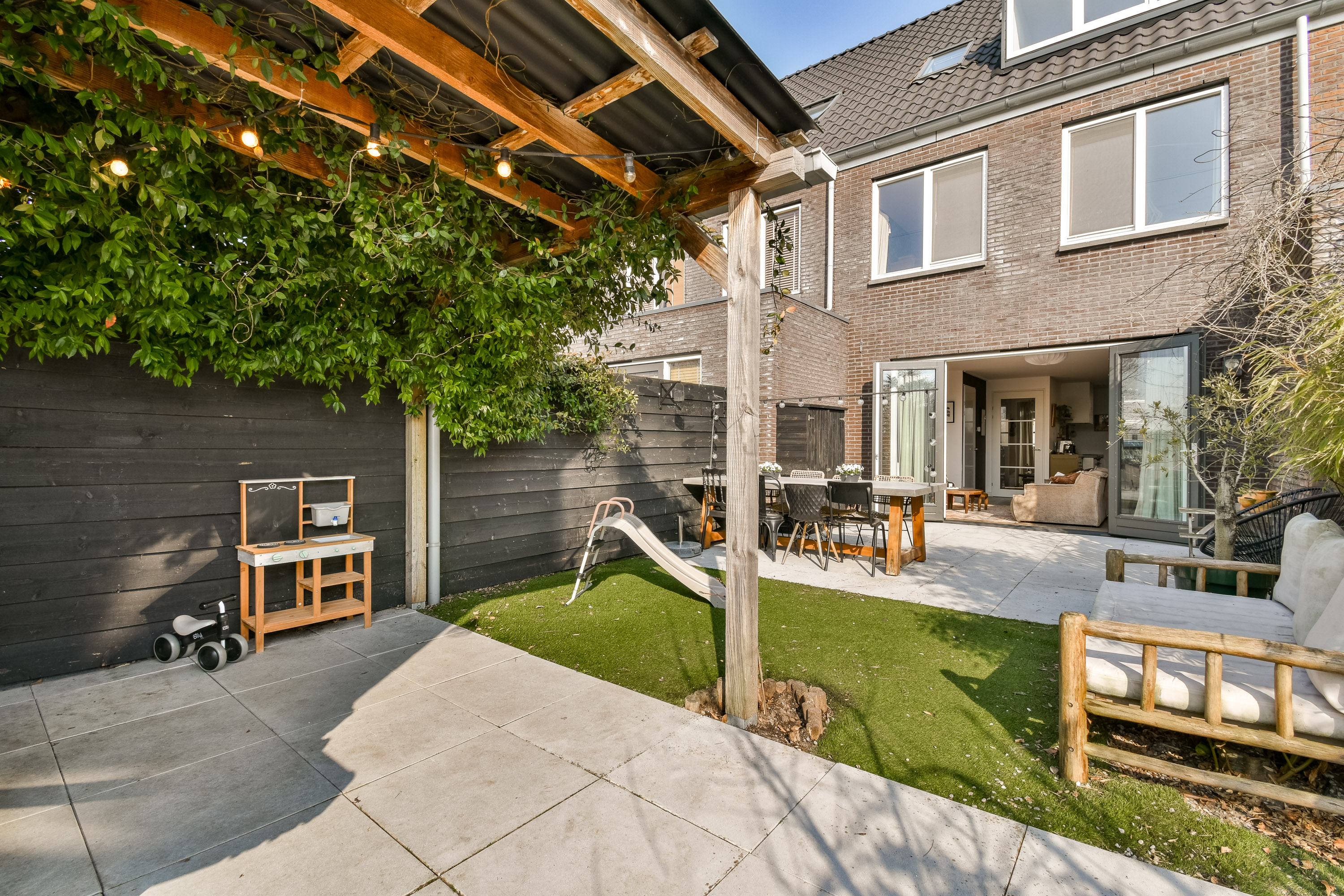 - Beautifully landscaped south-facing garden with privacy, storage, and rear access
