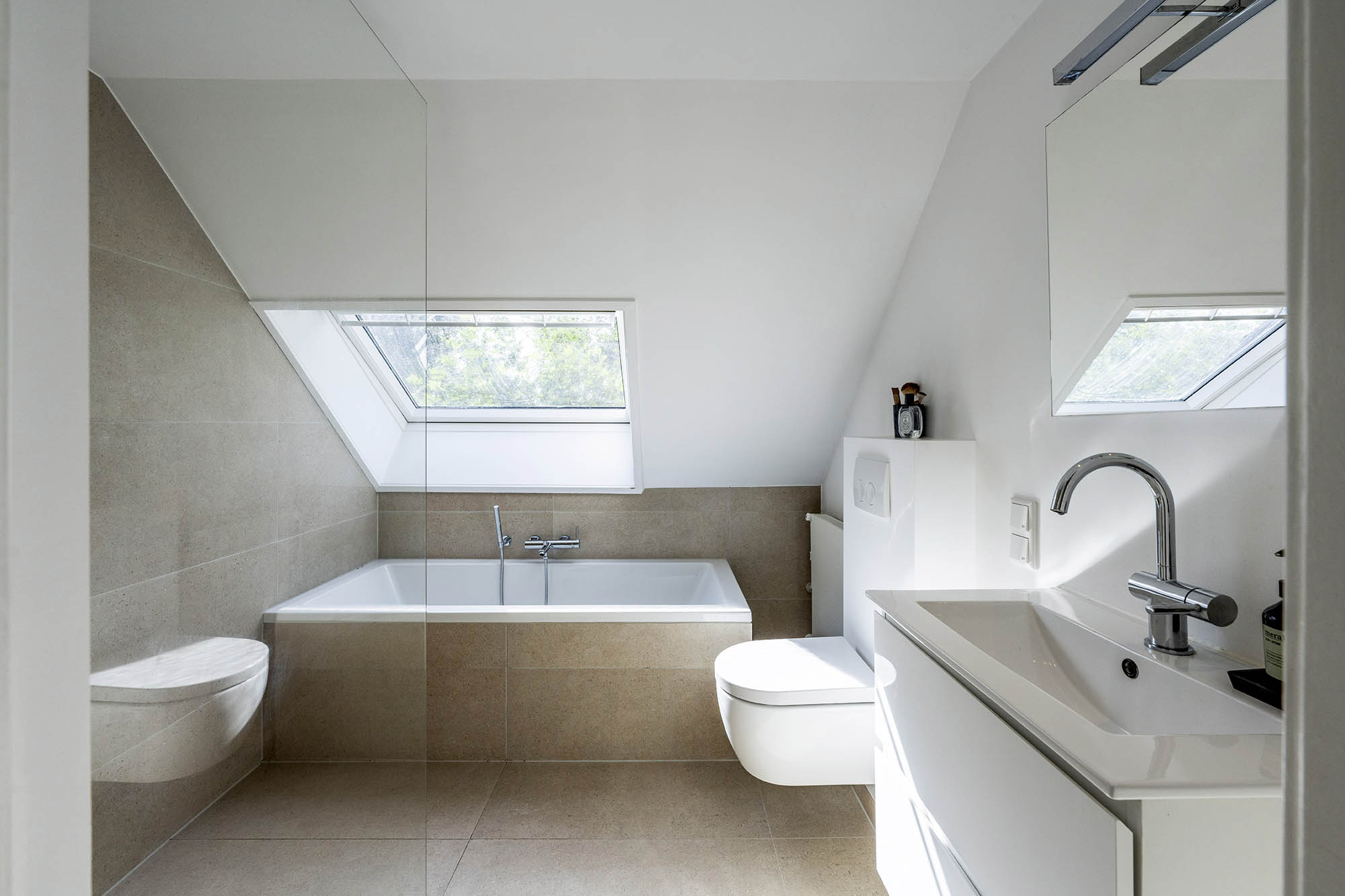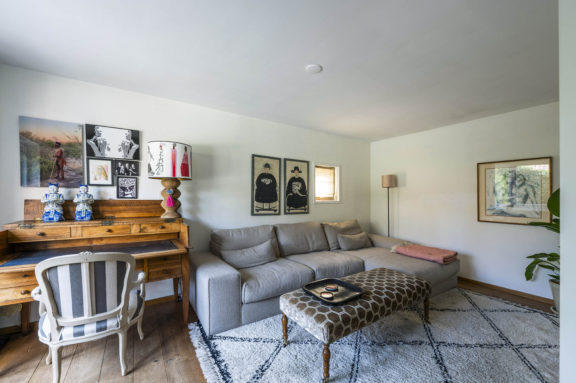 Inside, the house offers an unexpectedly generous layout. The spacious living room with fireplace extends across the full width and features a cozy work corner and French doors opening onto the sunny garden with plane trees – a spot that instantly evokes a holiday feeling. The modern, fully equipped kitchen-diner and the separate TV room complete the ground floor.