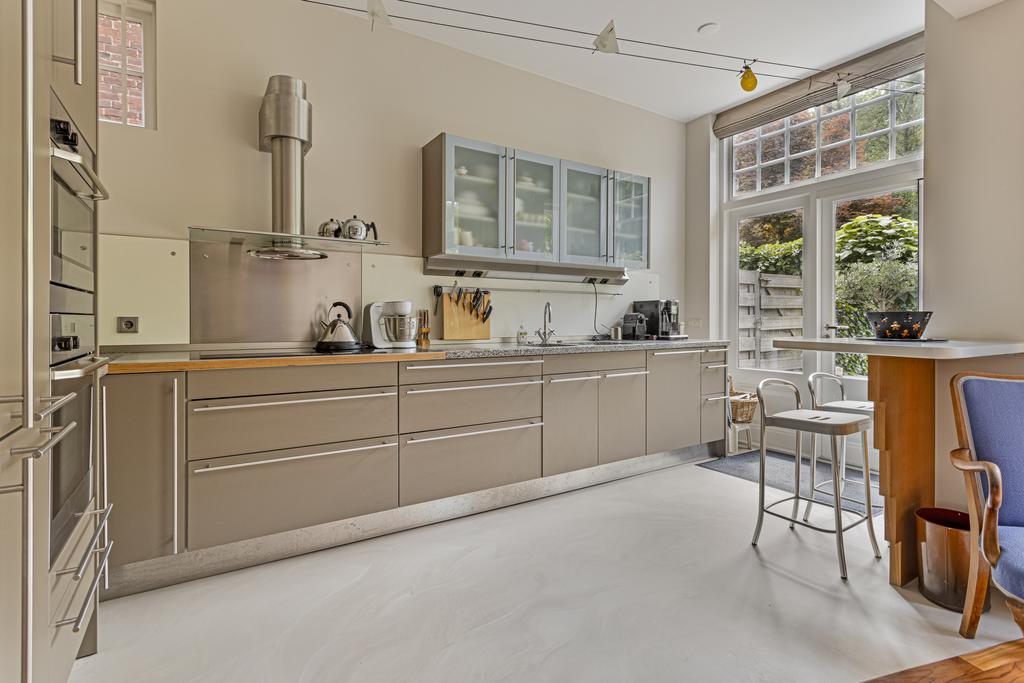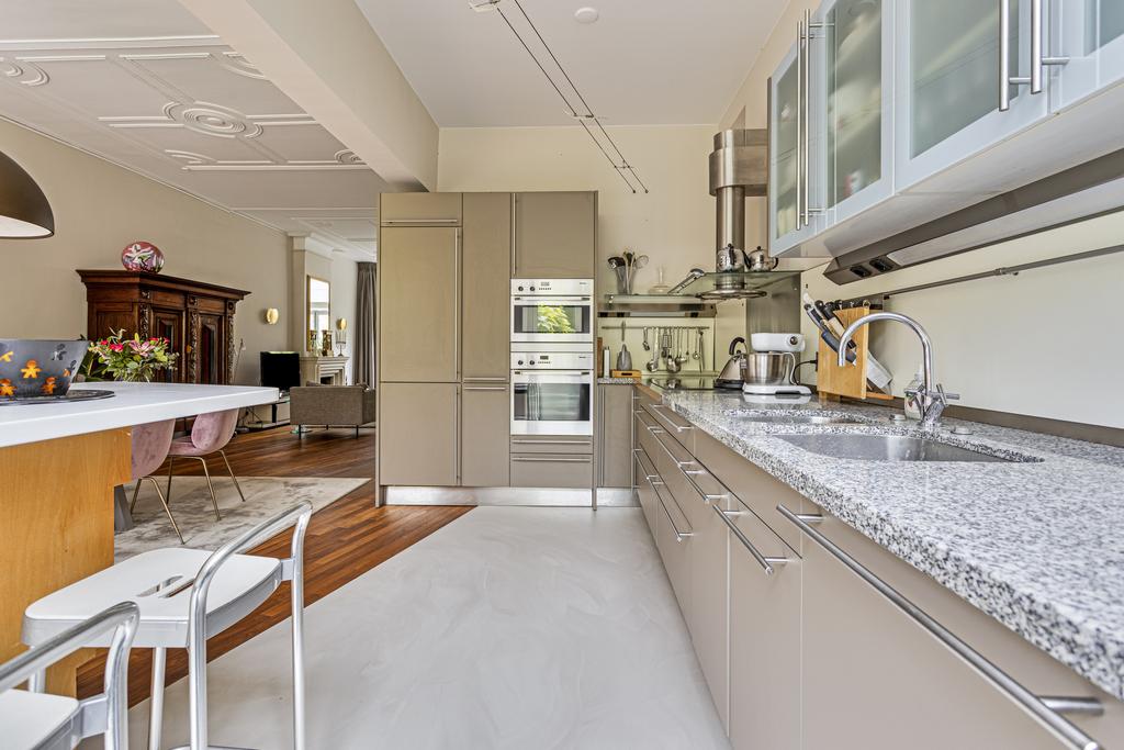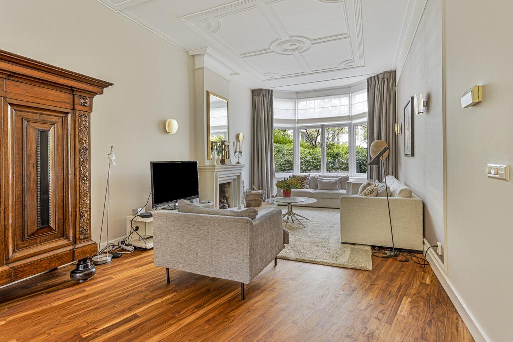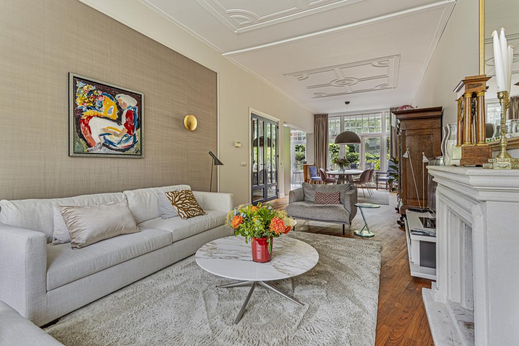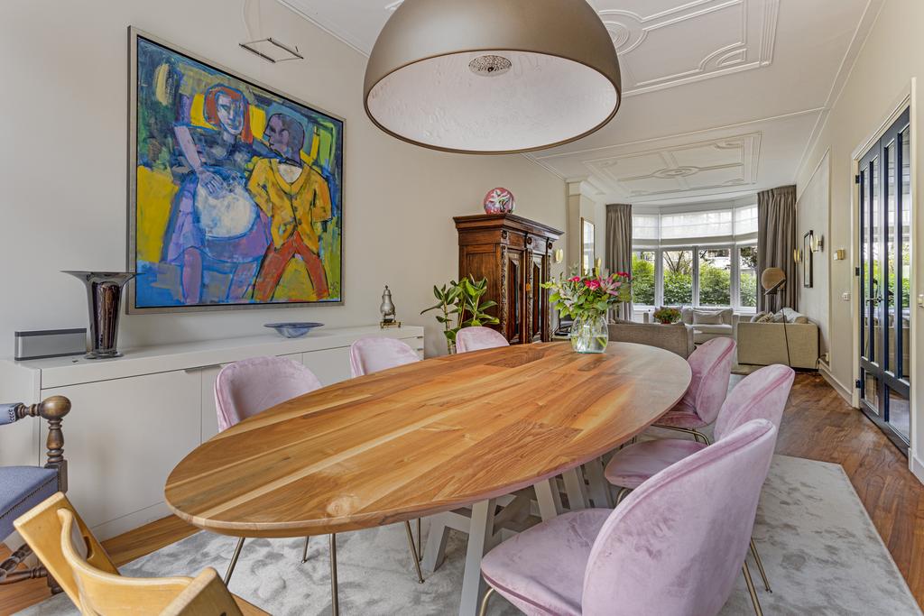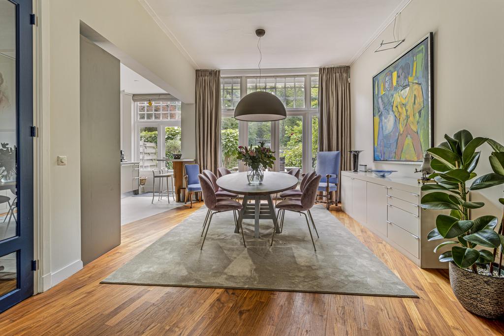Layout: spacious entrance with beautiful granite floor. Hallway with spacious cupboard under the stairs and separate toilet. Very spacious and attractive living and dining room of approx. 46 m2 with a beautiful parquet floor, a wood-burning fireplace, a charming bay window at the front and patio doors to the garden. The luxurious, fully open Bulthaup kitchen was largely renovated in 2023 and is of course equipped with all the usual equipment.