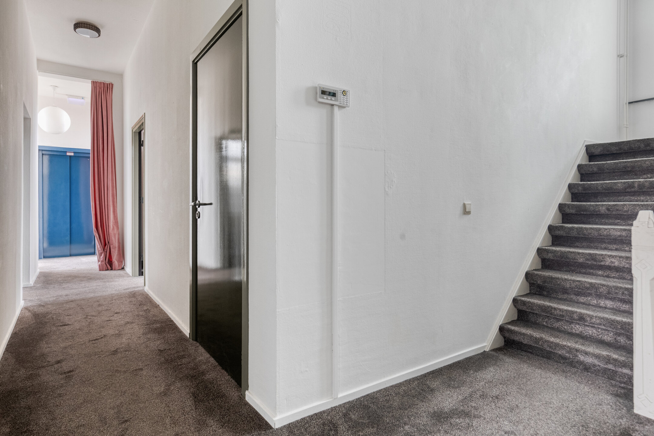 Entrance hall with staircase to the first floor; plastered walls, linoleum flooring, plastered ceiling