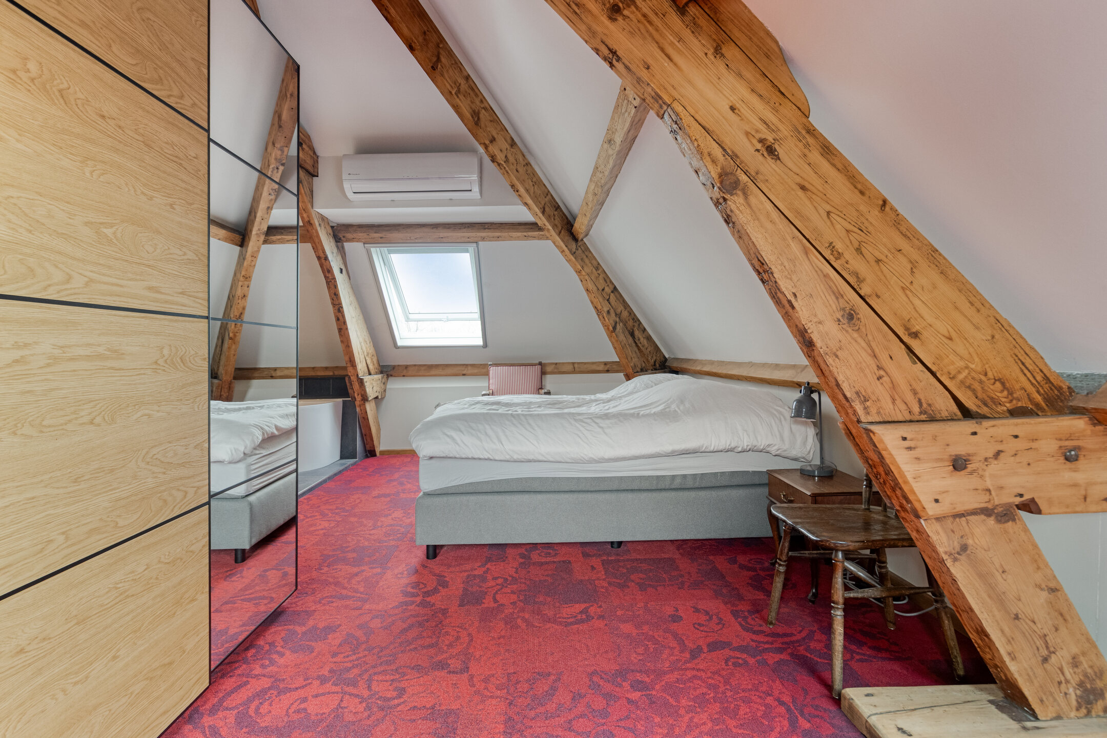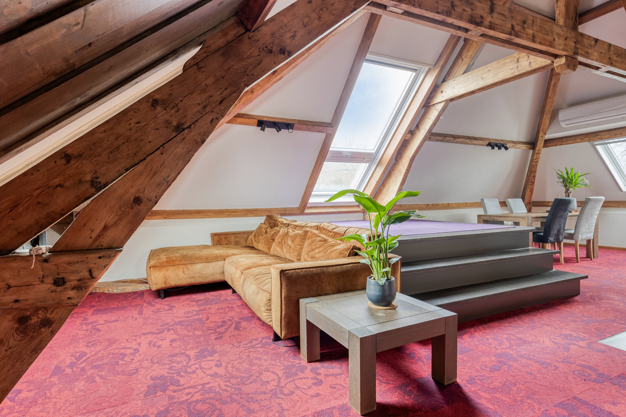The second floor is also used as an apartment. This level features a bright living room with a Velux balcony window, an open kitchen, and a sleeping area with an en-suite bathroom, creating a pleasant and self-contained living environment.