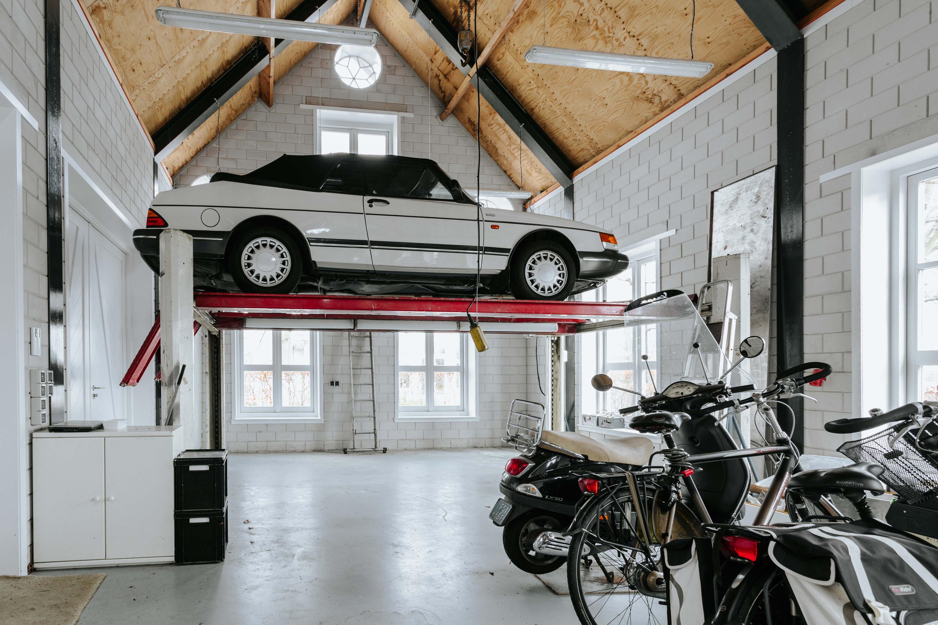 A separate garage building accommodates six cars with underfloor heating and workspace, and is adaptable for future uses. Energy-efficient features, including a heat pump and extensive insulation, complement the property’s sustainability.