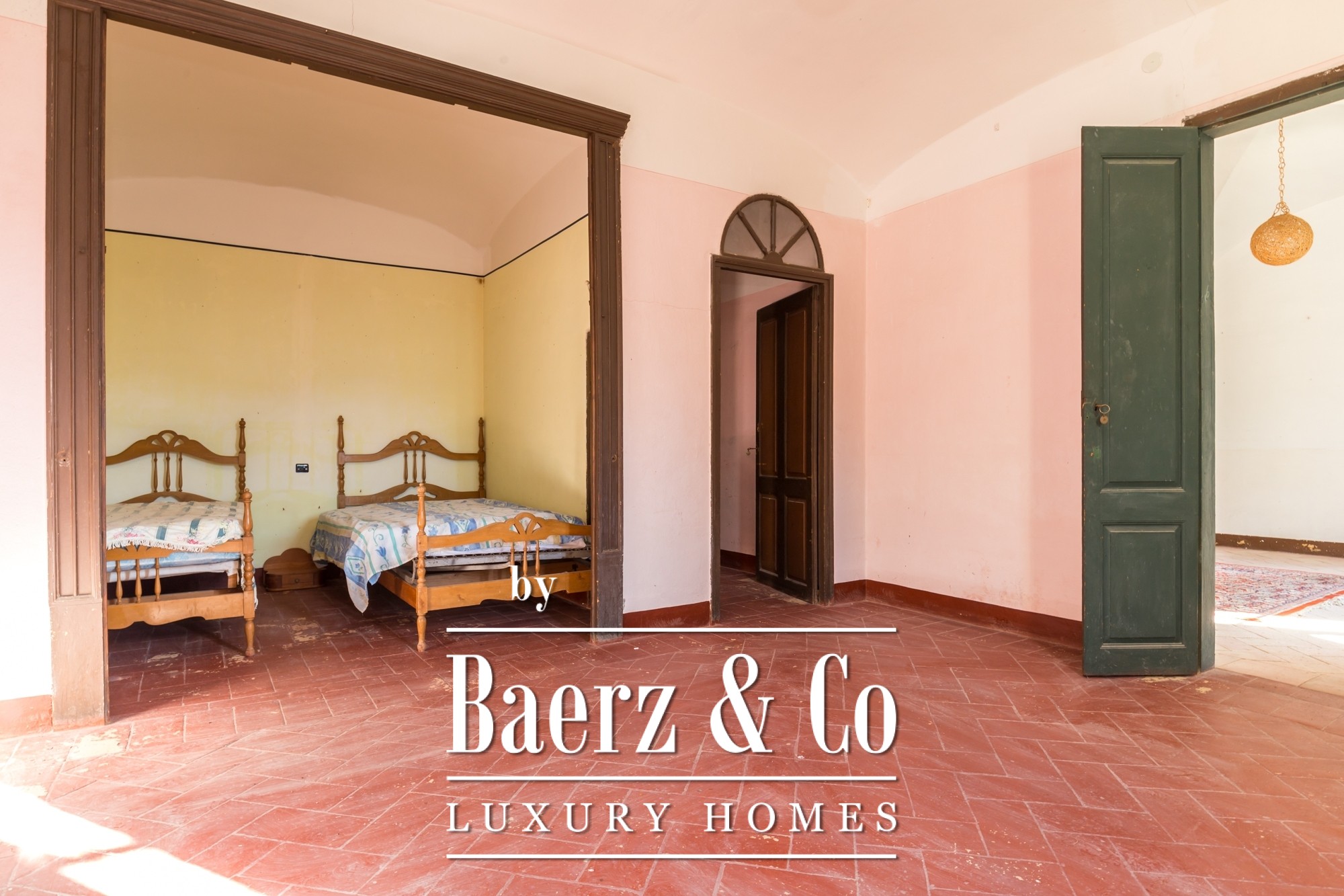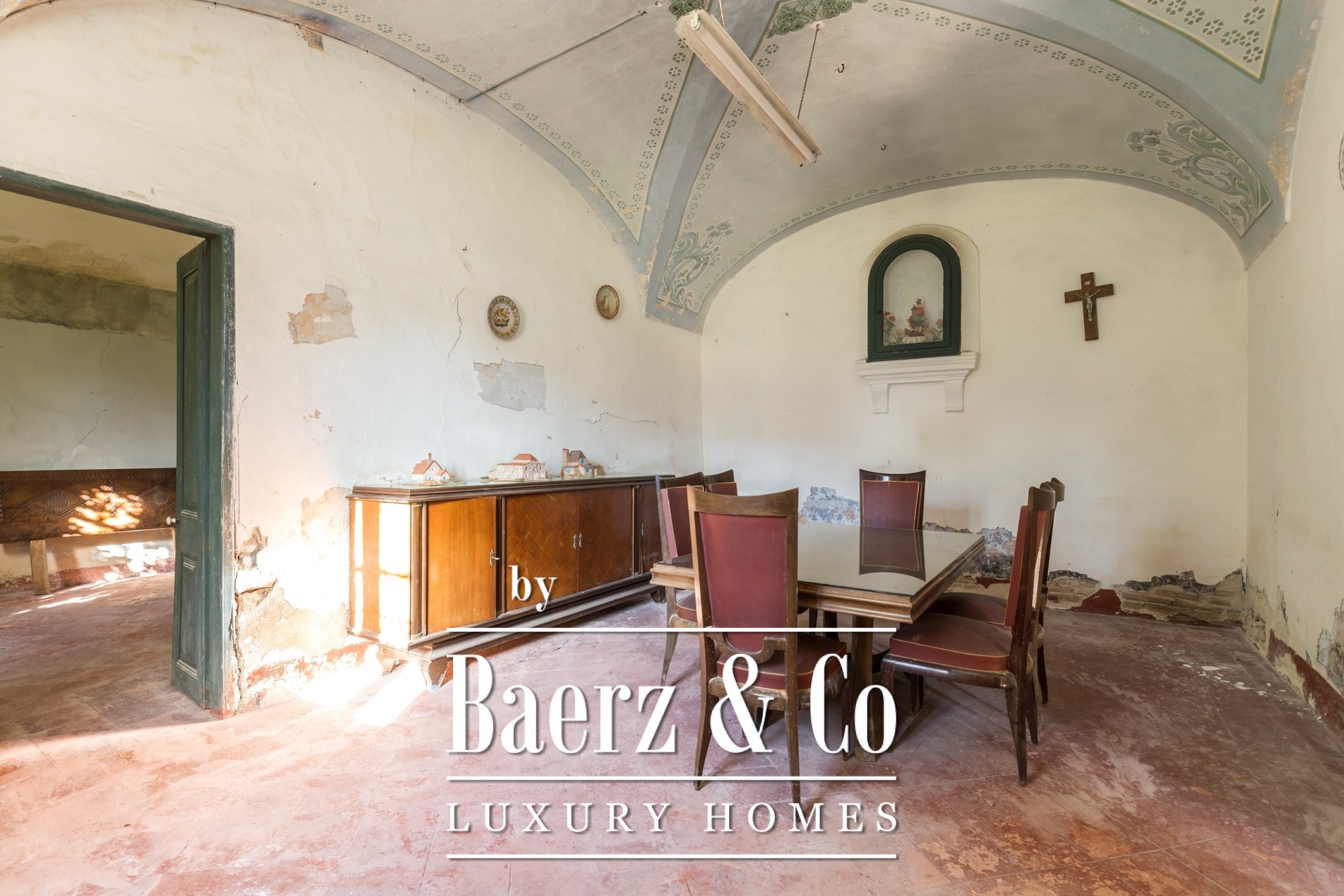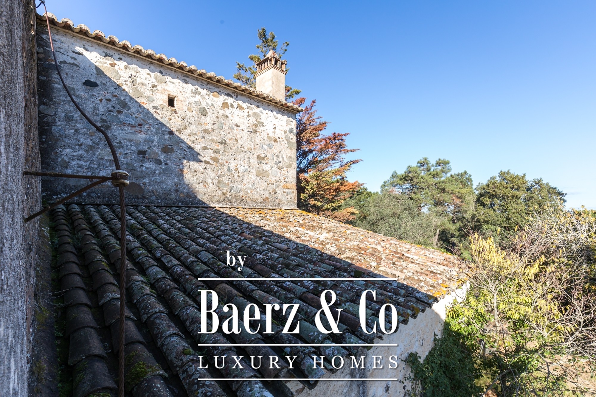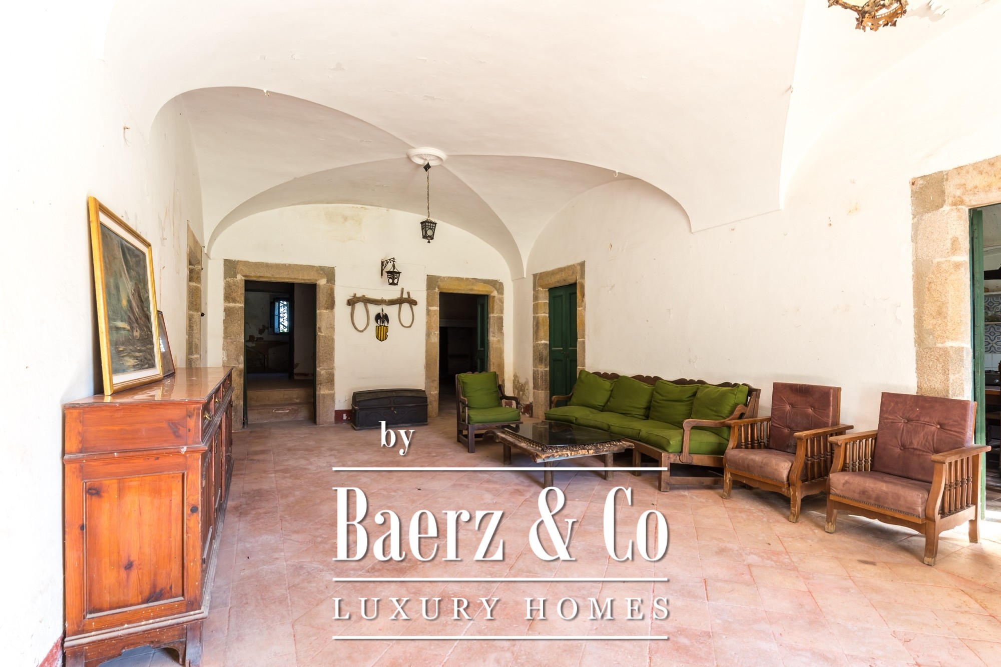 The main residence features seven bedrooms and four bathrooms, with suites on the upper level offering private terraces and sweeping vistas. High ceilings, light-filled rooms, and original architectural details reflect its historical character. There are two dining and living rooms, a voluminous family kitchen, and an office-library connecting to a serene private garden. Generous storage and auxiliary buildings convey practical flexibility.