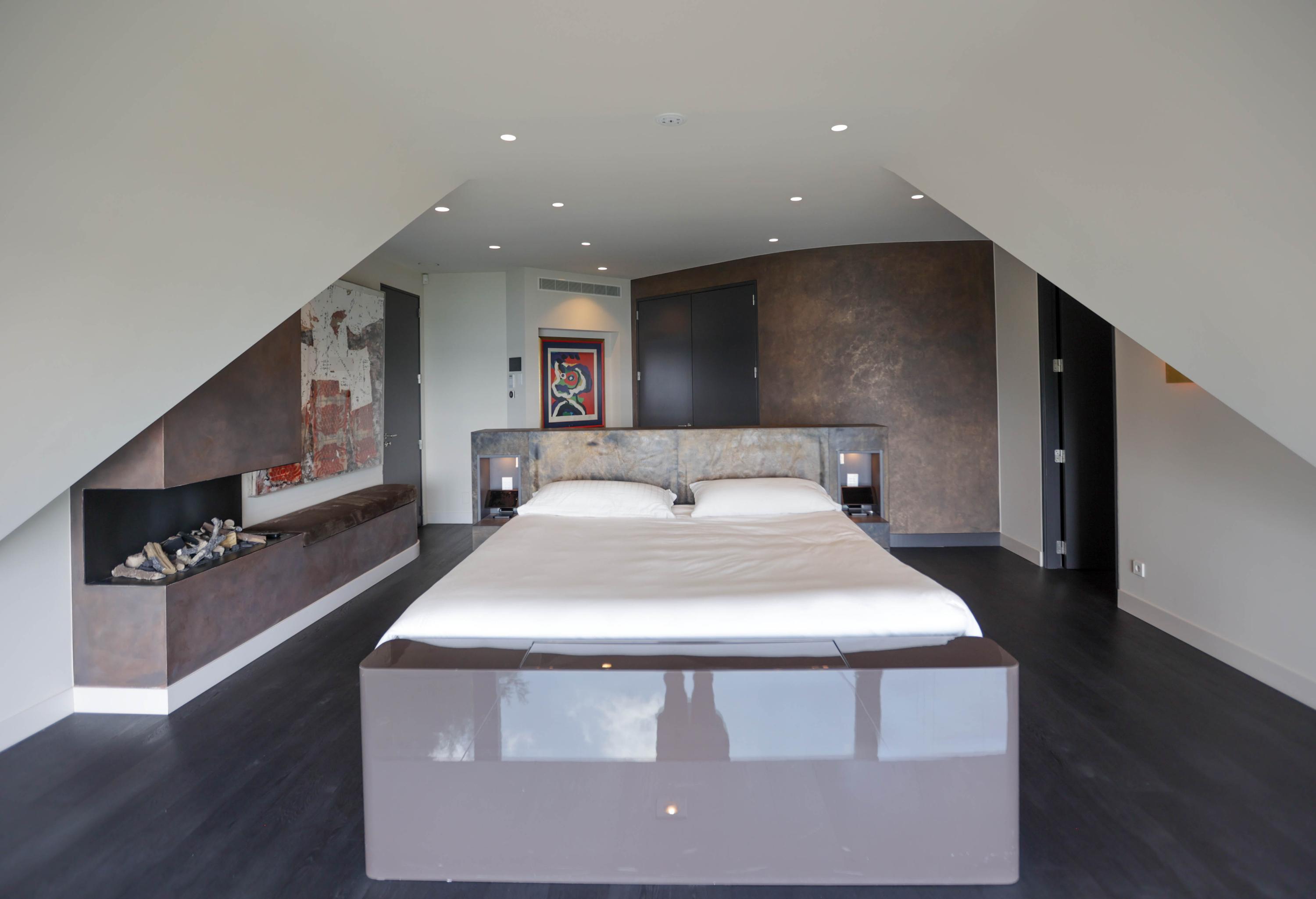 A natural stone staircase leads from the reception hall to the first floor. Double French doors on the landing open to the primary bedroom. Although the term bedroom doesn't do the space justice - this room is a genuine dream, not in the least due to the stunning vistas of the “Stille Plas” nature reserve, a view that you will wake up to every day.