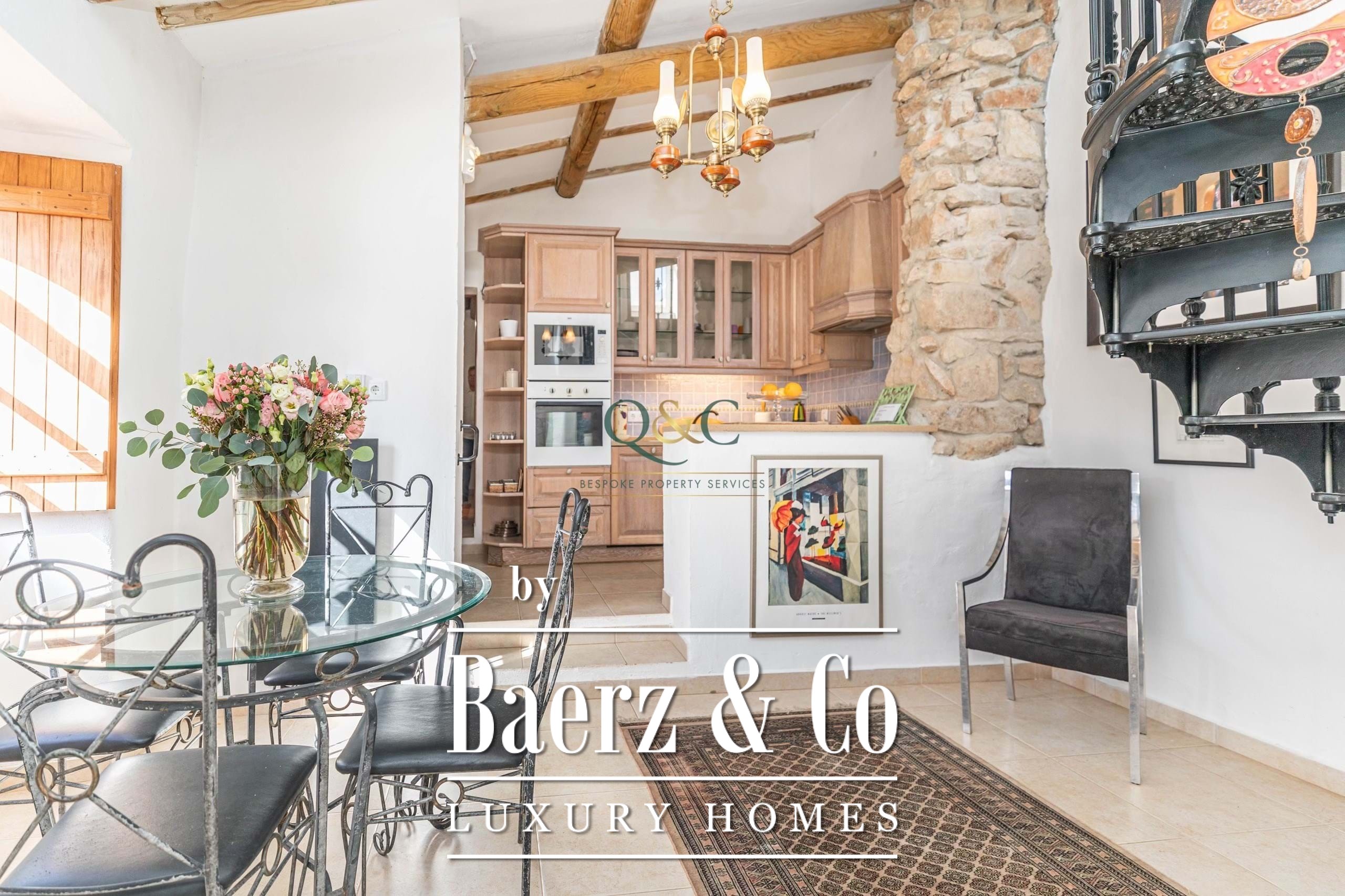 Inside, two en-suite bedrooms provide both style and function, one equipped with a shower and the other with both bath and shower. The original stone wall in the fully equipped kitchen and breakfast room creates a tactile connection to place, while bamboo and wooden beam ceilings contribute to the home's distinctive warmth. A wood burner and duo-therm natural stone radiators ensure comfort in all seasons, as air conditioning subtly cools the entrance and sitting room. An additional office room supports versatility and ease.