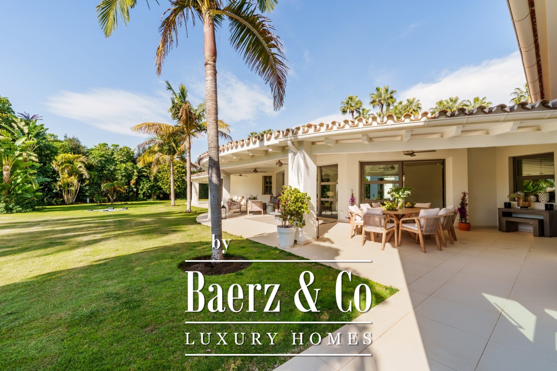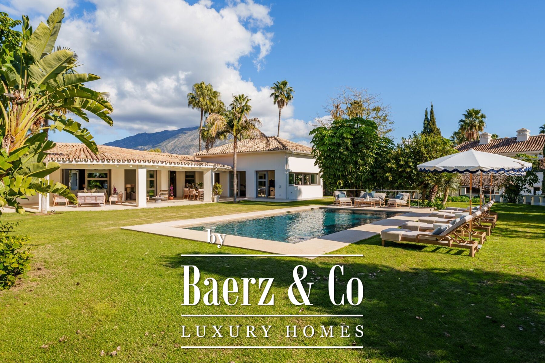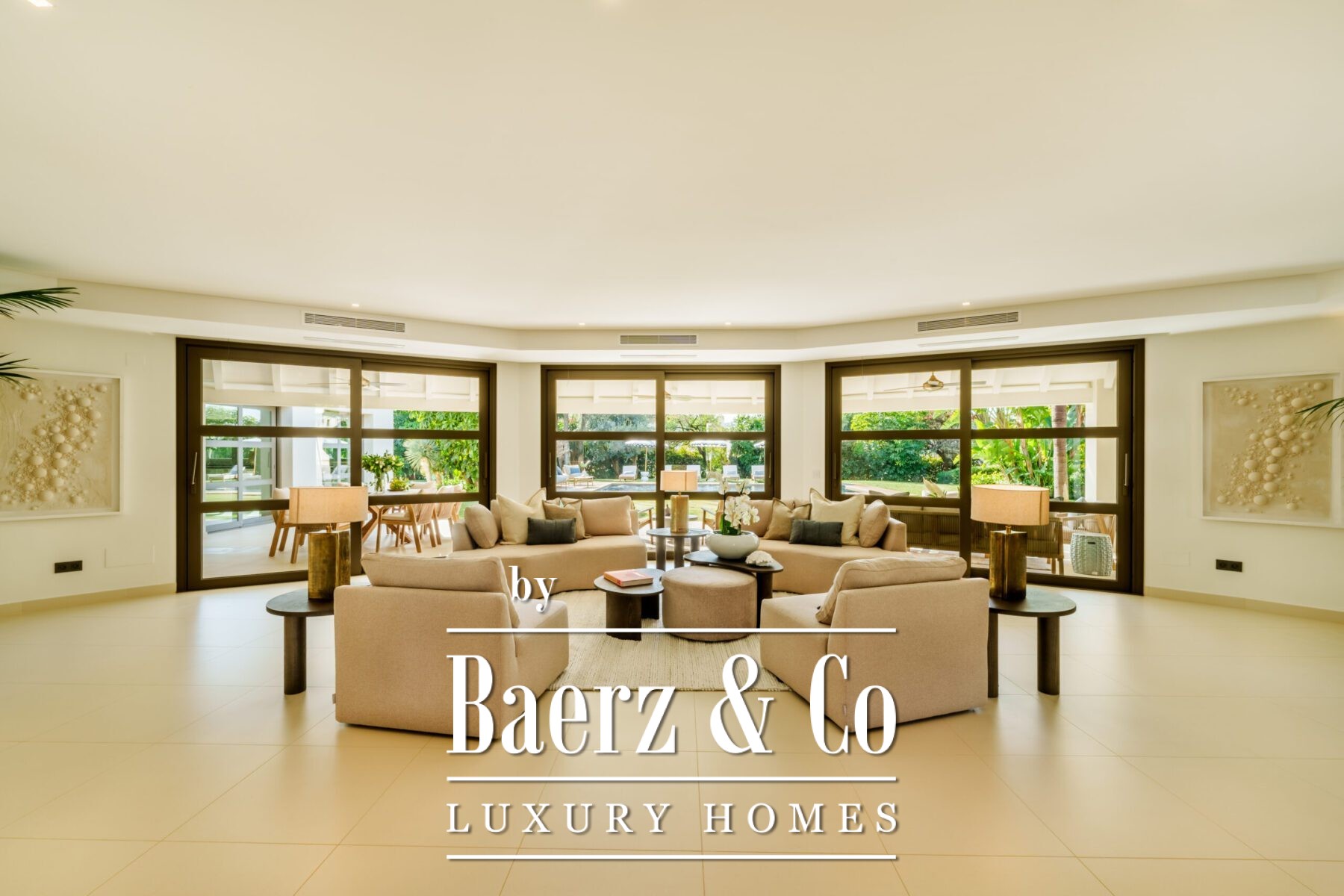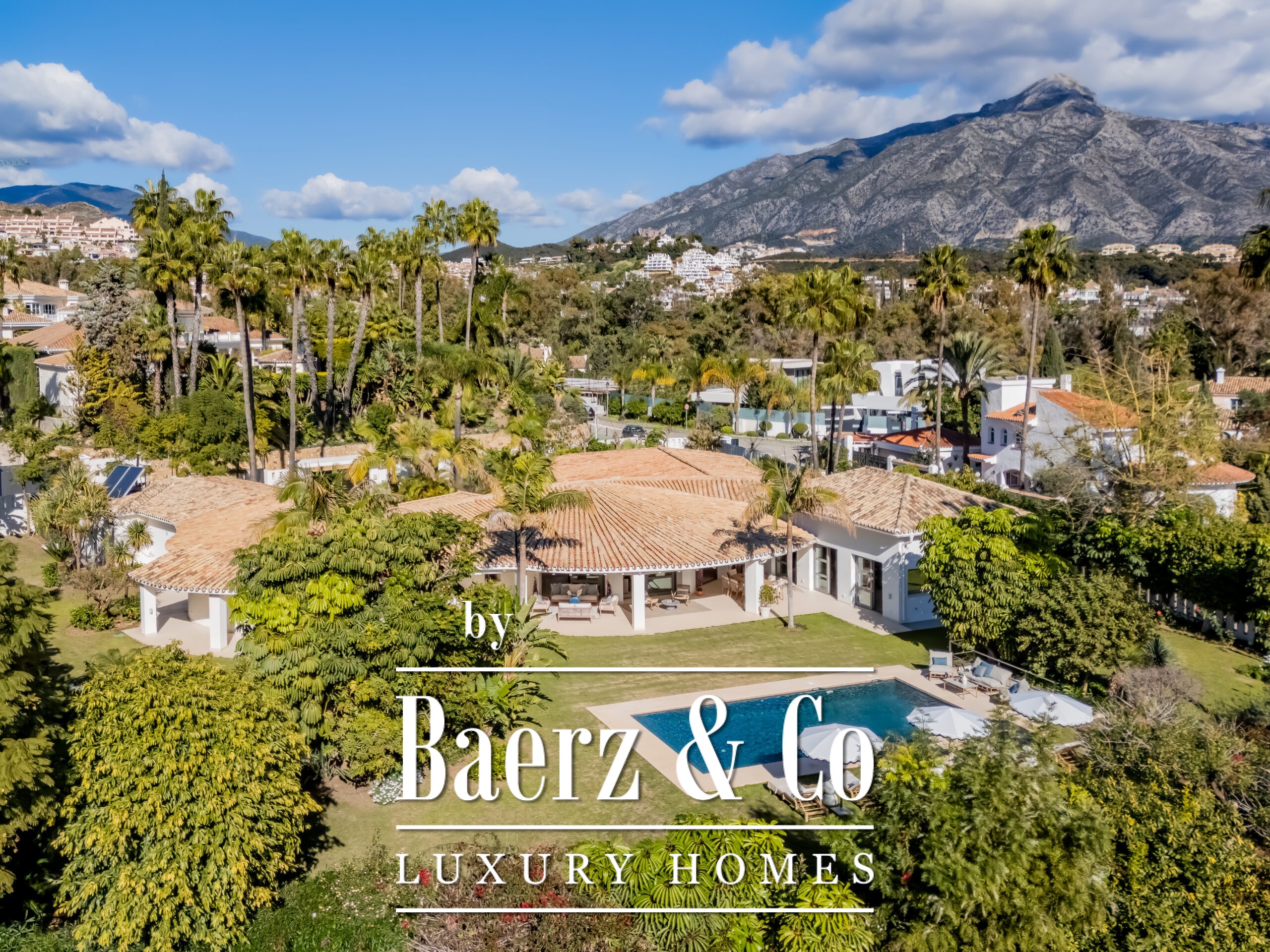 Villa Marbella with Mature Botanical Gardens and Golf Views unfolds across 722m² on a single level, set within a 3,081m² south-facing plot in La Cerquilla, Nueva Andalucía. This villa Marbella property has evolved through thoughtful renovations, with a landmark update in 2013 by Bonifacio Solis and attentive upgrades as recently as 2024. The result is a residence that balances architectural clarity and botanical splendor with discretion and enduring quality.