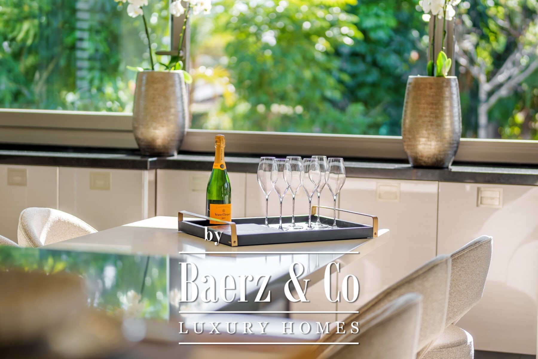 Stepping inside, the rhythm of the house is established as light and landscape intertwine. All five bedrooms, each serene, open directly onto the mature gardens; generous living spaces include two voluminous lounges, an open-plan professional Danespan kitchen with a central island, and a tranquil library and office. The villa offers five bathrooms, including two en-suite bedrooms with private garden access, as well as wraparound covered terraces crafted for year-round enjoyment.