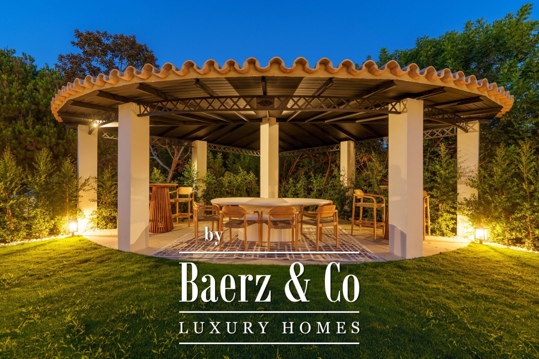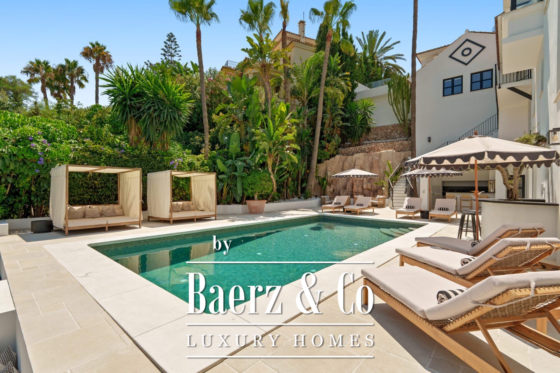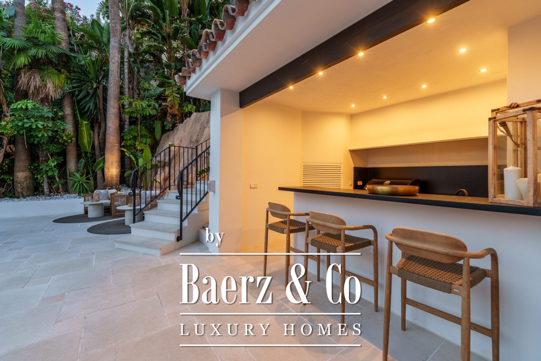 Outside, landscaped gardens embrace a private swimming pool and sunken lounge, adorned with ambient lighting and shaded spaces for tranquil reflection or social occasions. A multi-car garage, security features, and proximity to golf courses, the beach, Puerto Banús, and Marbella’s amenities complete the offering.