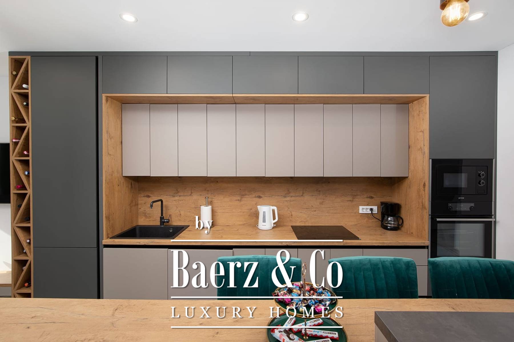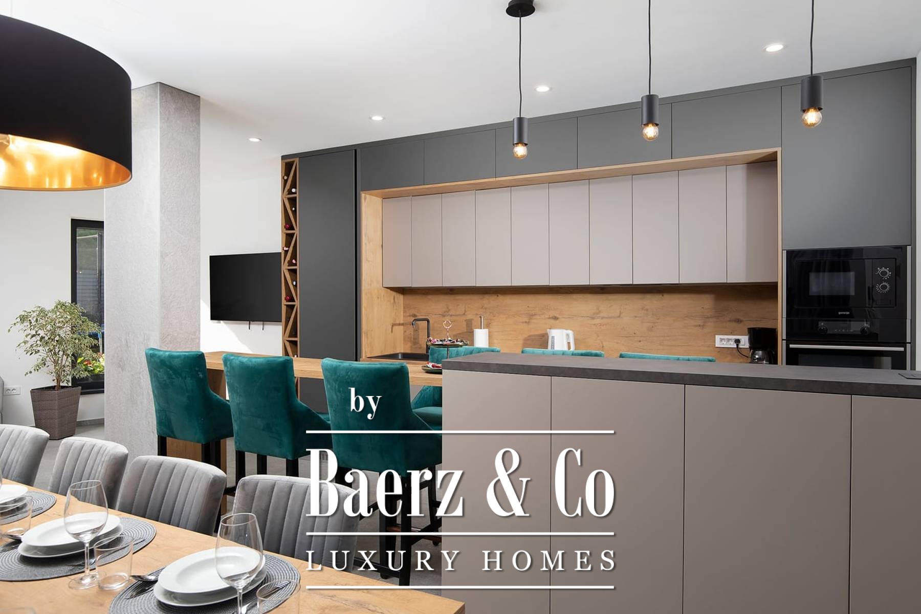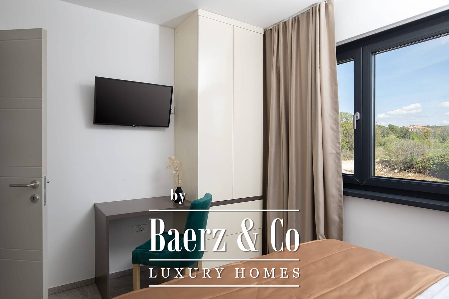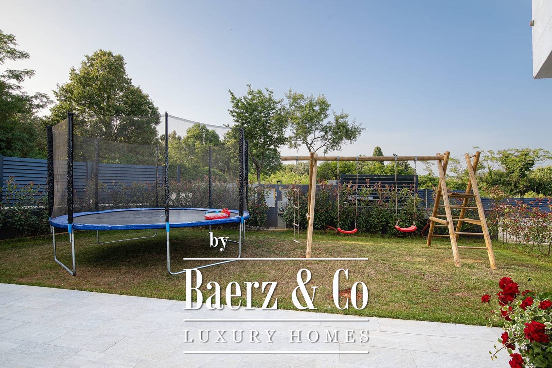 For sale is this luxurious modern villa in Medulin, net area 300 m2, located on a plot of 600 m2 in a quiet area. It consists of a basement, ground floor and first floor with the following layout: in the basement there is a wellness area with a relaxation zone. On the ground floor there is an entrance, a spacious open space living room with kitchen and dining room, three bedrooms each with its own bathroom. From the living room there is access to the terrace (part covered, part uncovered) from which access to the pool 9 m x 3.5 m and the garden, summer kitchen and children's playground. On the first