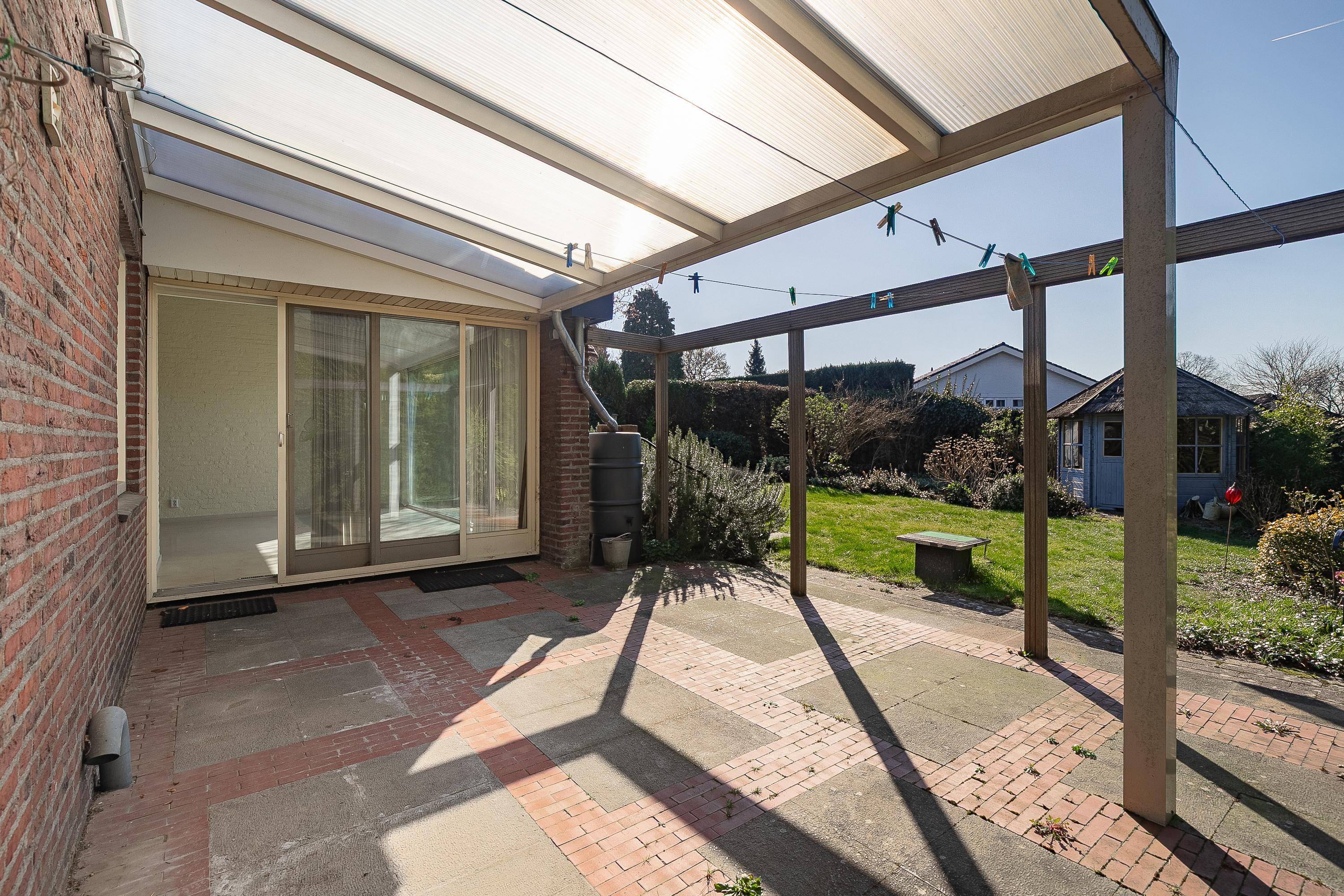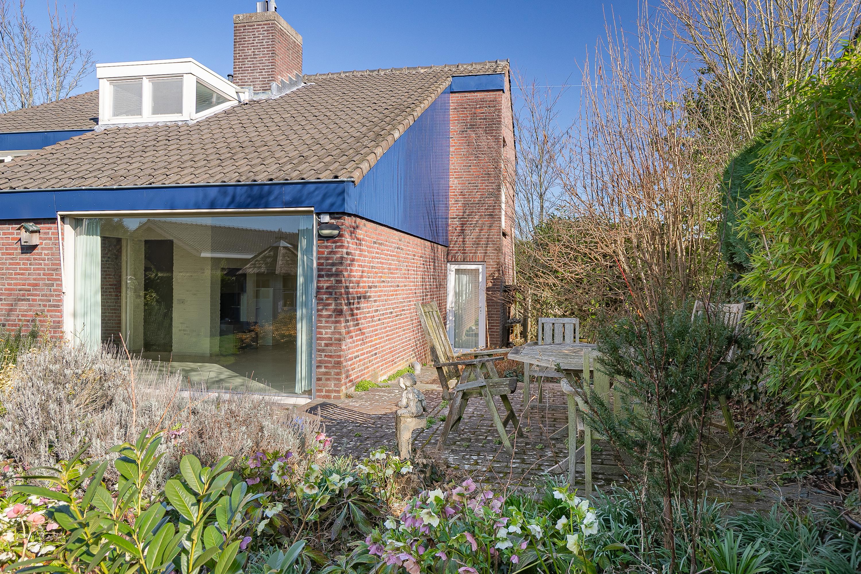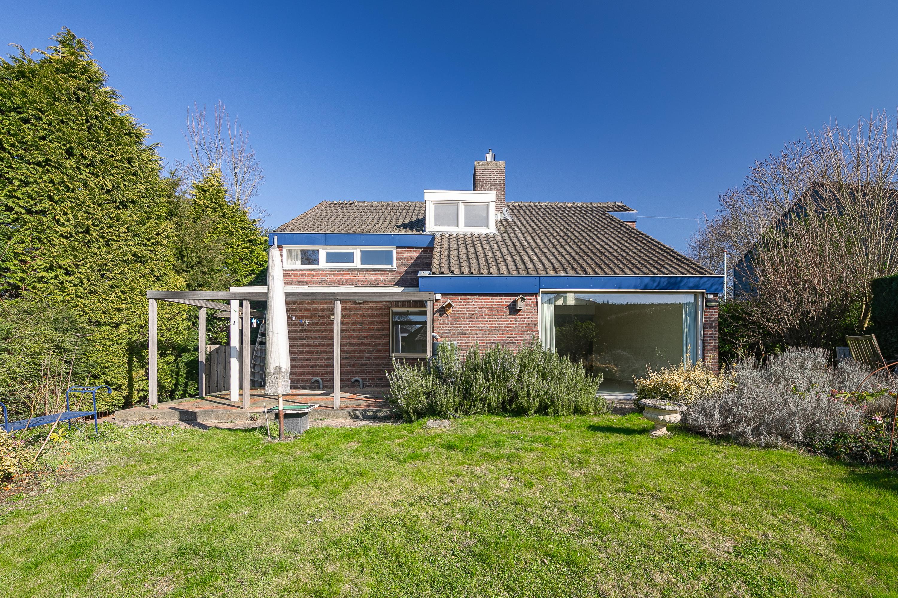 The house is centrally located on the plot, resulting in spacious outdoor areas at both the front and rear. The sunny backyard is private and offers several terraces/seating areas with canopies, a lovely lawn, various mature plants, a practical garden shed, and a double back entrance. The front yard with spacious driveway offers panoramic views of the fields.