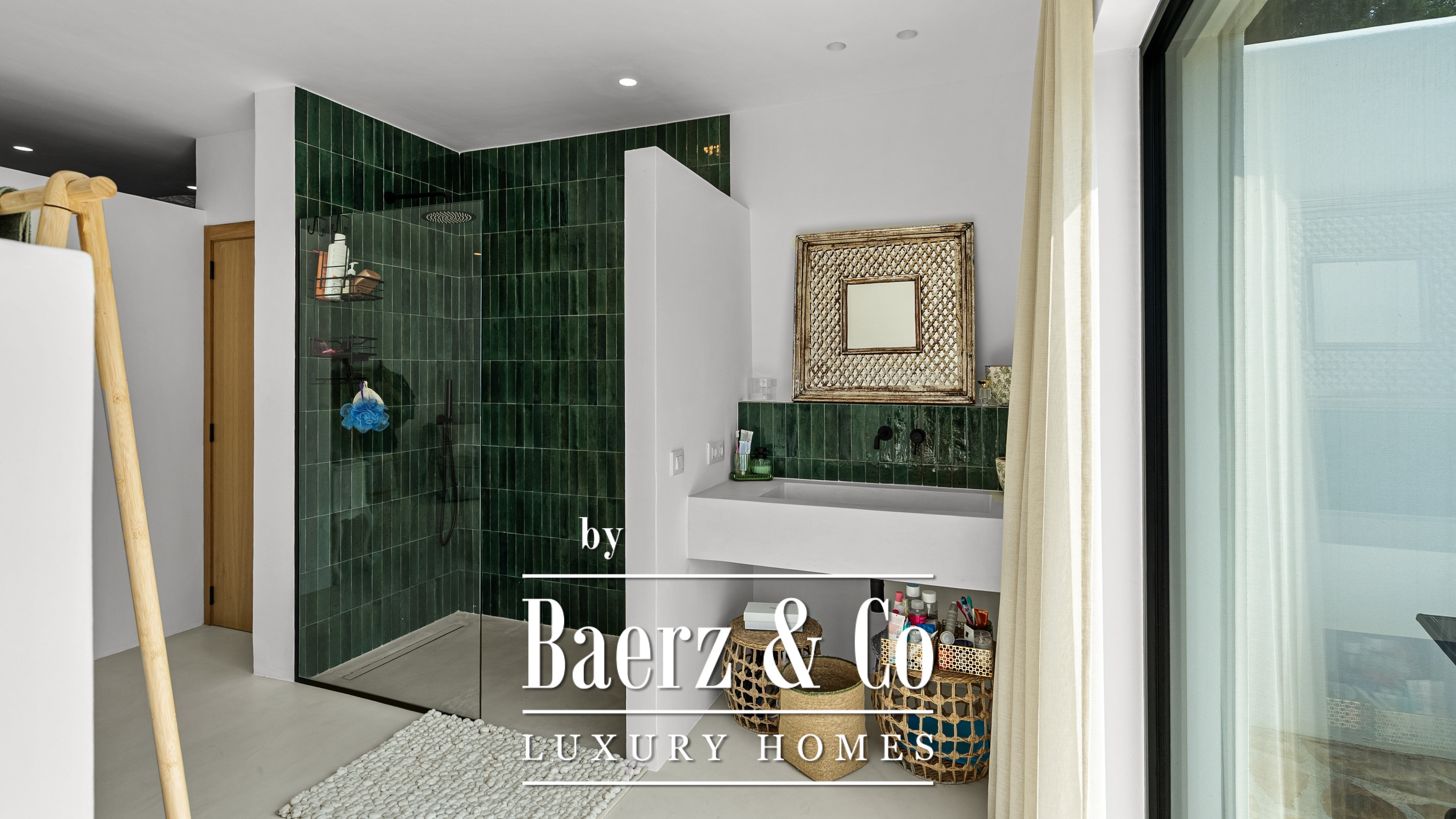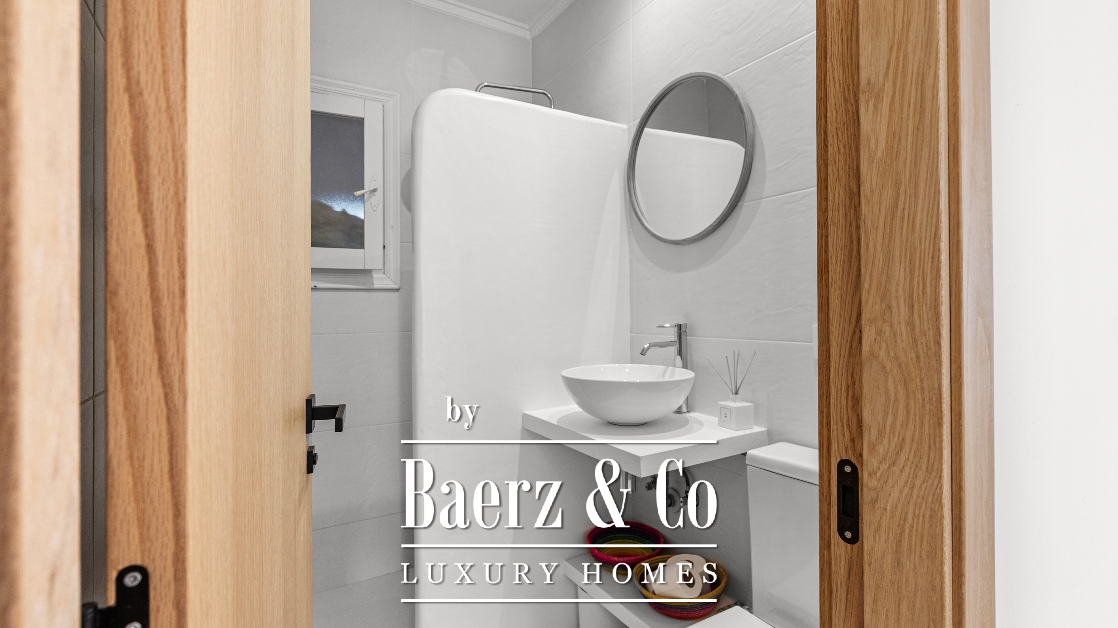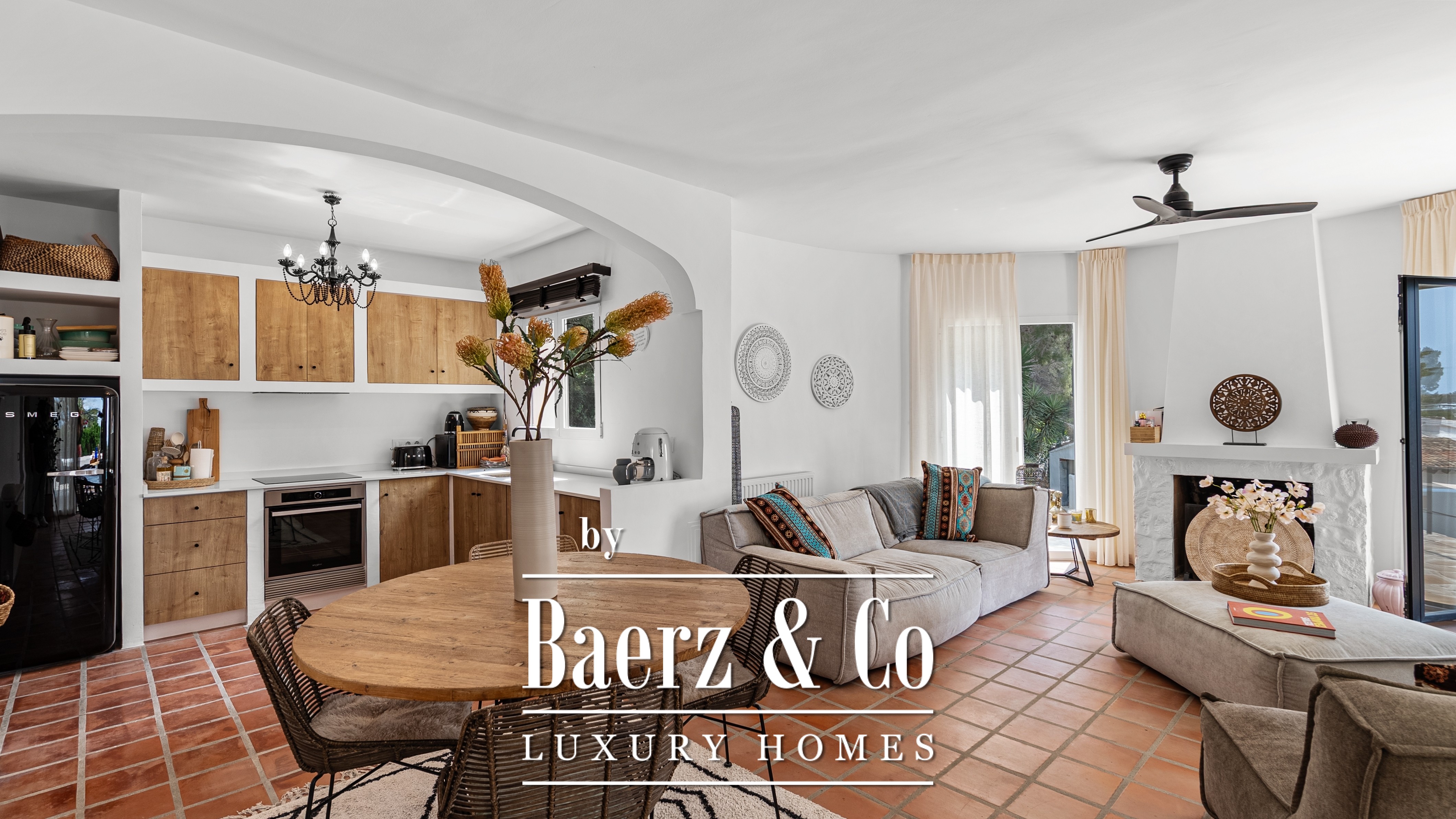 The open kitchen, seamlessly linked to the living area, creates an inviting rhythm of interior and exterior living. Natural light is ever-present, fostering a setting where daily rituals feel elevated. Doors unfold to a terrace that captures the pulse of outdoor Mediterranean life, ideal for long afternoons and evenings spent with family or guests.