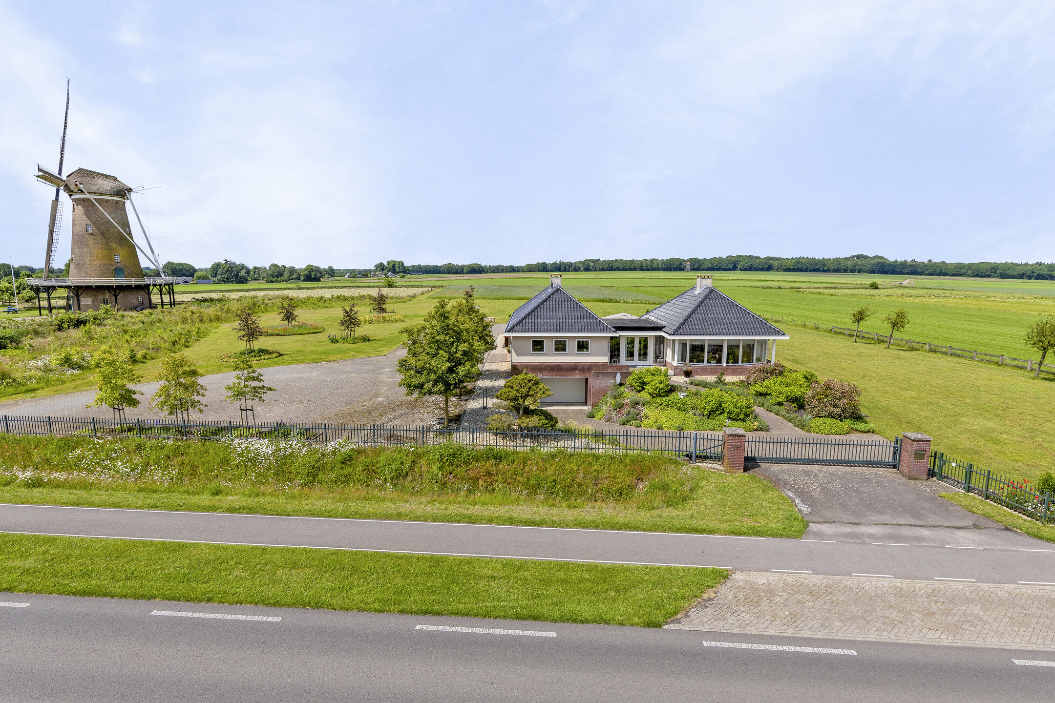 ... for there lies an impressive 1.2ha waiting for you. At the front, the plot is accessed by an electric gate, allowing you to drive straight into the garage. Surface parking is also possible, because the driveway has room for at least eight cars. There is also a charging station, so you always drive away with a full battery.
