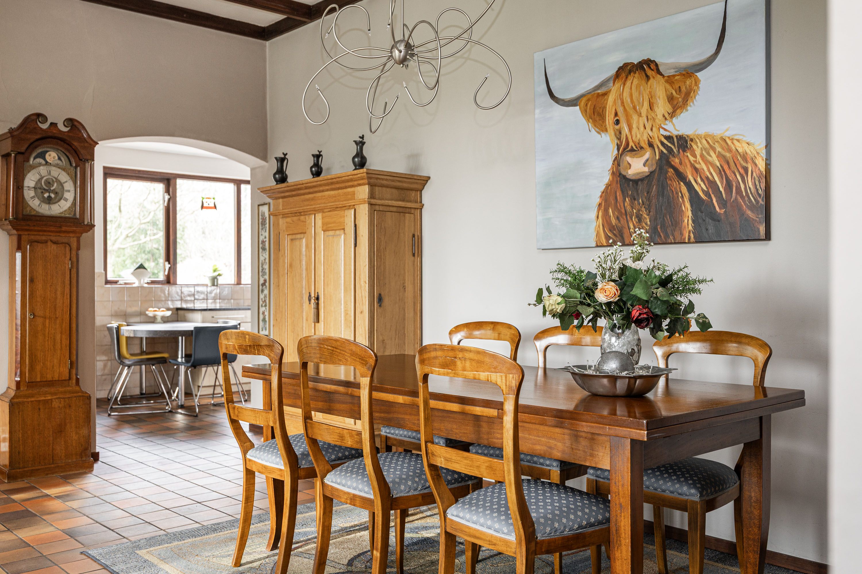 Adjacent to the living room, an open office space provides an ideal area for working from home. The kitchen is fitted with built?in appliances and offers space for informal dining. For larger gatherings, the area between the kitchen and living room is particularly suitable.