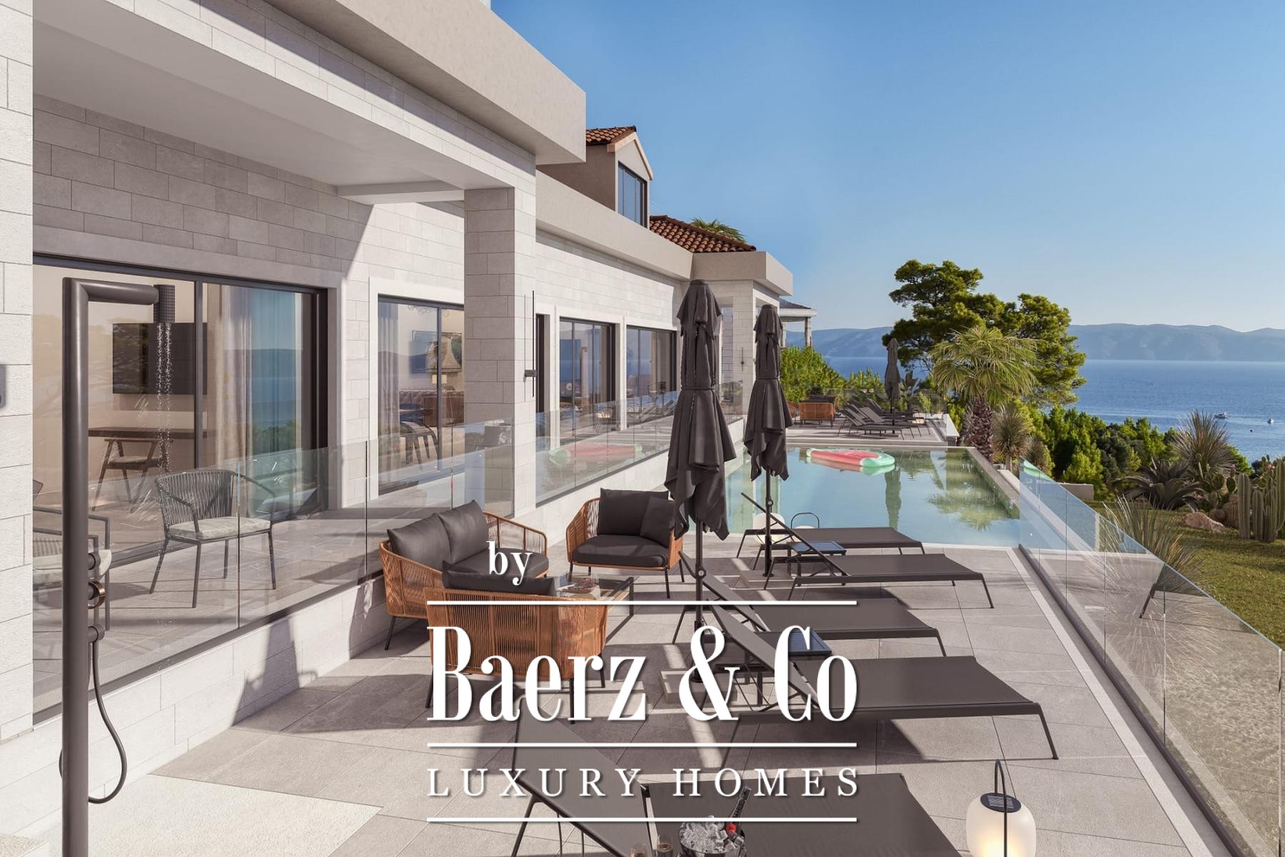 The main residence offers six bedrooms and six bathrooms, a thoughtfully proportioned kitchen, dining area, and an elegant living room. Natural rhythms of openness and comfort extend throughout the home, complemented by an attic space of 250 m² for additional flexibility. Outside, a heated 50 m² infinity pool meets views across the Adriatic, while an equal-sized indoor pool, sauna, jacuzzi, and gym provide year-round relaxation. A garage, game room, and laundry further the sense of considered luxury.