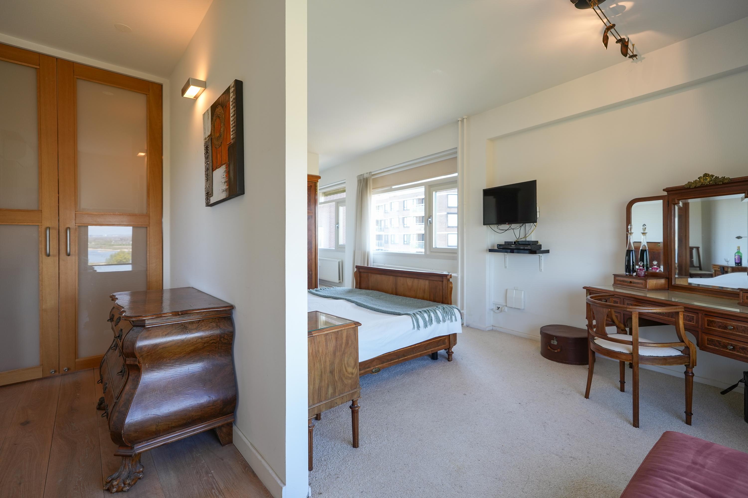 The apartment was created in 2009 by combining two separate units (numbers 44 and 46), resulting in an exceptionally spacious and well-organised home with a clear separation between the living area (44) and the sleeping wing (46). During this process, the apartment was fully and high-quality renovated. A solid oak floor in the living room and hallway, combined with clean finishes and abundant natural light, creates a warm and luxurious atmosphere. Large windows on all sides provide impressive sightlines and panoramic views over the Waal Bridge, the Ooijpolder and the city. Privacy, comfort and refined finishes come together here in a truly unique living experience.