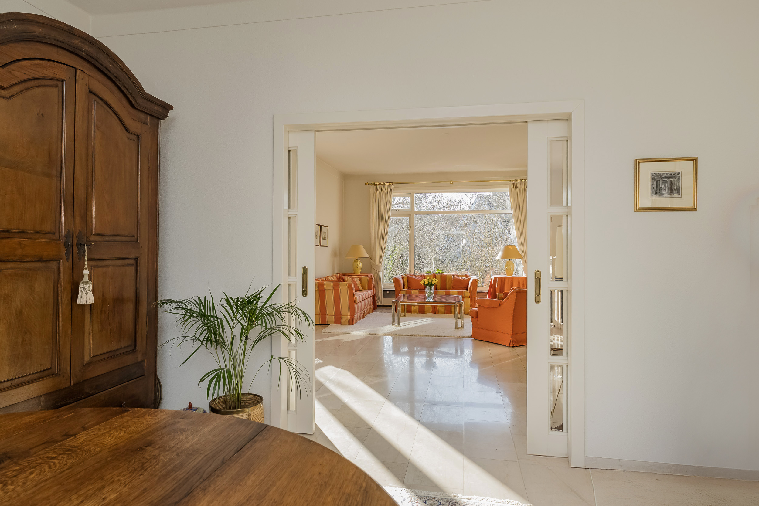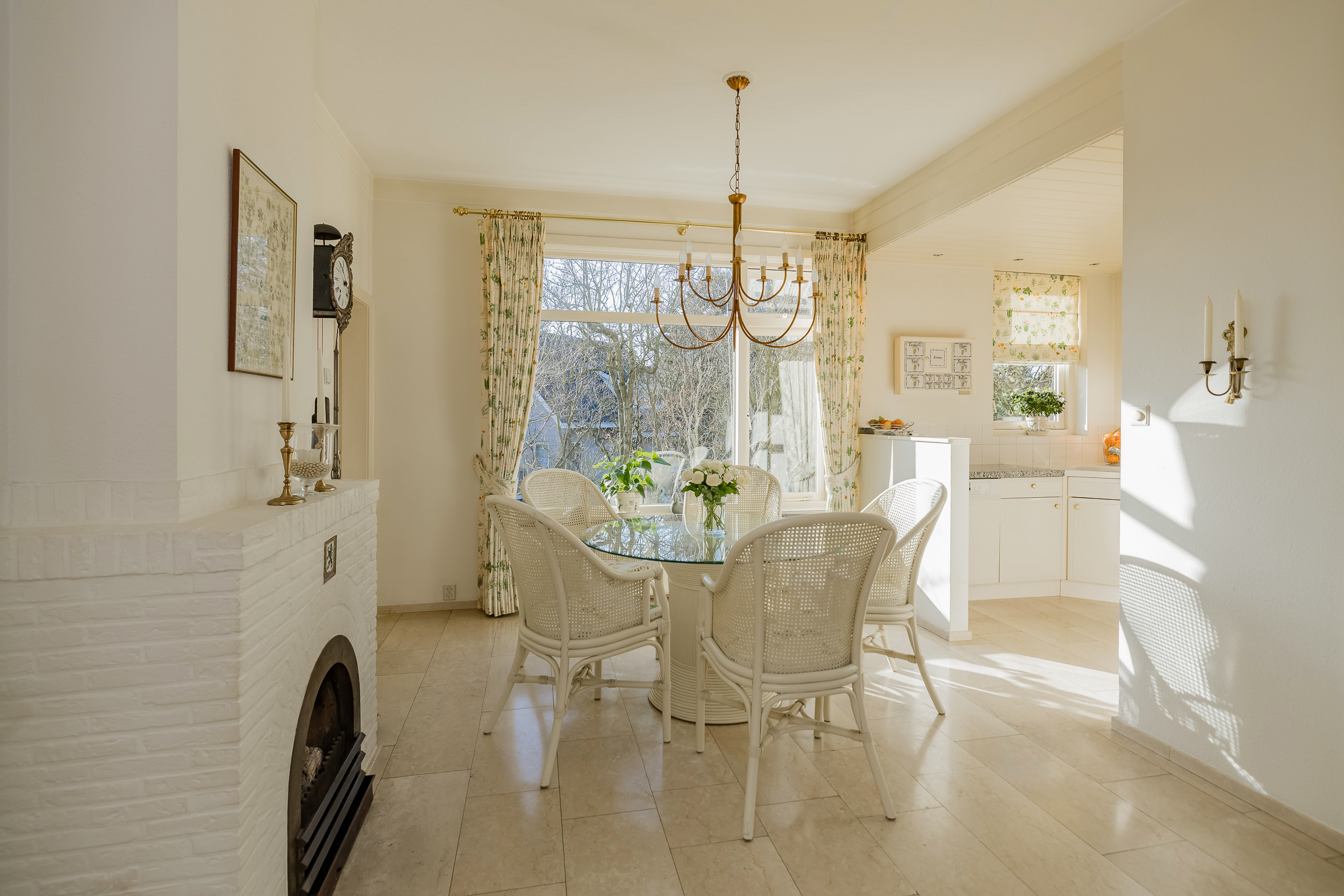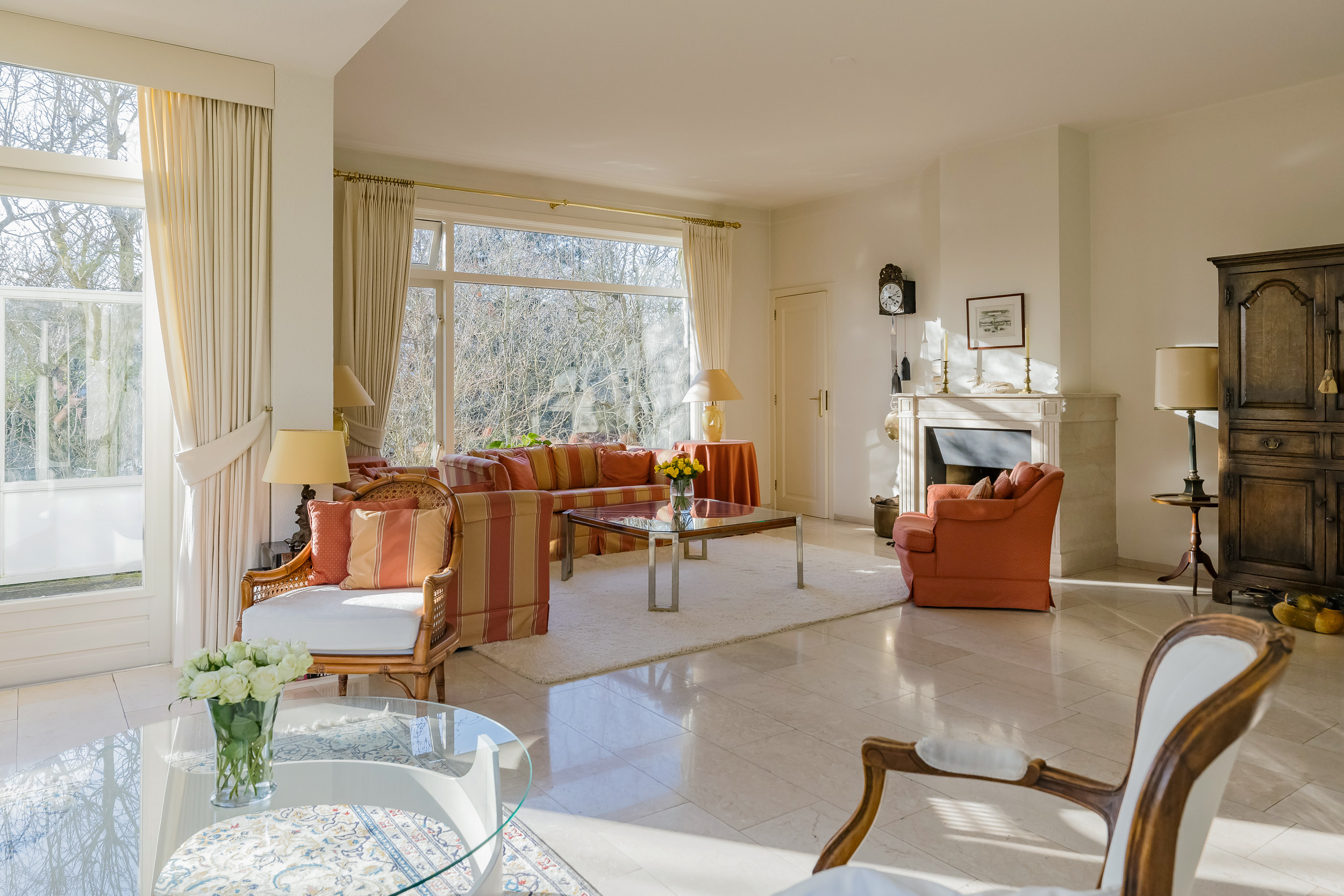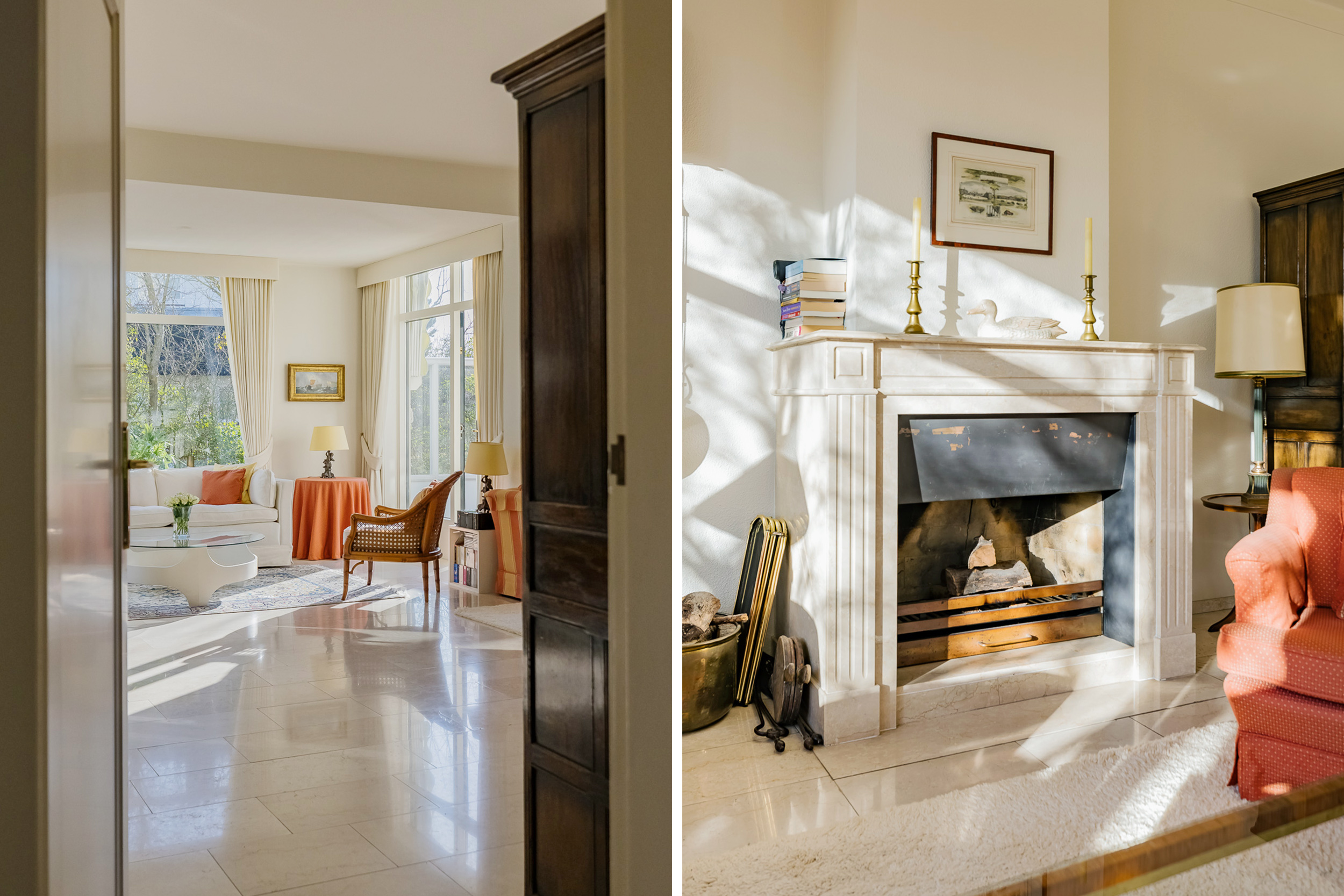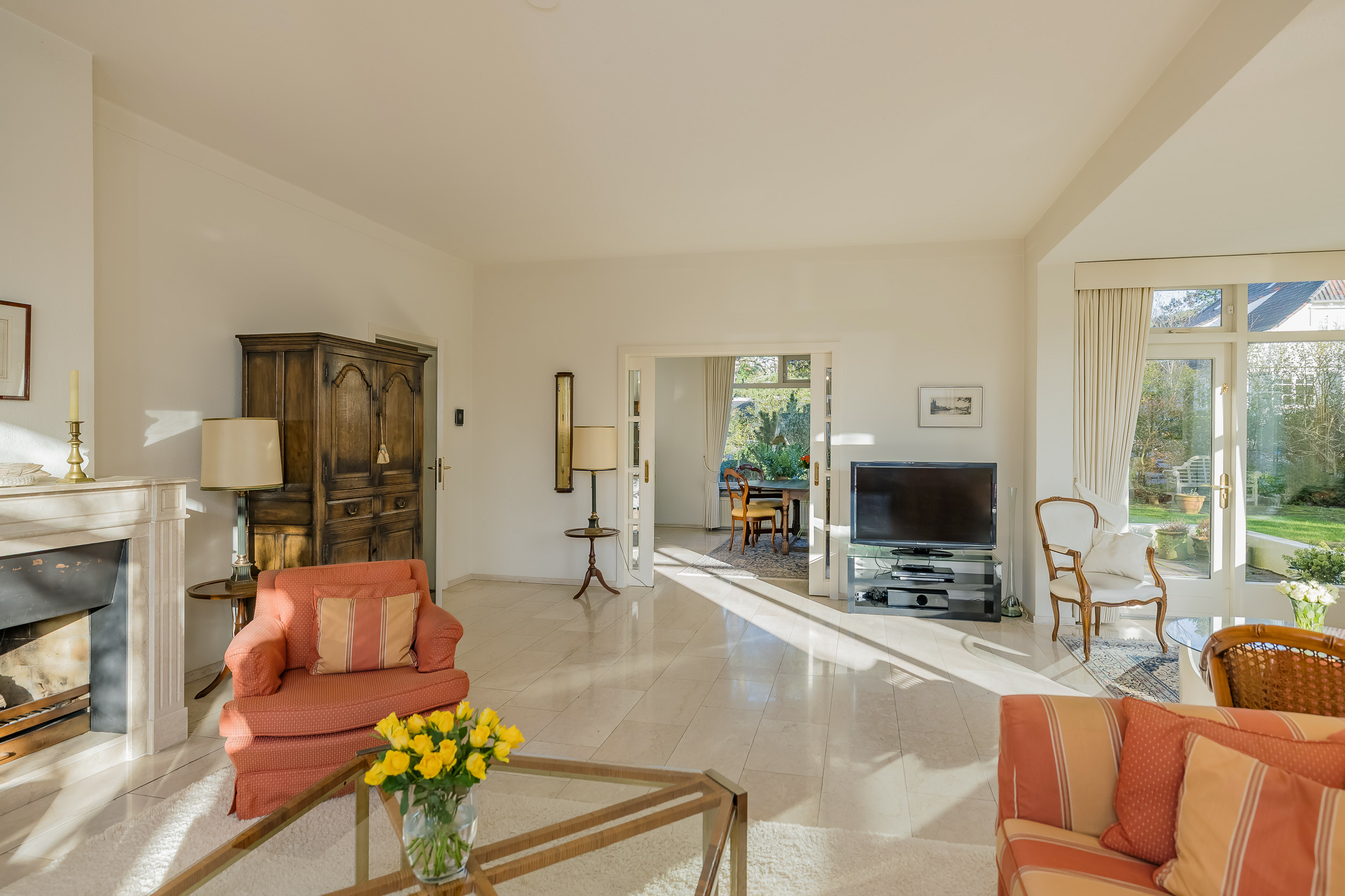 The spacious living room is a delightful living space with a warm, inviting atmosphere. The fireplace and elegant marble floor give the room character, while the doors from the living room provide direct access to the garden. The sun circles the house from morning to evening, creating a beautiful play of light.
