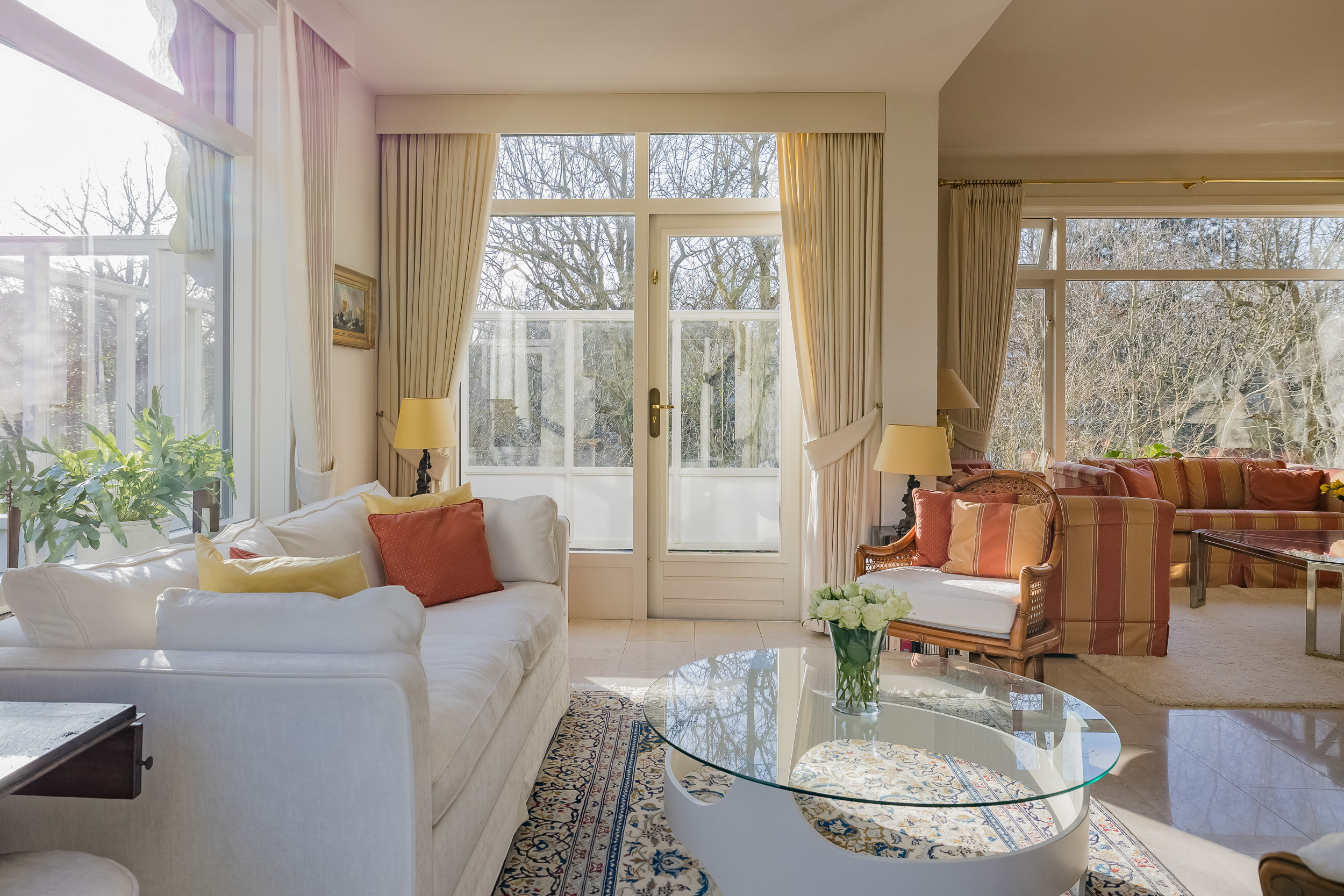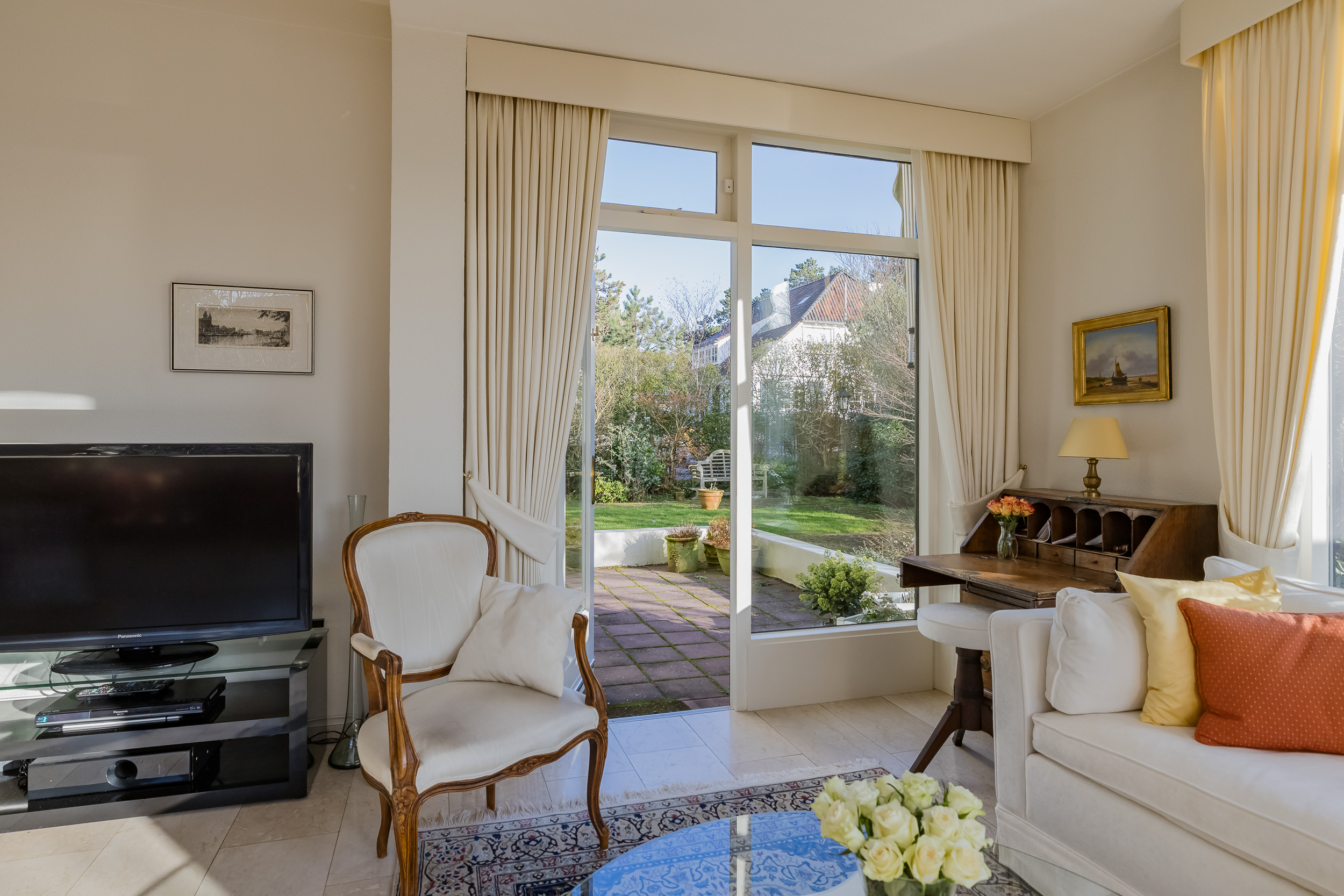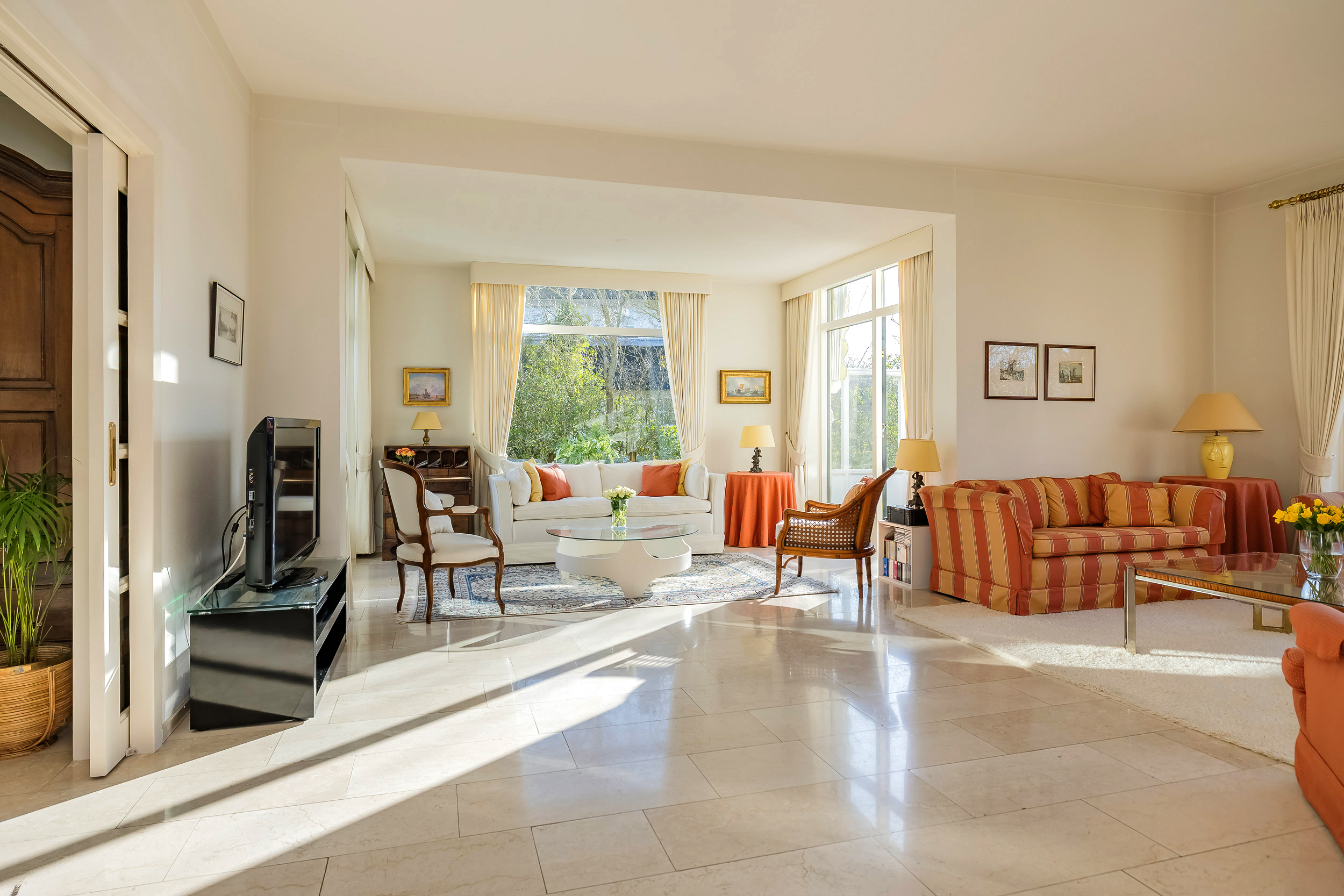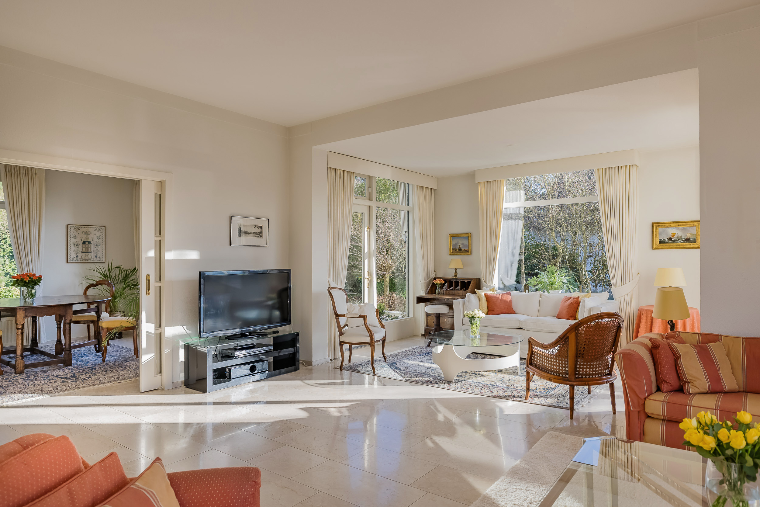 The spacious living room is a delightful living space with a warm, inviting atmosphere. The fireplace and elegant marble floor give the room character, while the doors from the living room provide direct access to the garden. The sun circles the house from morning to evening, creating a beautiful play of light.