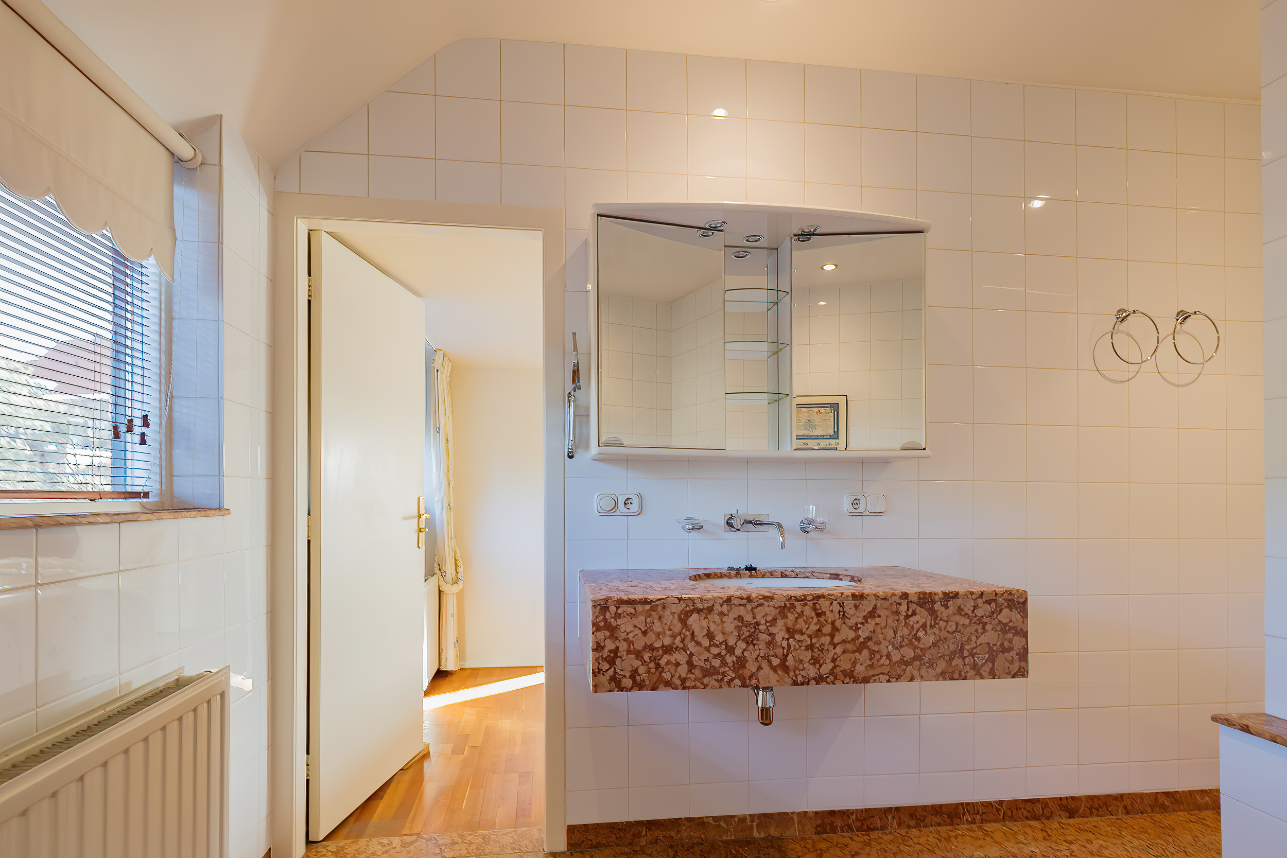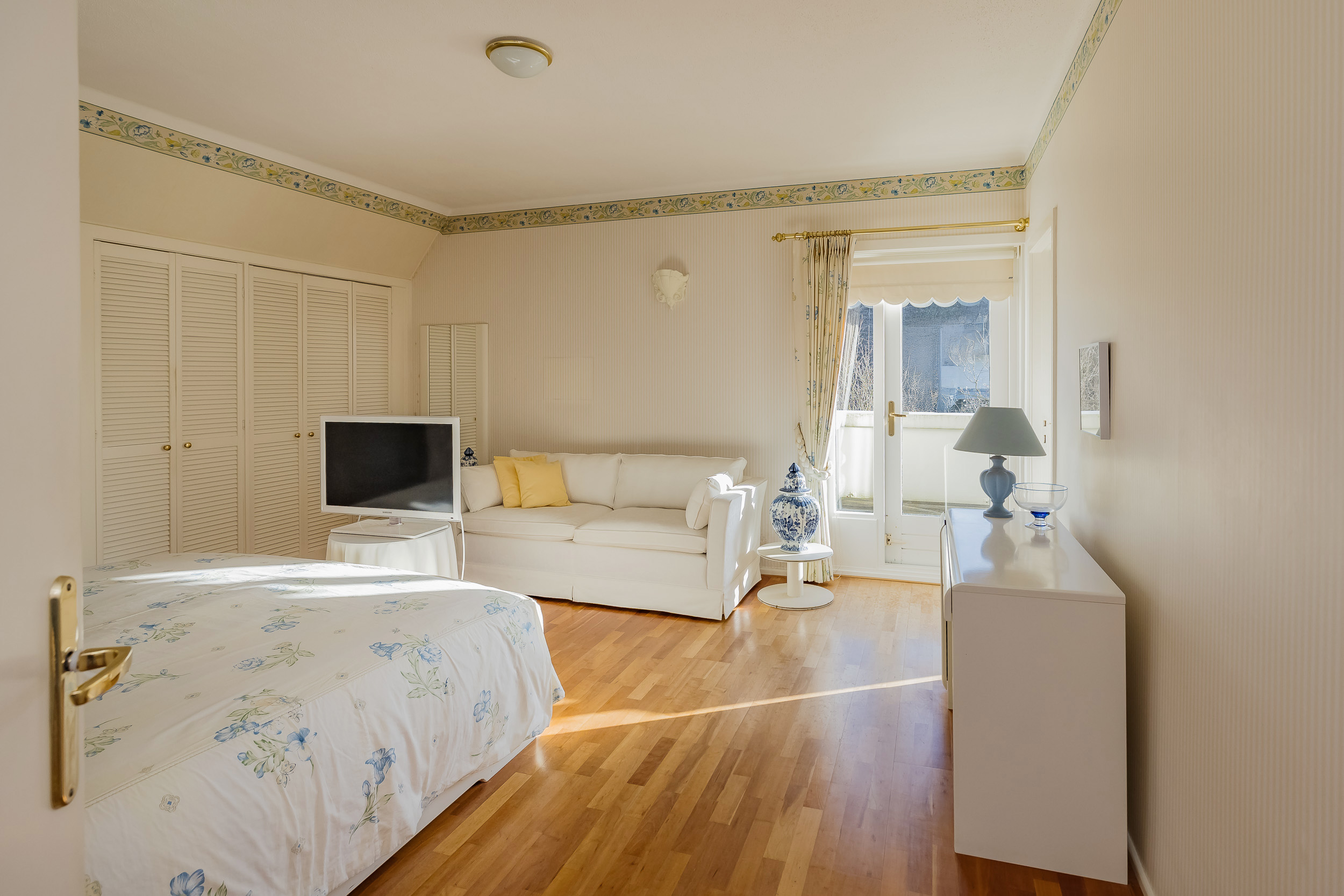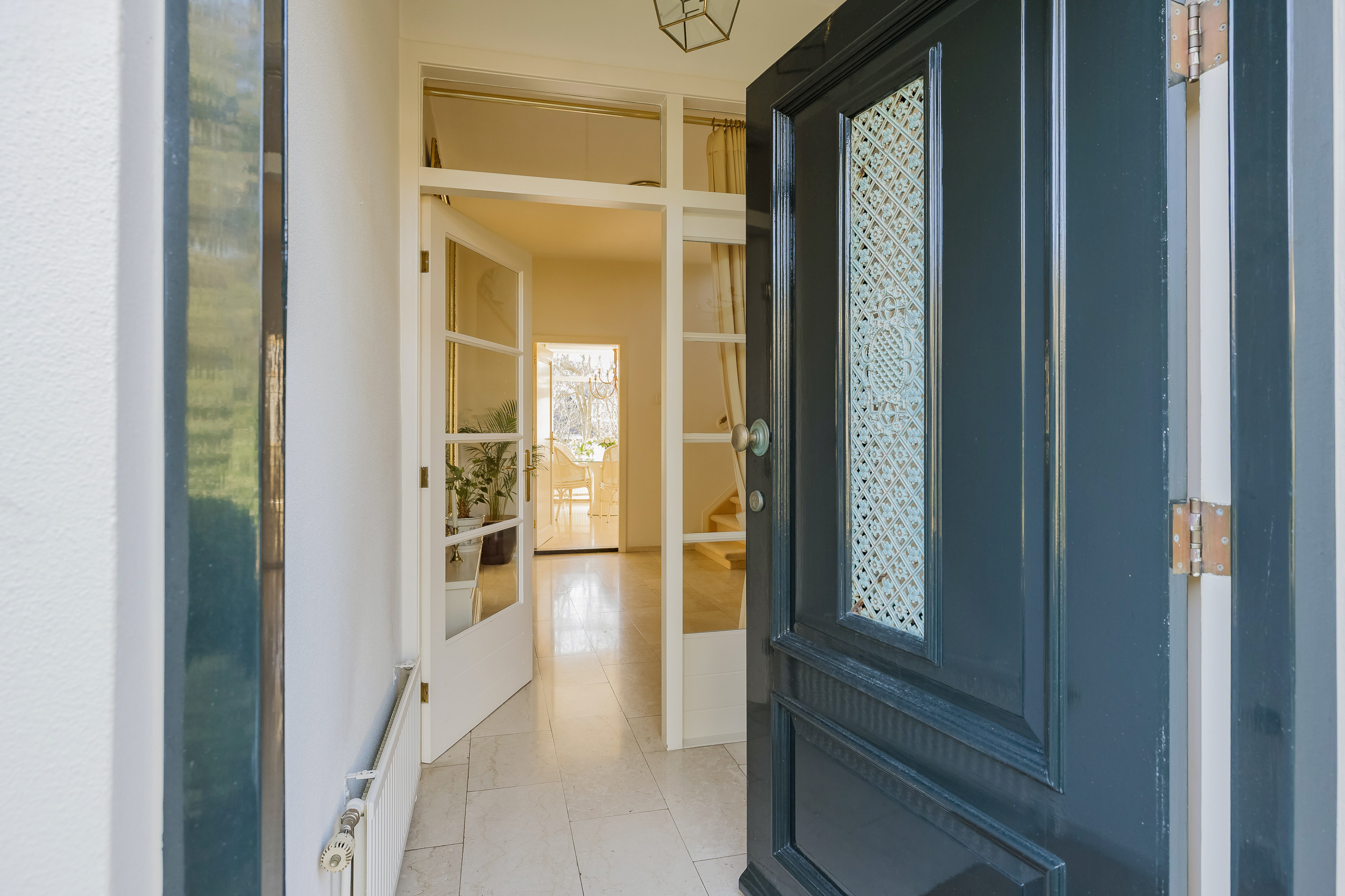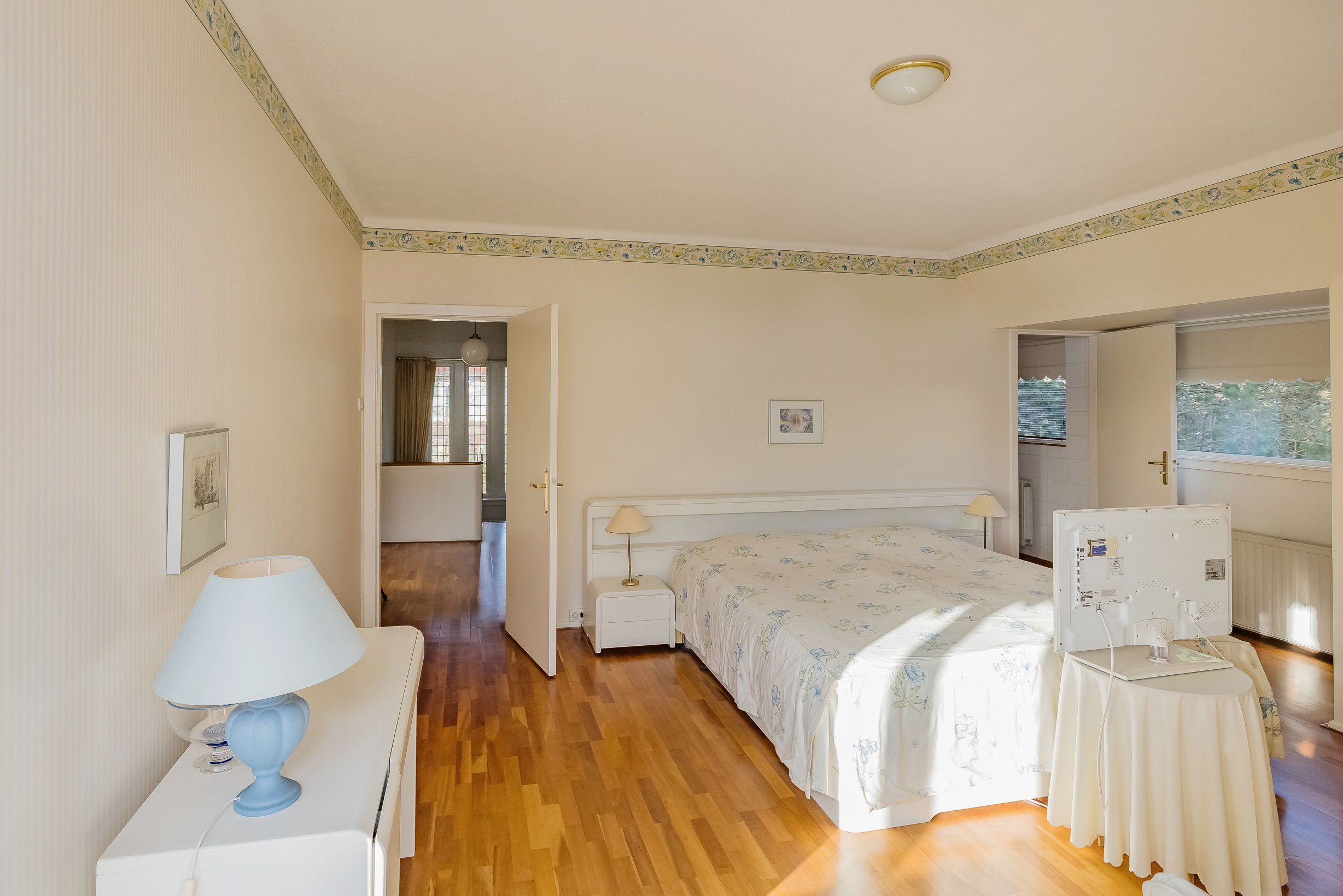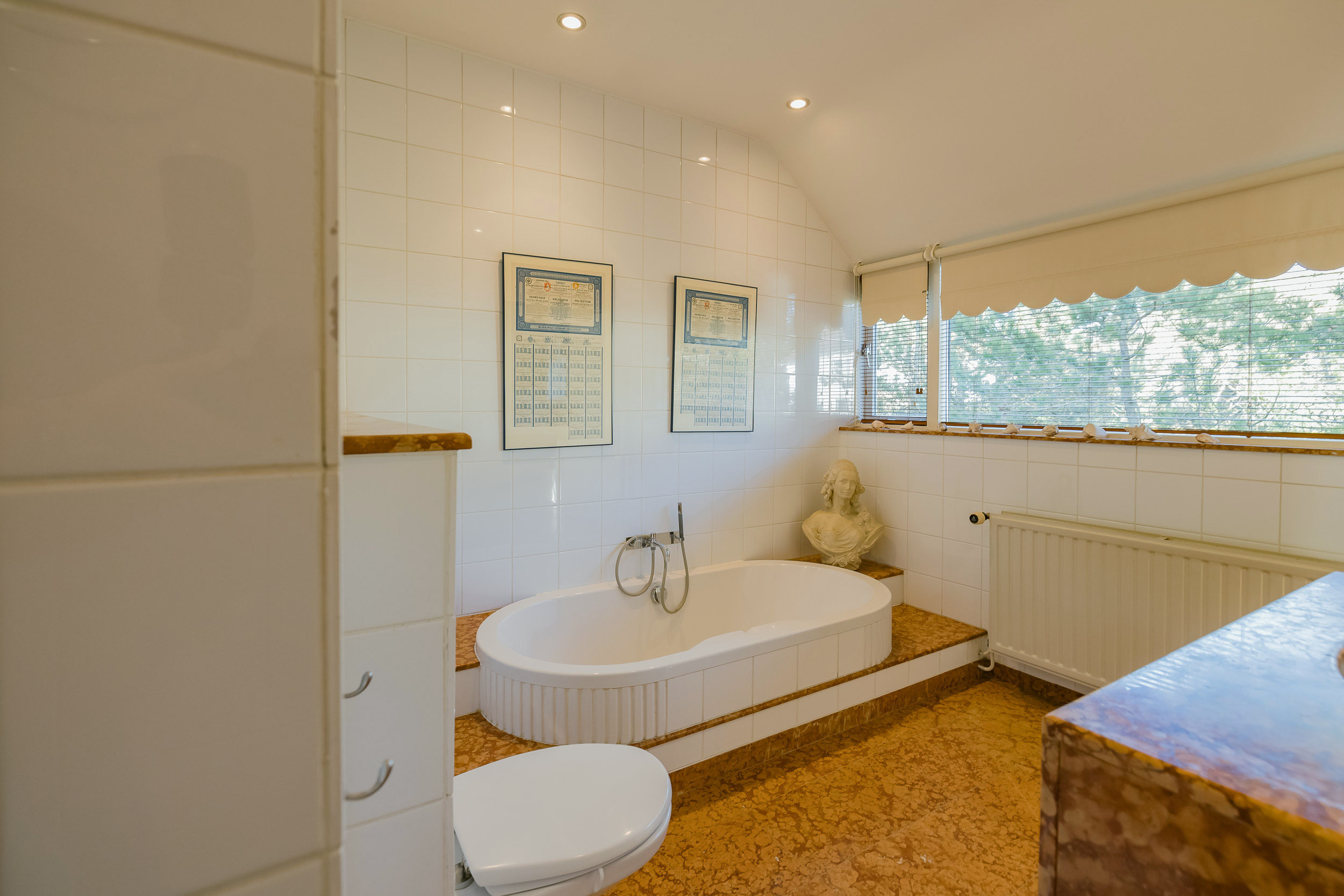 The spacious living room is a delightful living space with a warm, inviting atmosphere. The fireplace and elegant marble floor give the room character, while the doors from the living room provide direct access to the garden. The sun circles the house from morning to evening, creating a beautiful play of light.