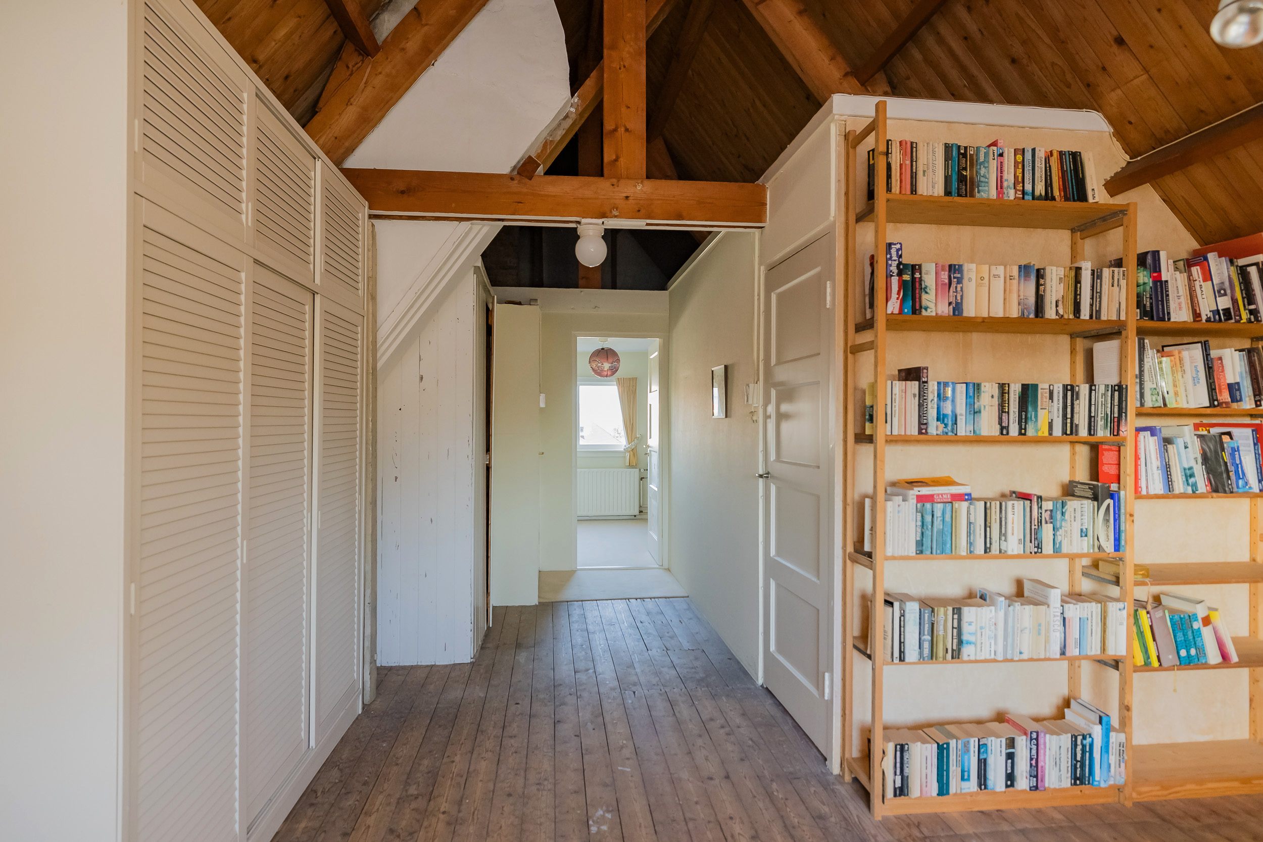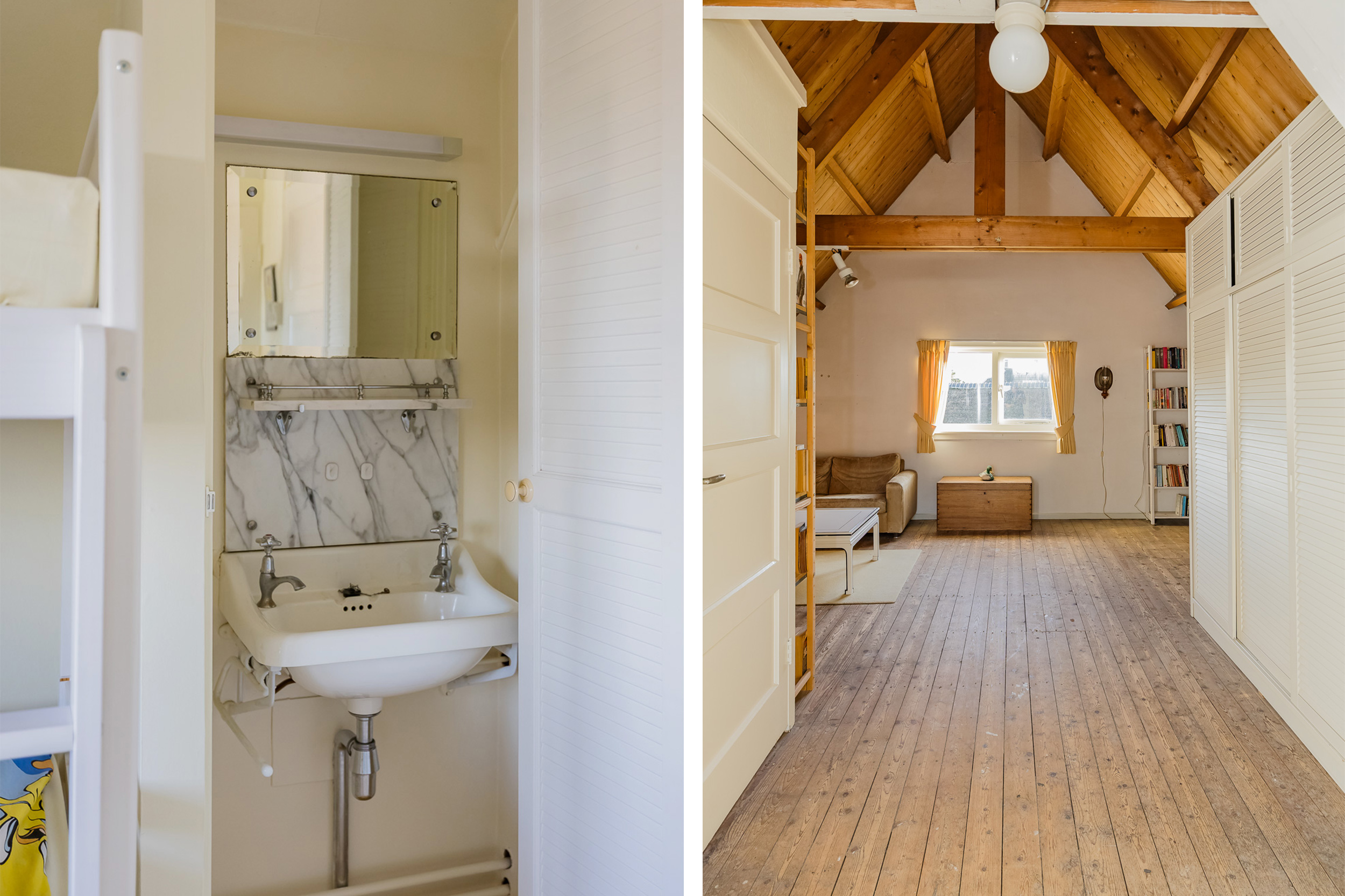 The staircase leads to a surprisingly spacious floor with a large landing/multifunctional room and a fifth bedroom with its own sink and deep closet. You will also find a darkroom here.