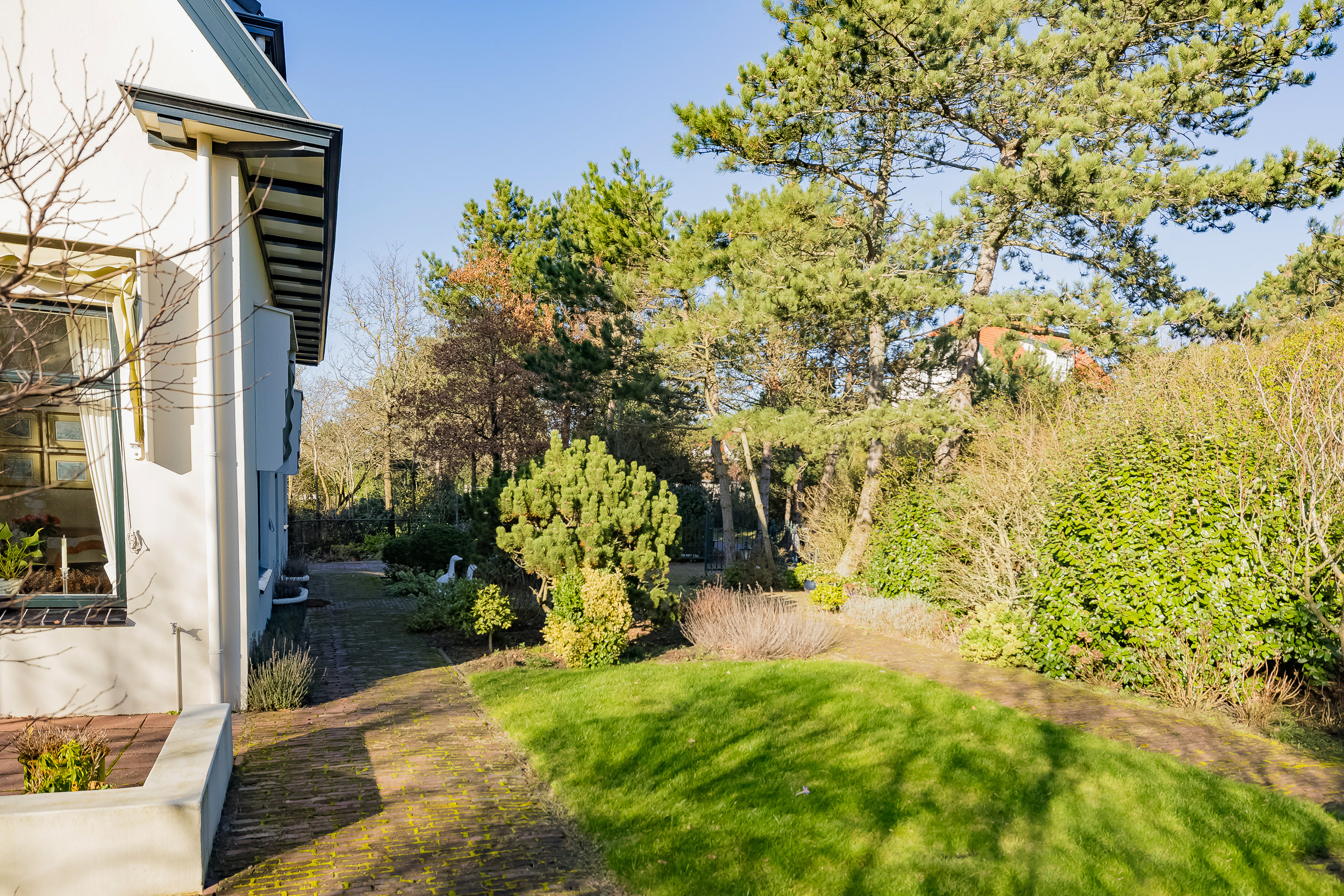 The sunny garden surrounding the house is lush and offers a sense of privacy.