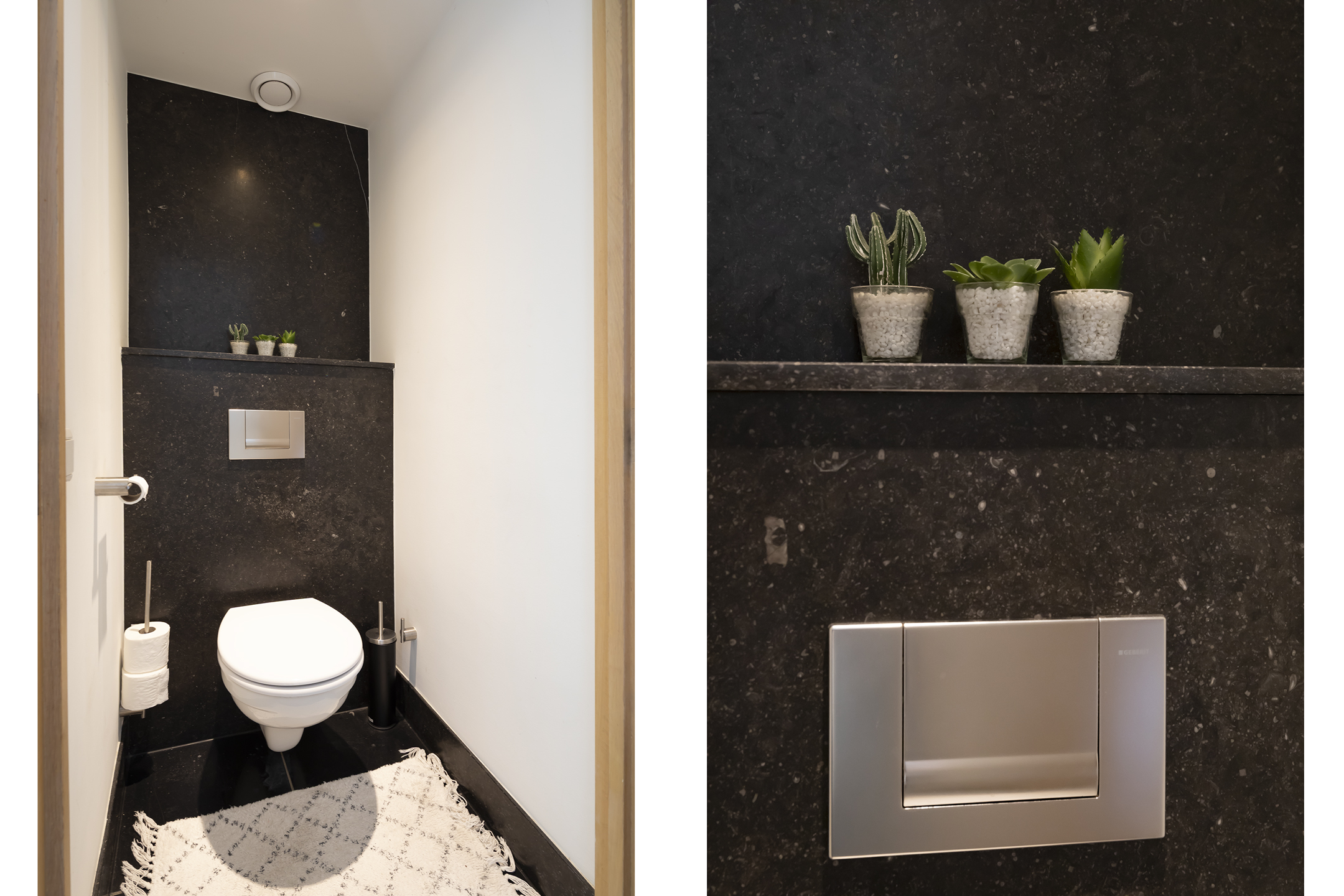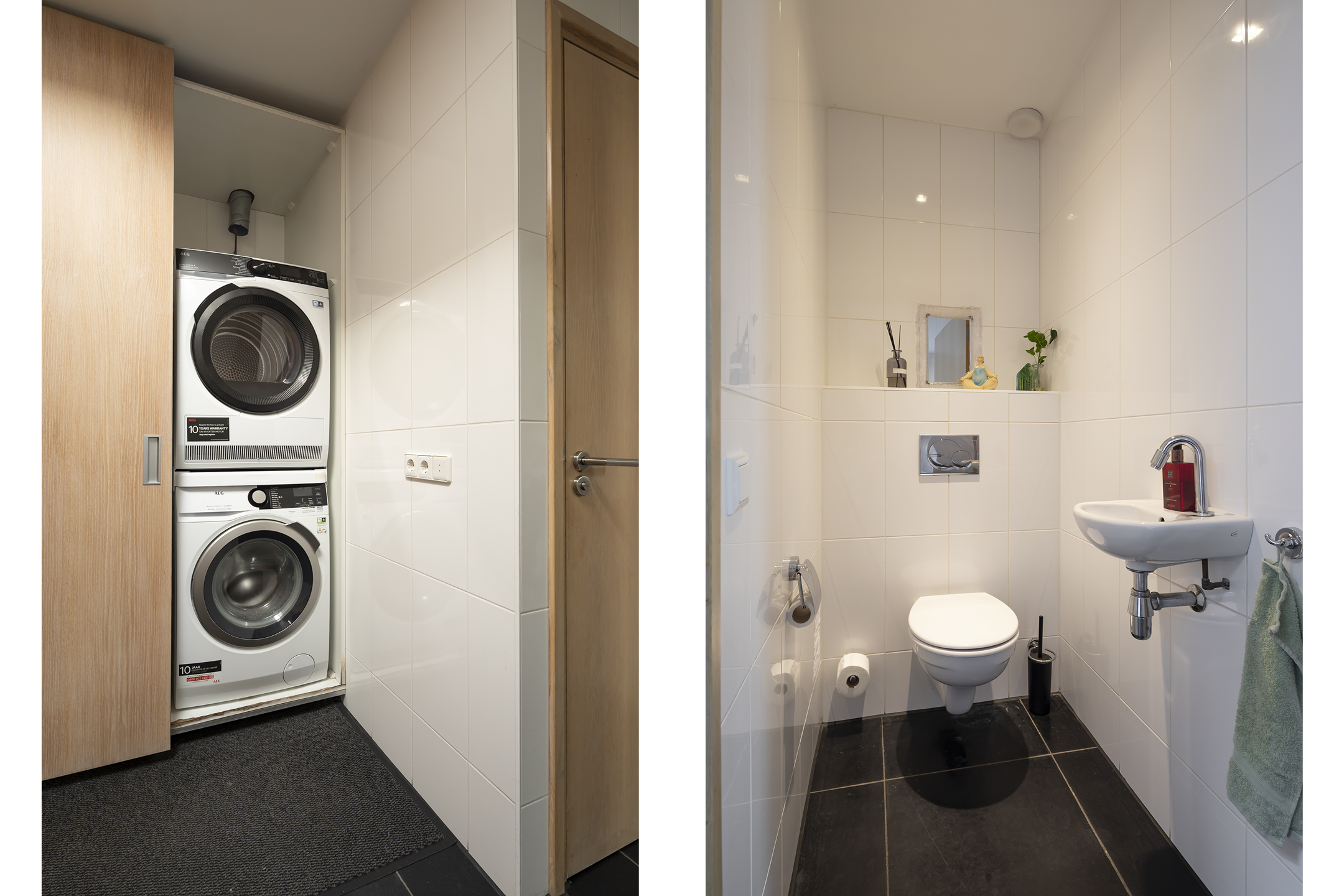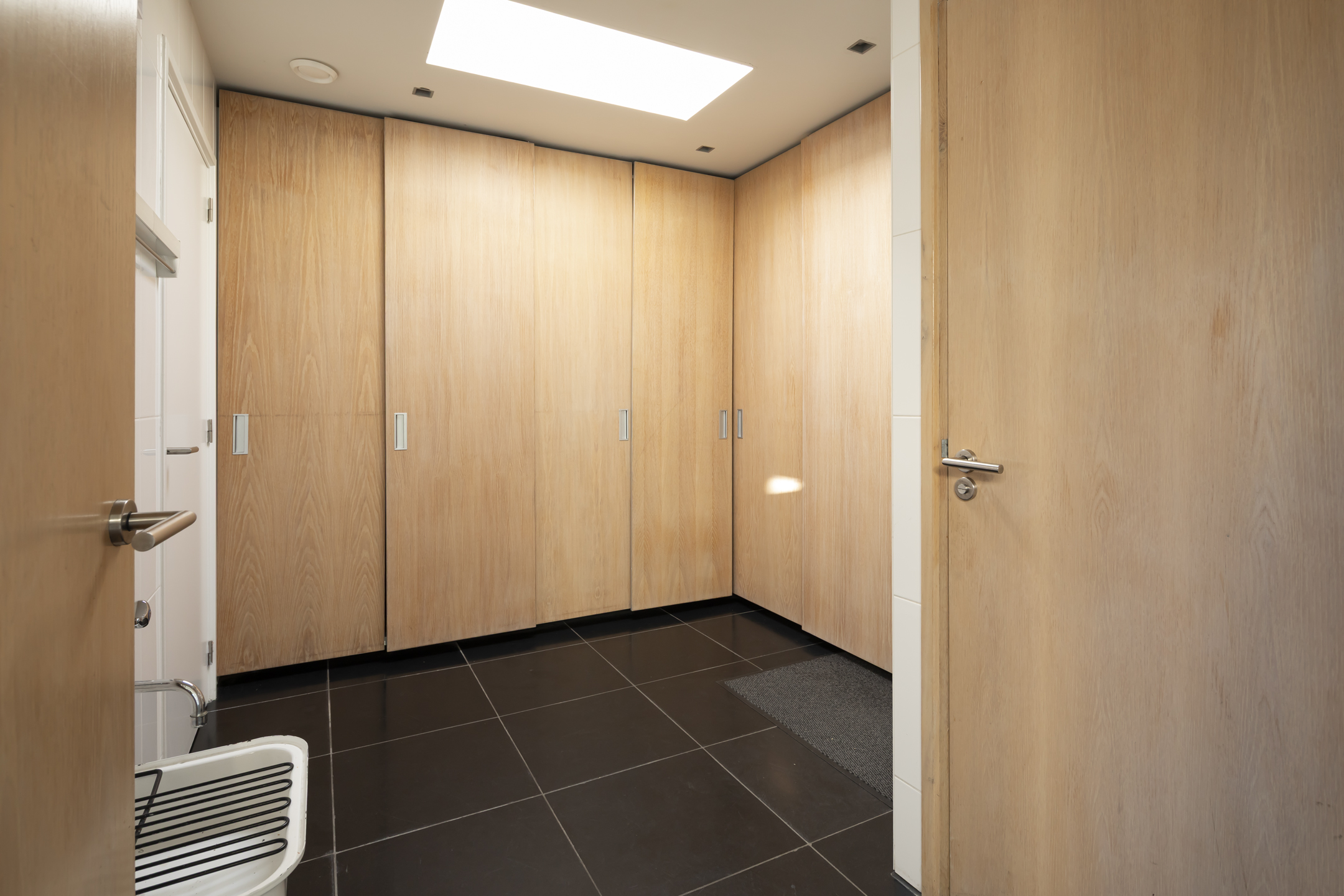 The rear of the house is primarily practical. Adjacent to the kitchen is an extra toilet with a small sink, a utility room with laundry facilities, and plenty of practical storage in the custom-made built-in wardrobes.