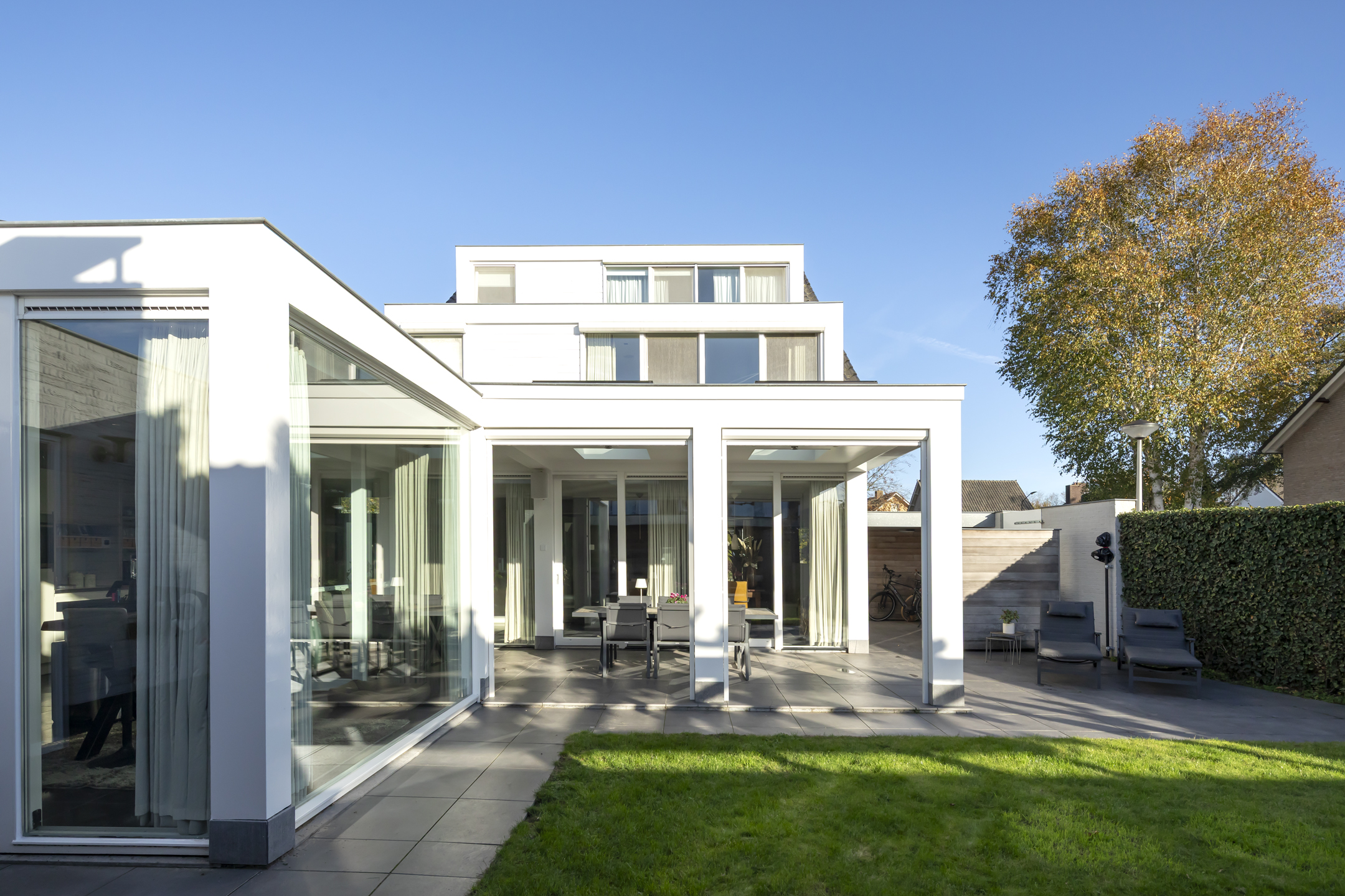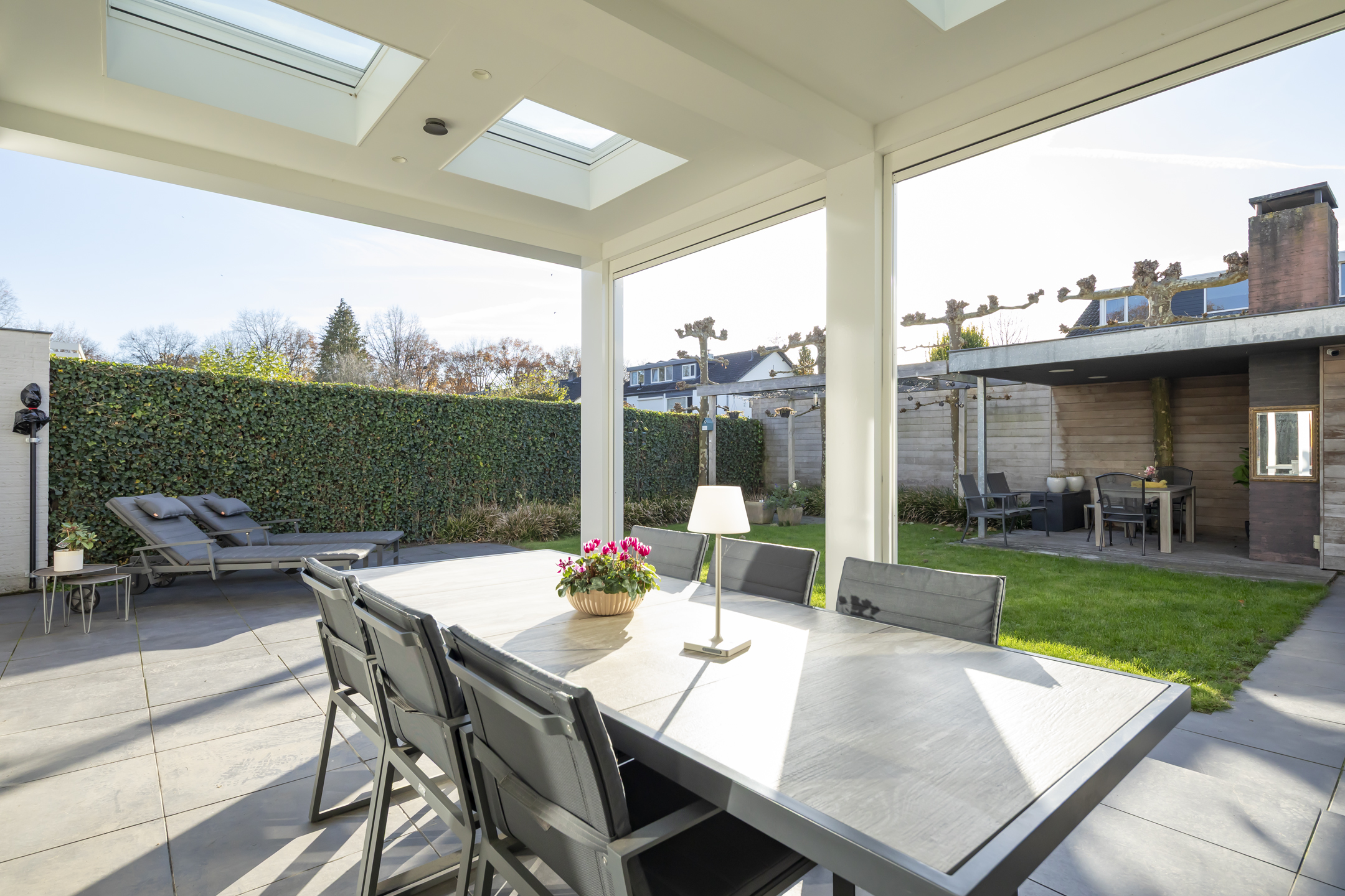 A lovely garden, facing the sunny southwest. You can enjoy the sun here year-round, both under the spacious covered terrace and in the lovely garden. The covered terrace is essentially an extra garden room, equipped with eight electrically operated Velux flat glass skylights, built-in speakers, and electrically operated screens, providing complete shelter from the wind. The covered area, adjacent to the house, is approximately 25 m².