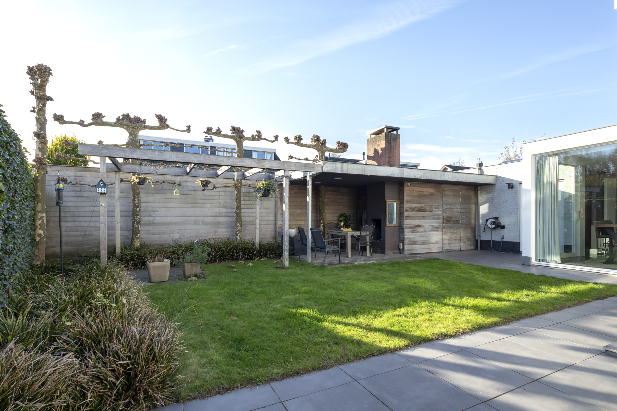 The covered area at the back of the garden features a lovely outdoor fireplace with a TV connection. It's also a great place to relax. That's another great thing about this house: everyone can have their own little spot. If someone wants a quiet moment with the fireplace lit, that's possible, while someone else can have their own party with some nice background music—something for everyone.