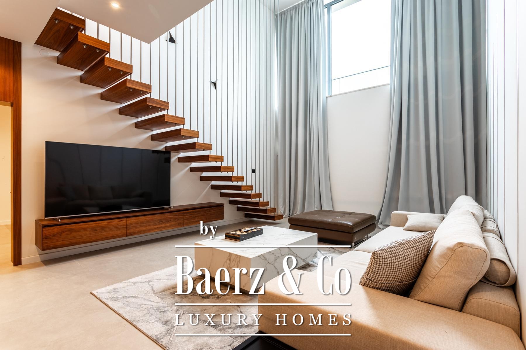 Inside, four floors accommodate four bedrooms and four bathrooms, each level revealing thoughtful design, custom furnishings, and finely tuned amenities. The basement is dedicated to wellness and leisure, with a wine cellar, sauna, games room, gym, and laundry, adding a quiet sense of luxury to daily life. The ground level flows onto a terrace with a private pool and sunbathing area, while upper floors present a contemporary kitchen, dining area, and a spacious living room with seamless balcony access.