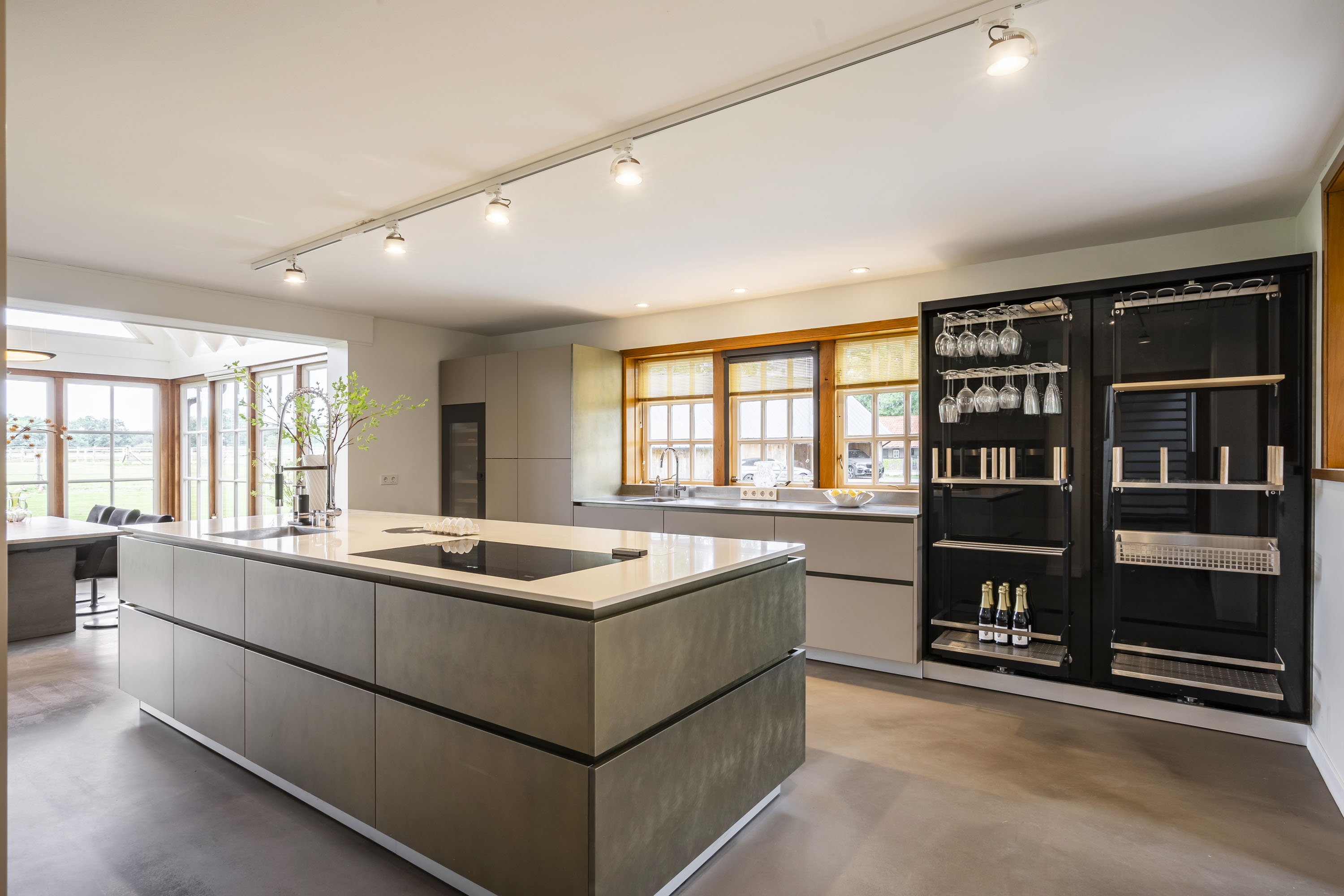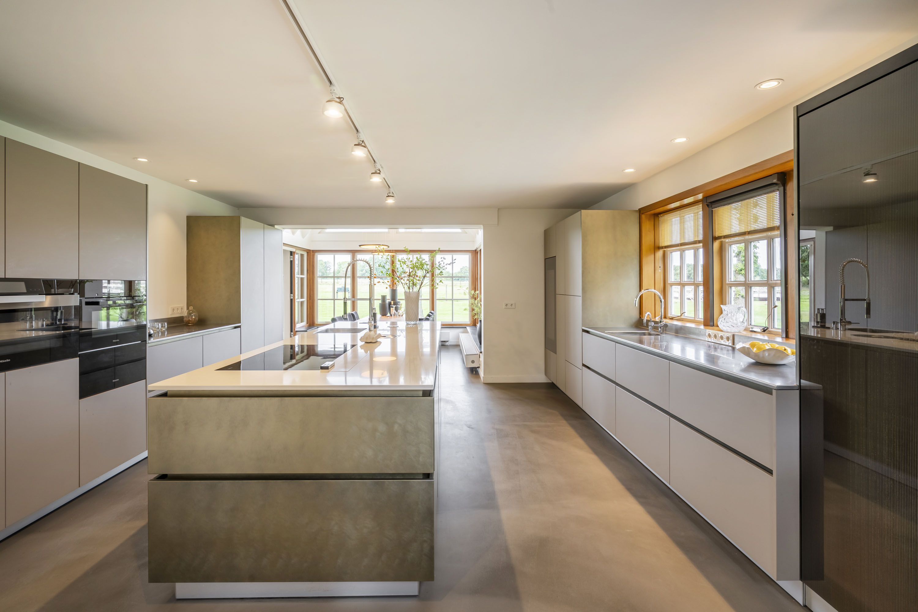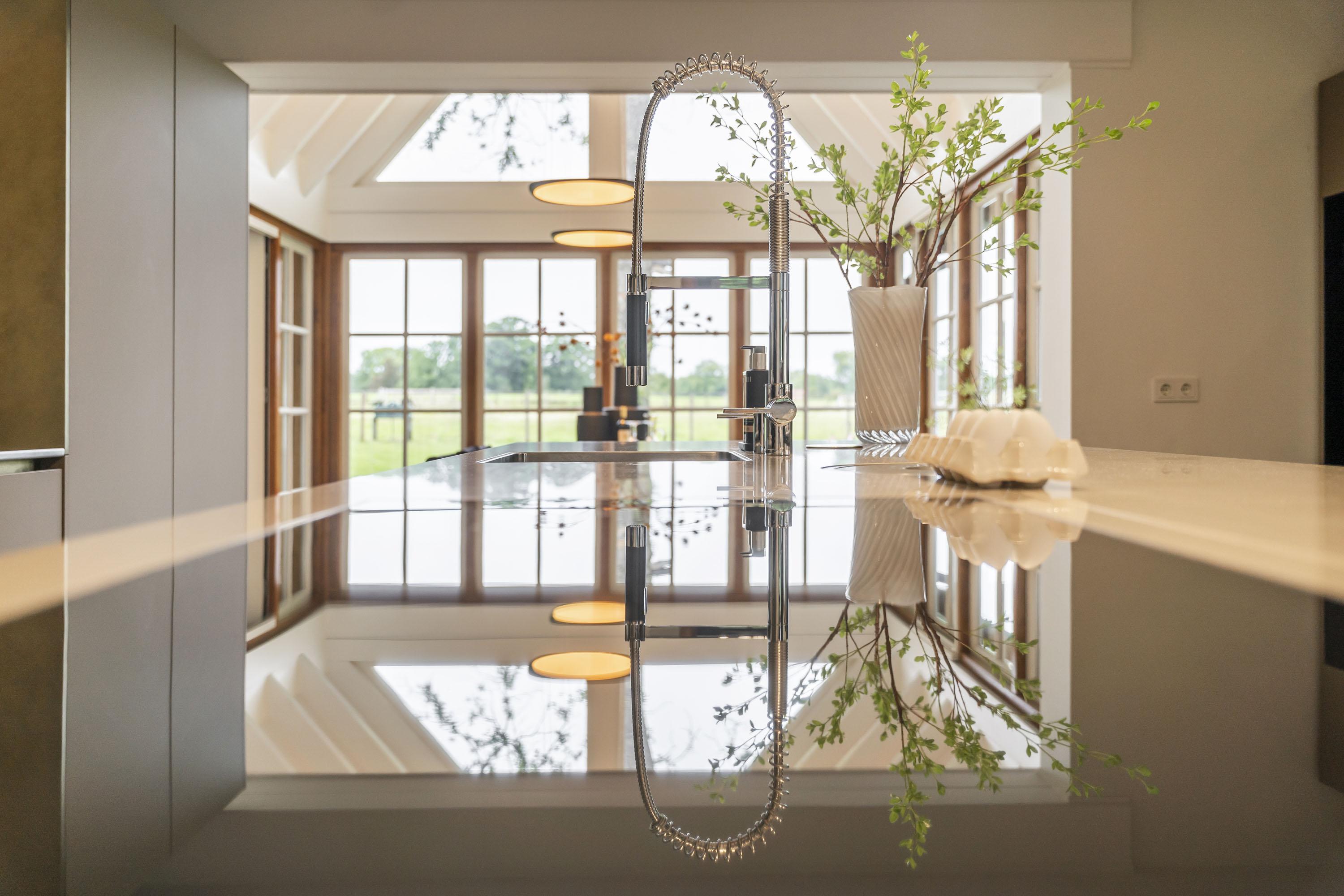 • Generous live-in kitchen with modern cooking island and fitted cabinetry, equipped with composite and stainless steel countertops and high-end built-in appliances including an oven, steam oven, microwave, refrigerator, freezer, dishwasher, Quooker and wine cooler. Ample space for dining with family and friends