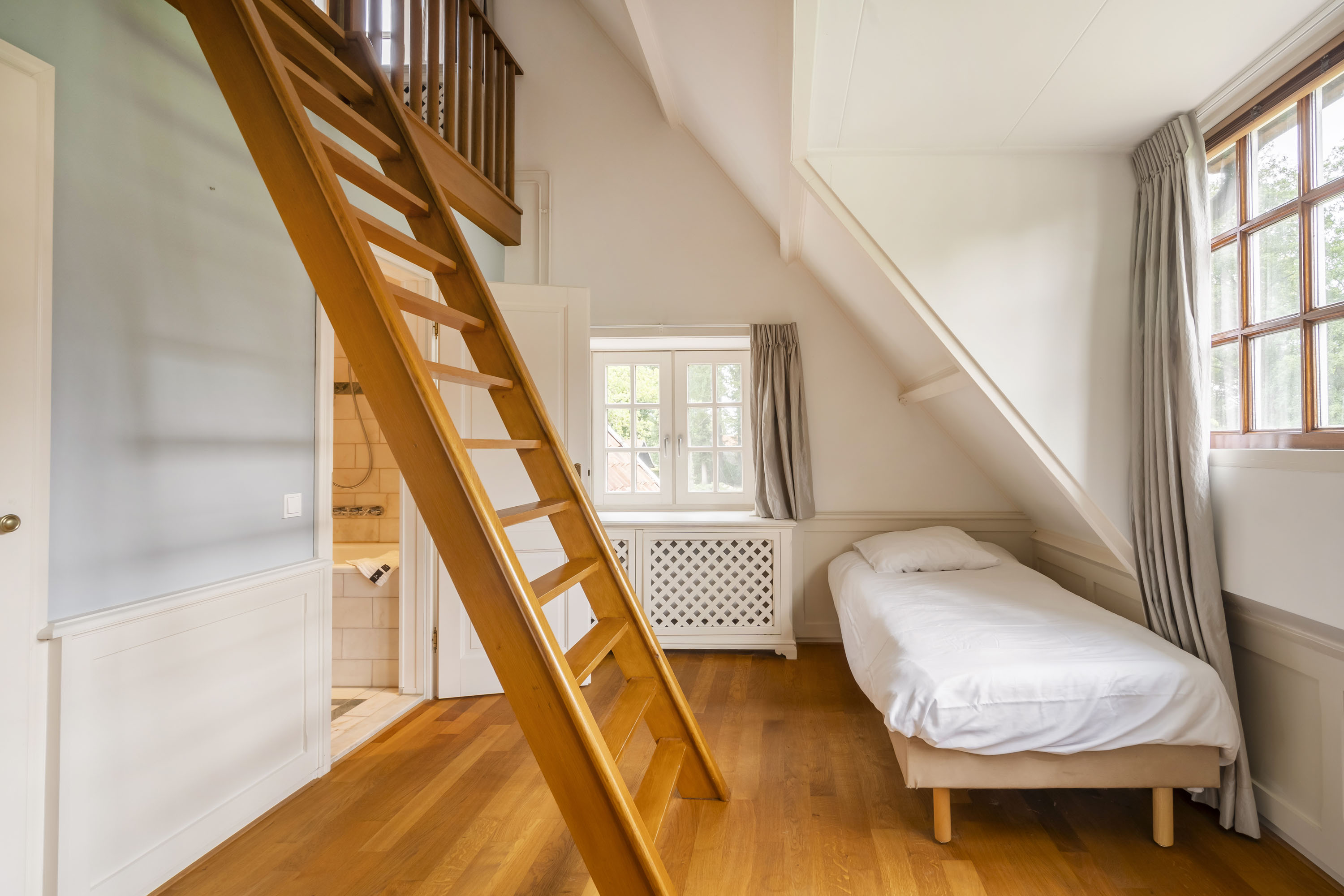 • Bedroom with playful loft space accessed by fixed stairs and a bathroom with bath, shower, toilet, washbasin and designer radiator
