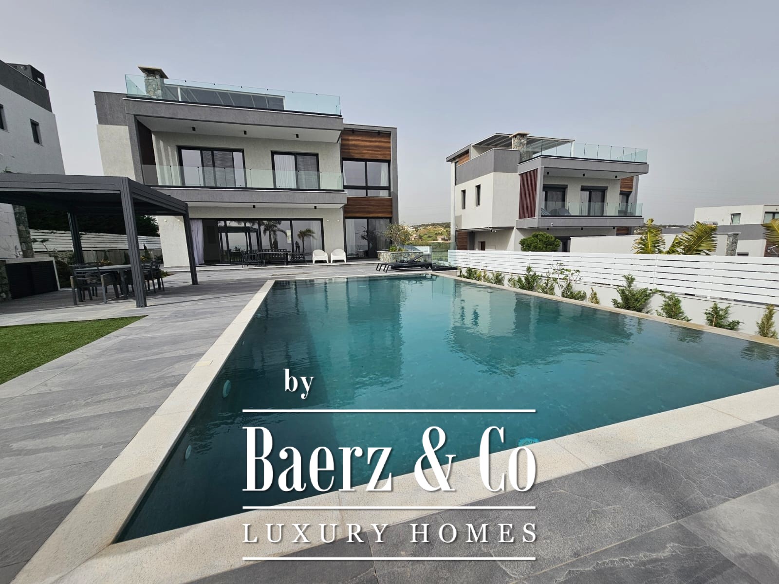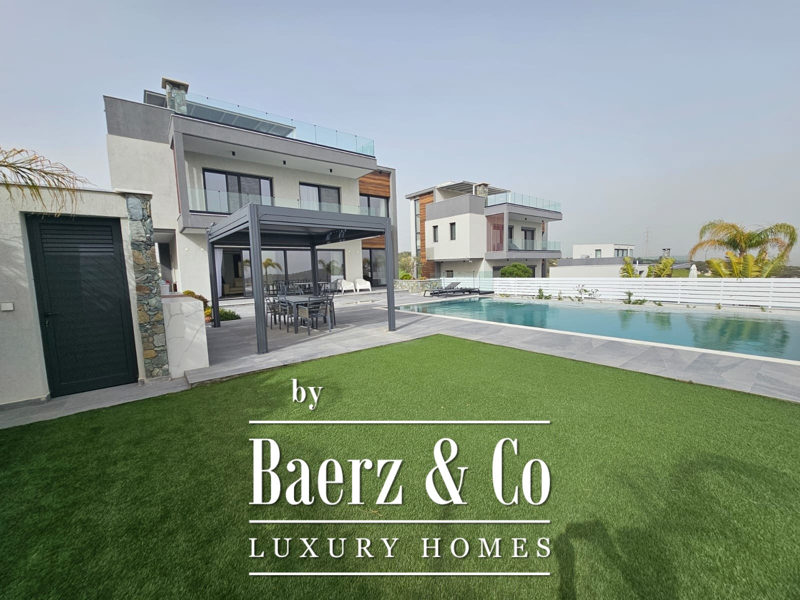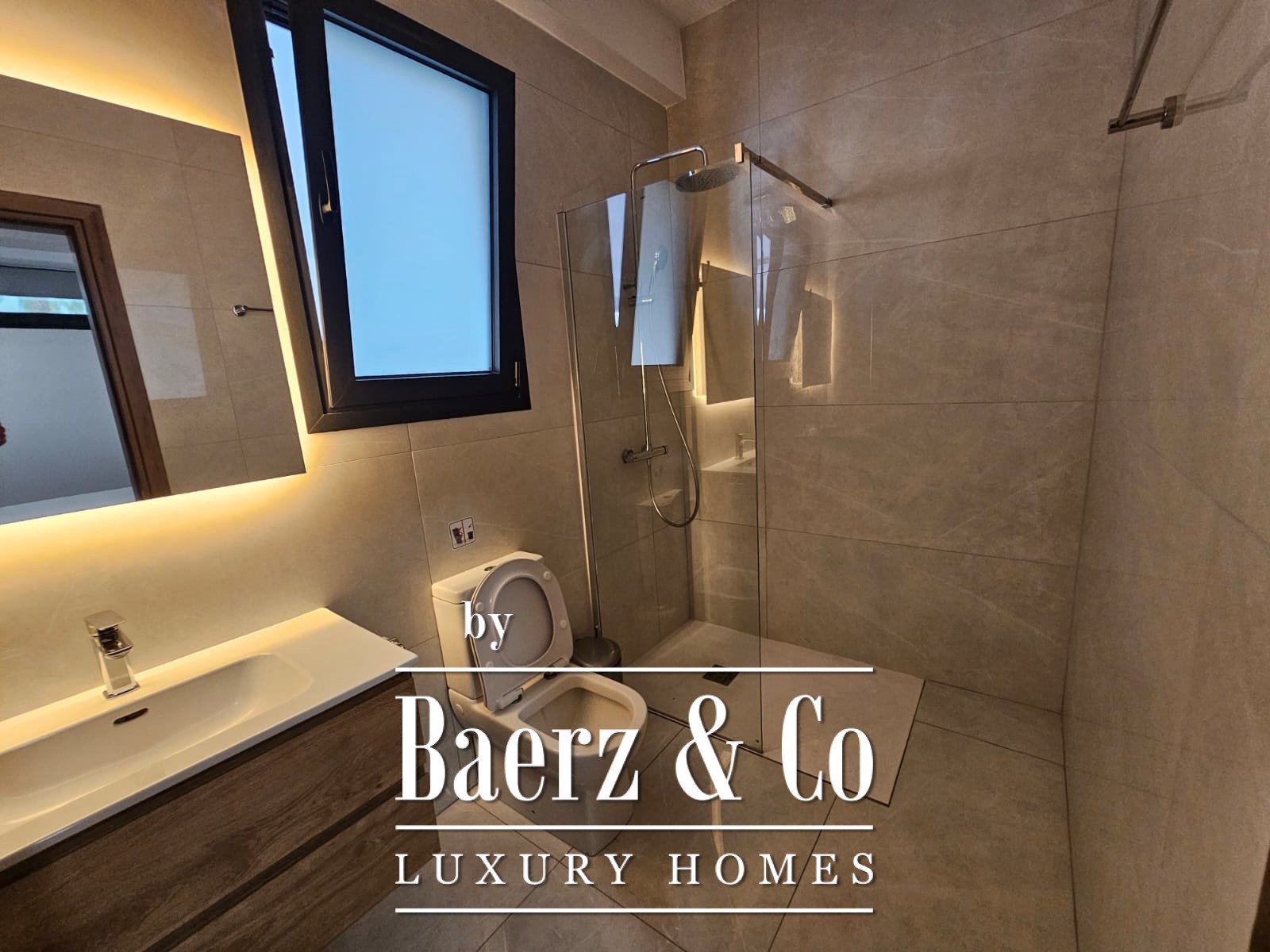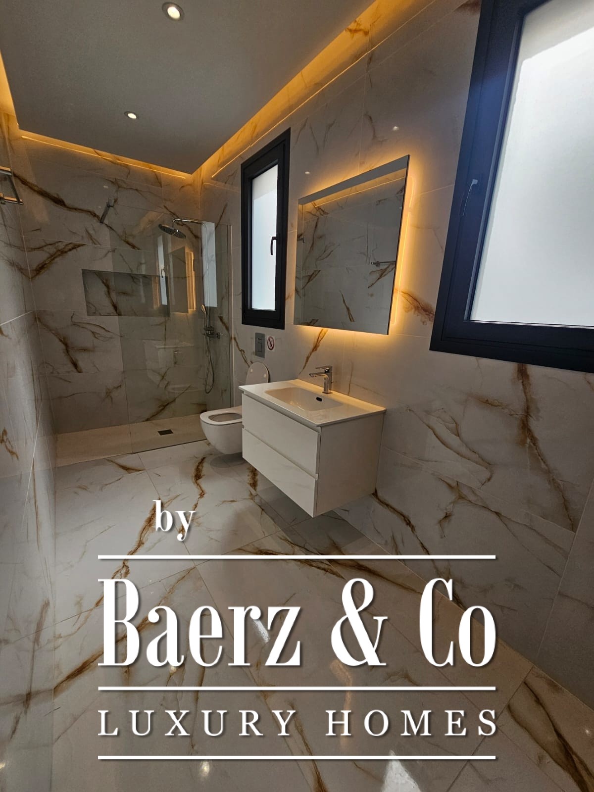 The primary living areas are oriented for natural light, while the villa’s layout accommodates four bedrooms, three bathrooms, and two guest WCs. Premium materials include tiled floors and aluminium double-glazed, energy-efficient windows. Underfloor heating, air conditioning, a ventilation system, and sound and thermal insulation ensure year-round comfort. An internal elevator and staircase connect all floors, emphasizing convenience and accessibility.