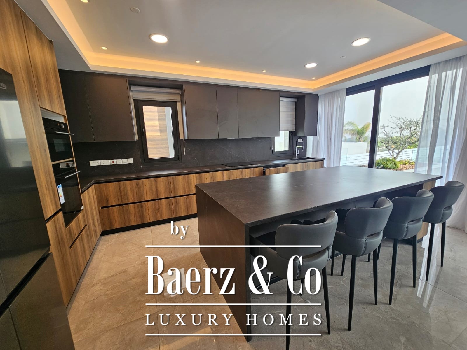 Outdoors, the landscaped garden frames a private swimming pool and BBQ area, complemented by a poolside shower and toilet. Eight parking spaces, ample storage, a security door, and a dedicated service room complete the offering. This villa defines high-end living for those drawn to the unique panorama and tranquility of Parekklisia.
