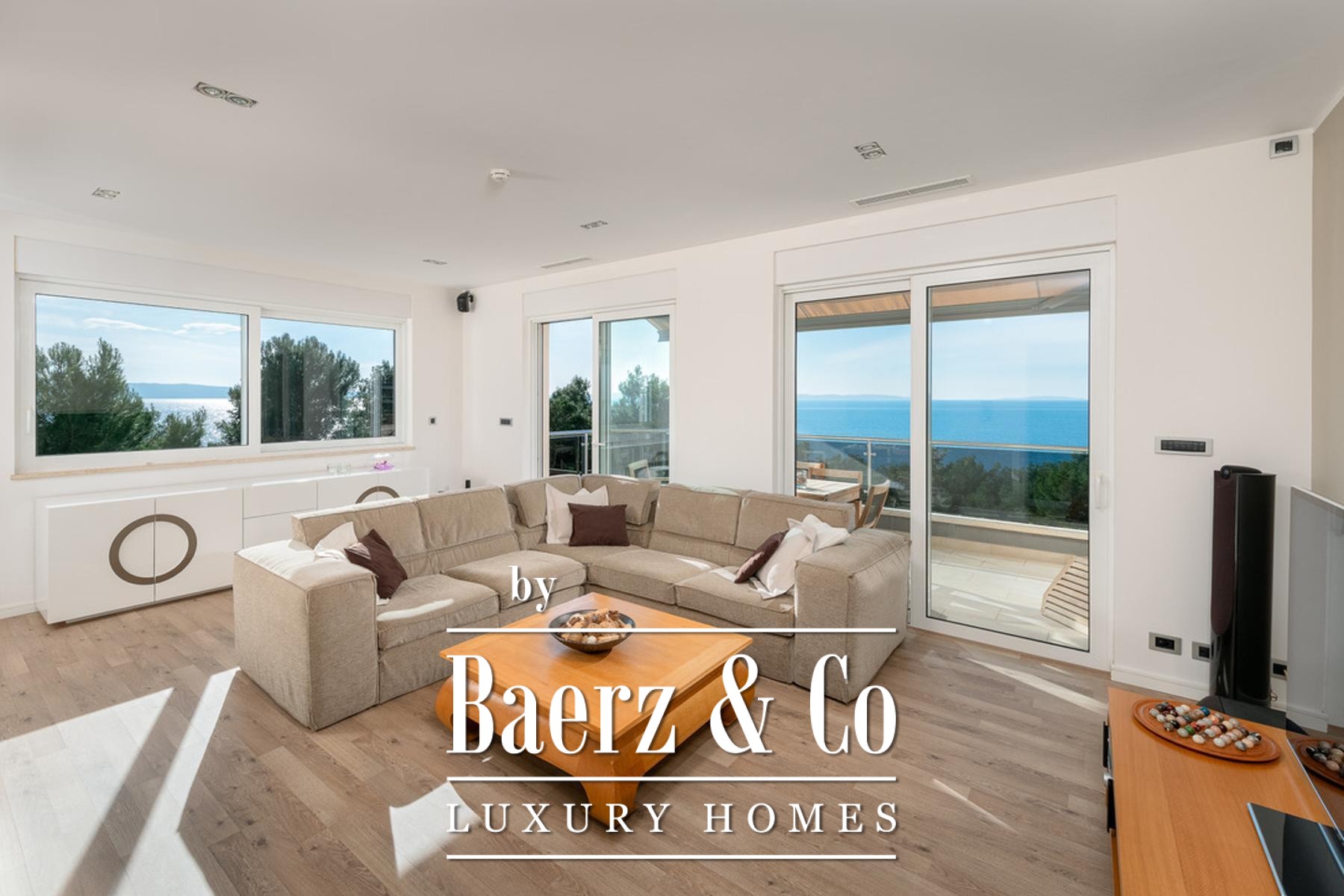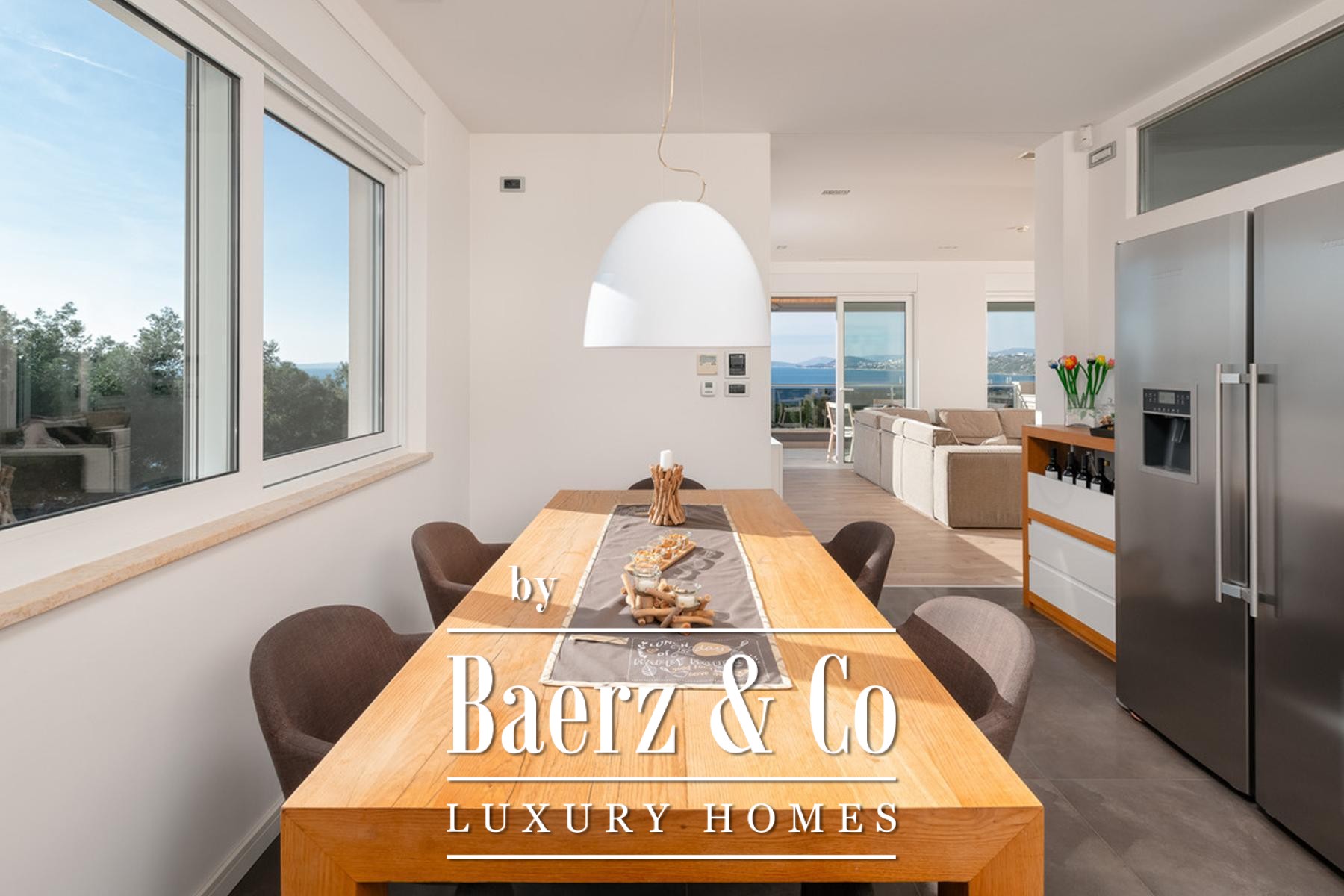 Three terraces, totaling 18.38 m², frame panoramic vistas of the Adriatic, the outlook protected and unchanging. The living areas are bathed in natural light, accentuated by extensive glazing and optimal orientation. A dedicated workroom houses laundry amenities, and a separate wardrobe enhances organization. Throughout, a smart system integrates underfloor heating, air conditioning, air recovery, alarm and smoke detectors, a central vacuum system, solar panels for hot water, electric roller shutters and awnings, and high-end appliances. A traditional brick fireplace on the terrace invites connection with the Dalmatian outdoors.