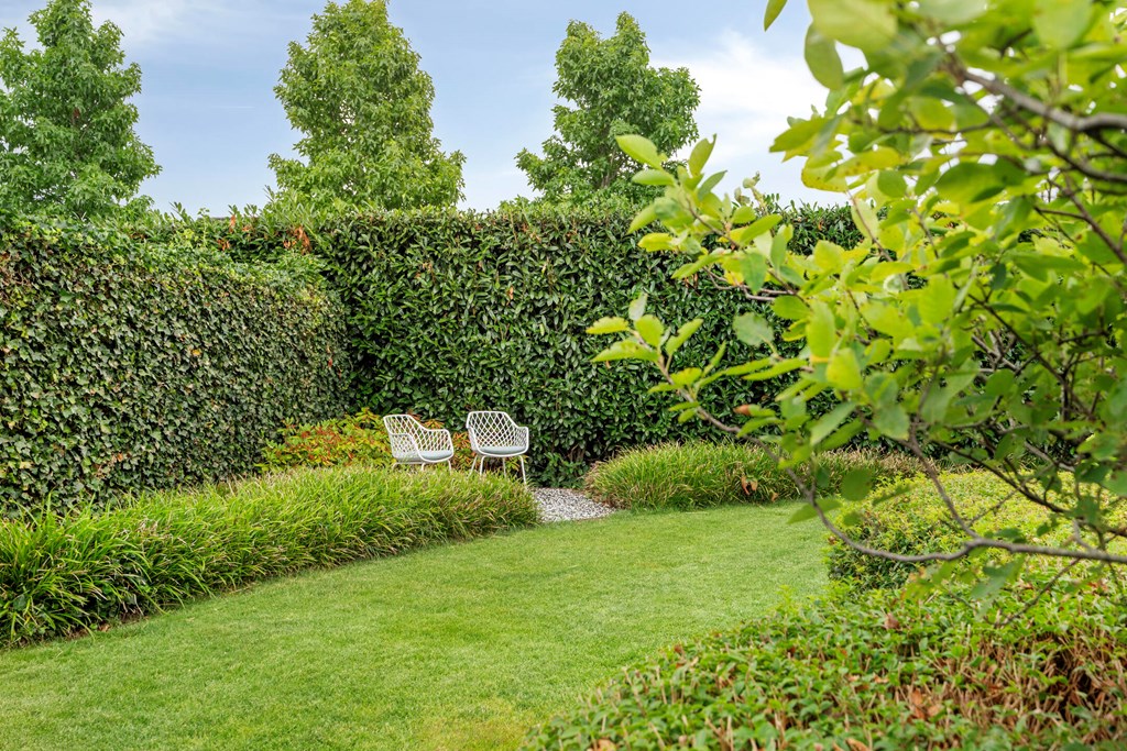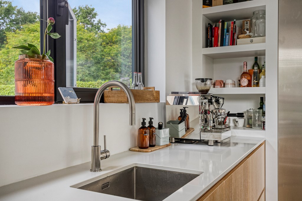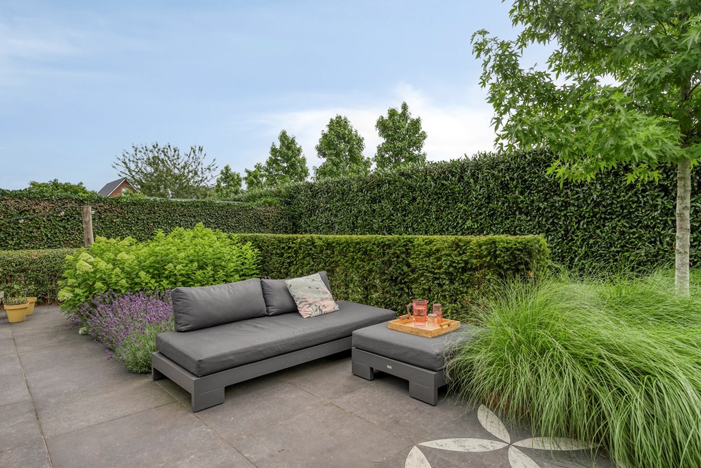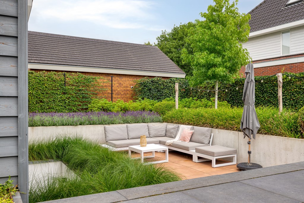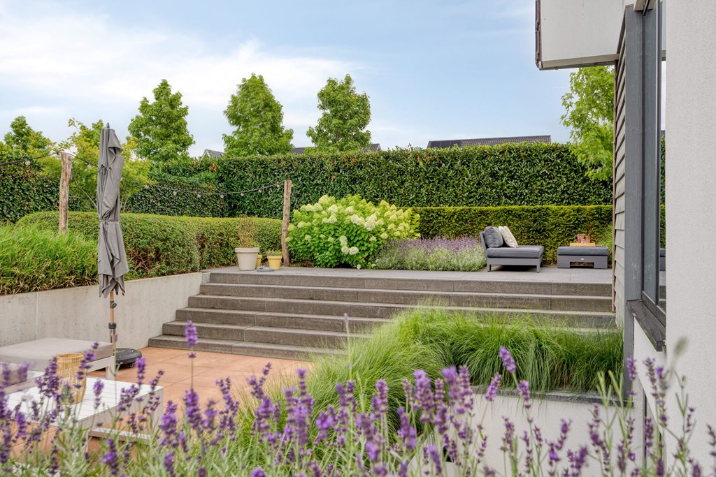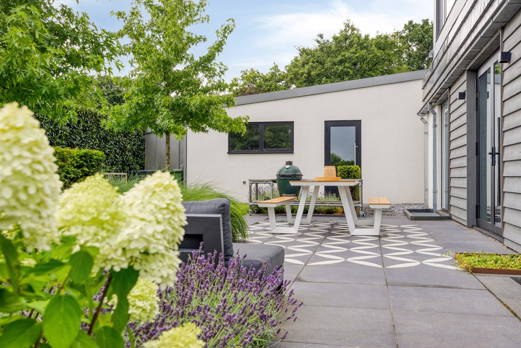 Around the house lies a beautifully landscaped L-shaped garden that offers maximum privacy and peace. From the living and dining rooms you step straight outside to several terraces where you can enjoy the sun. A cozy sunken lounge and the clever layout ensure you’ll always find the perfect place to relax at any time of day. The garden is carefully maintained and truly extends the living pleasure this home provides.