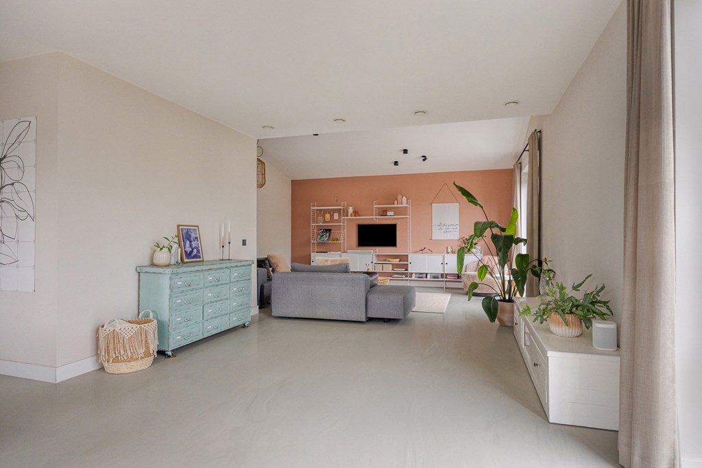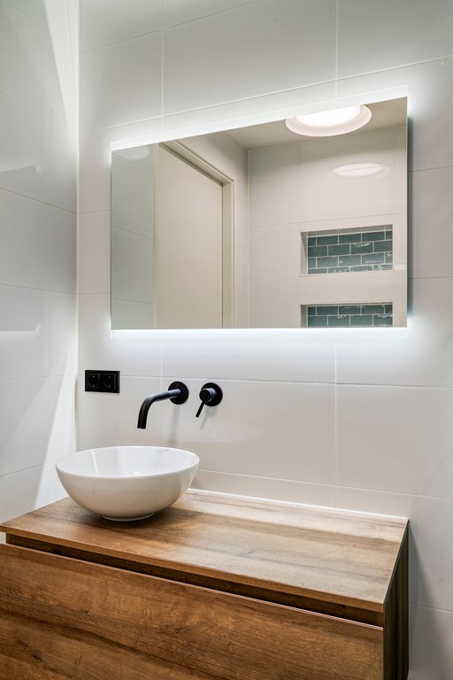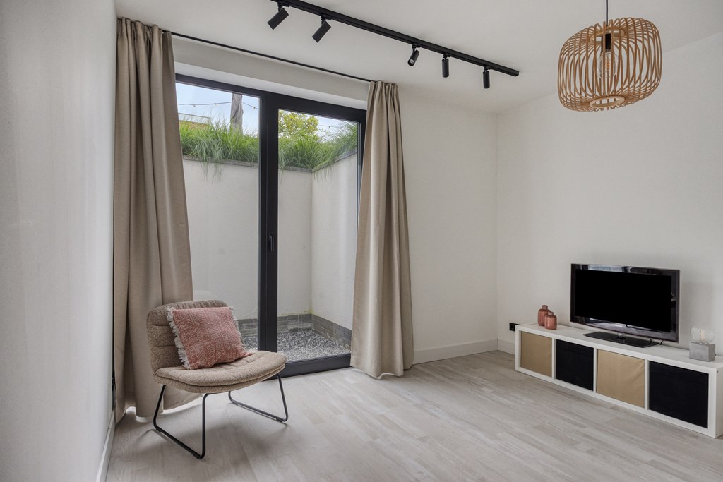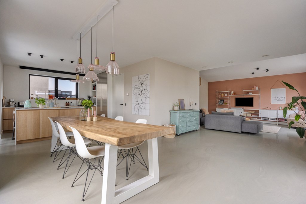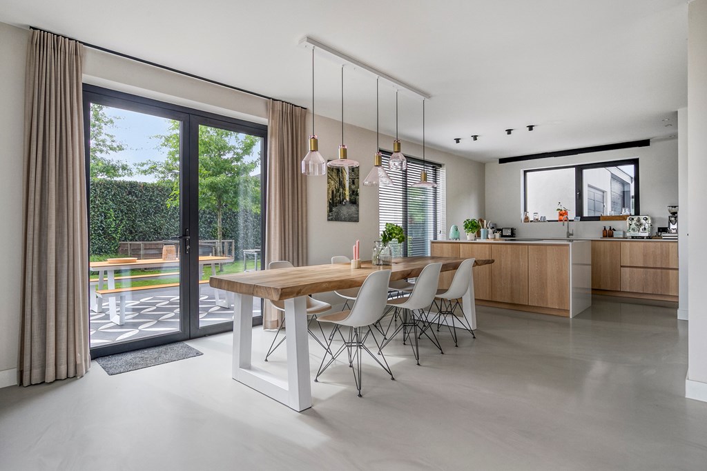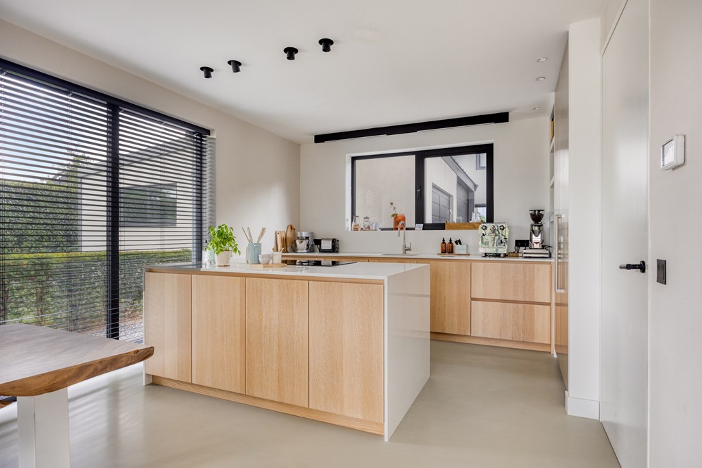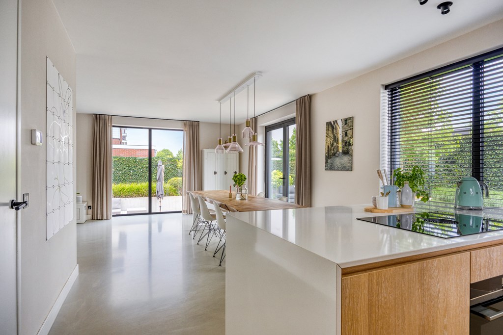 This modern live-in kitchen is the beating heart of the home. With a long countertop and a cooking island, cooking here is a true pleasure. The kitchen is fully equipped with an induction hob with integrated extractor, oven, dishwasher, spacious refrigerator, separate freezer, and sink. The high-quality finish, combined with practical storage in drawers and cabinets, gives the kitchen a luxurious look.
